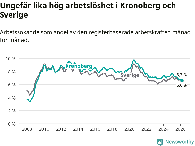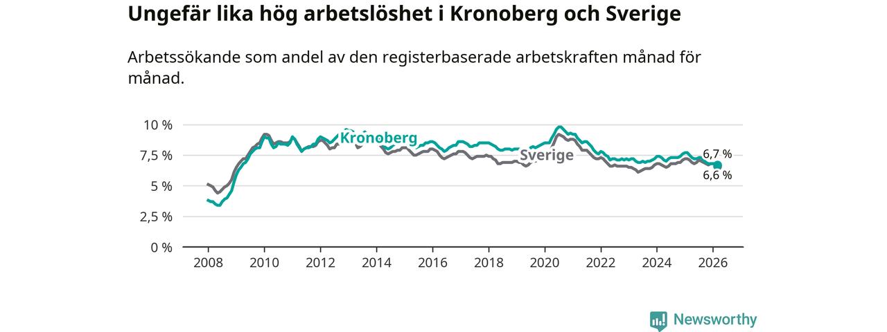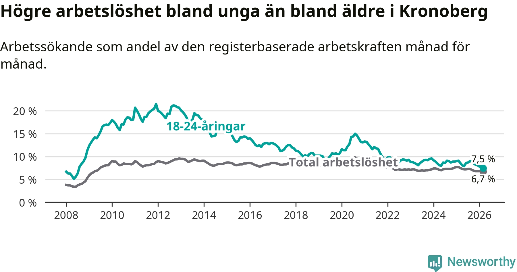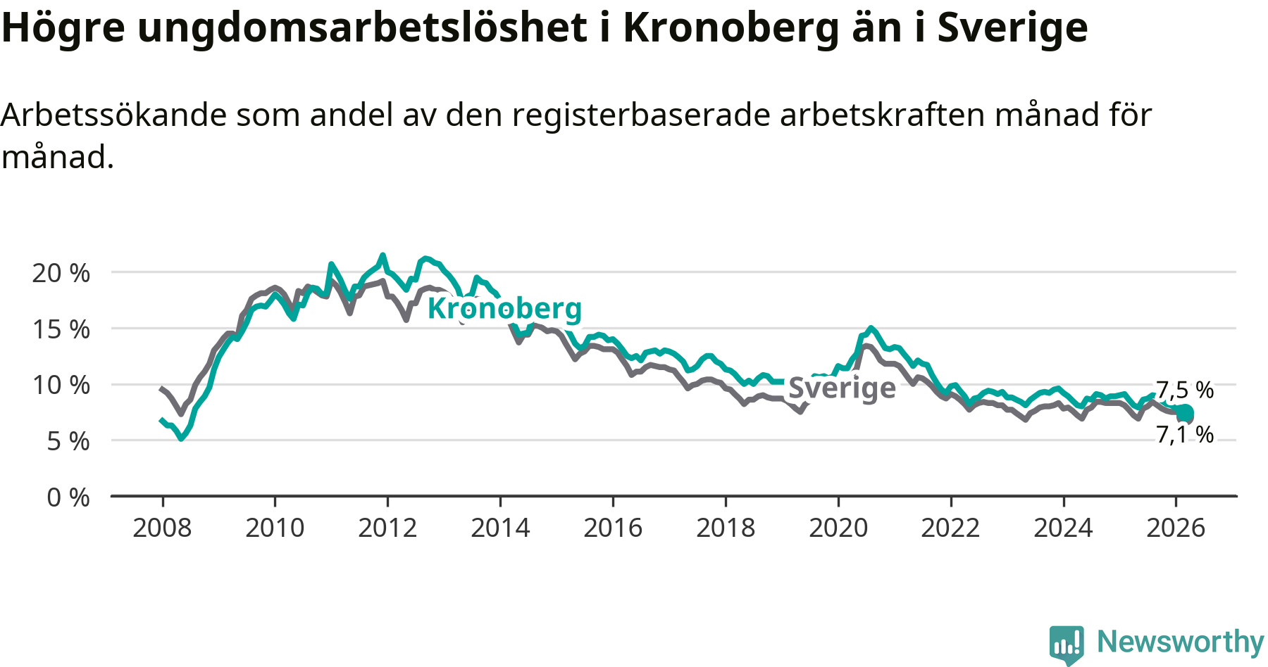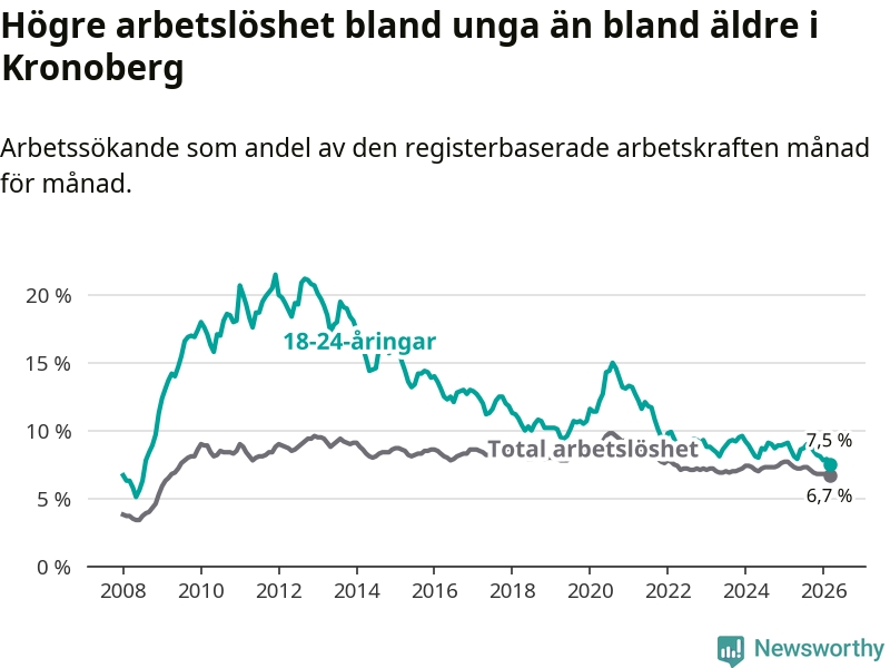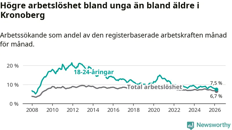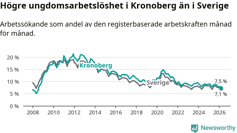 Medan Kronoberg har ungefär samma total arbetslöshet som Sverige, ligger ungdomsarbetslösheten 0,4 procentenheter högre i Kronoberg.