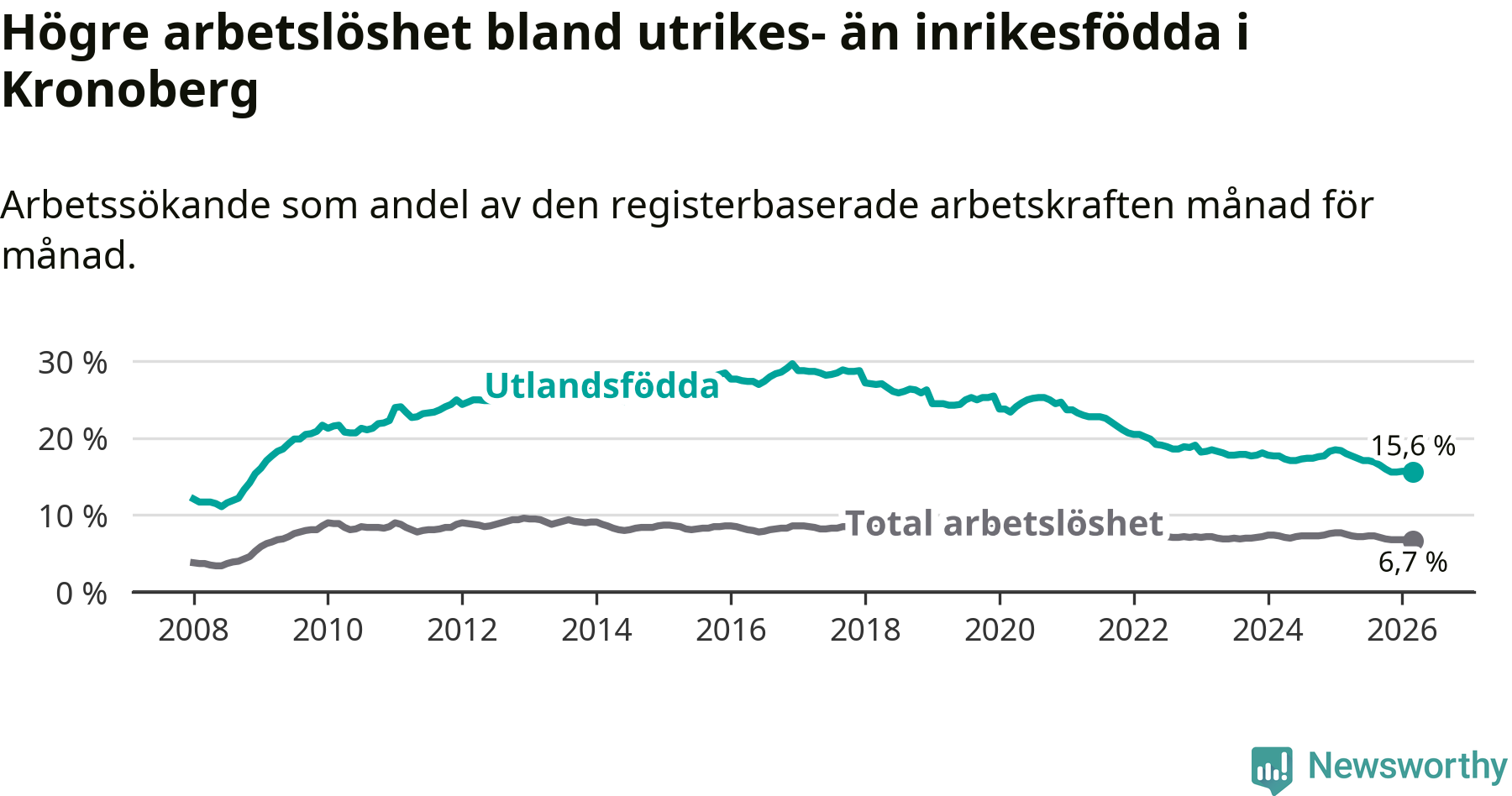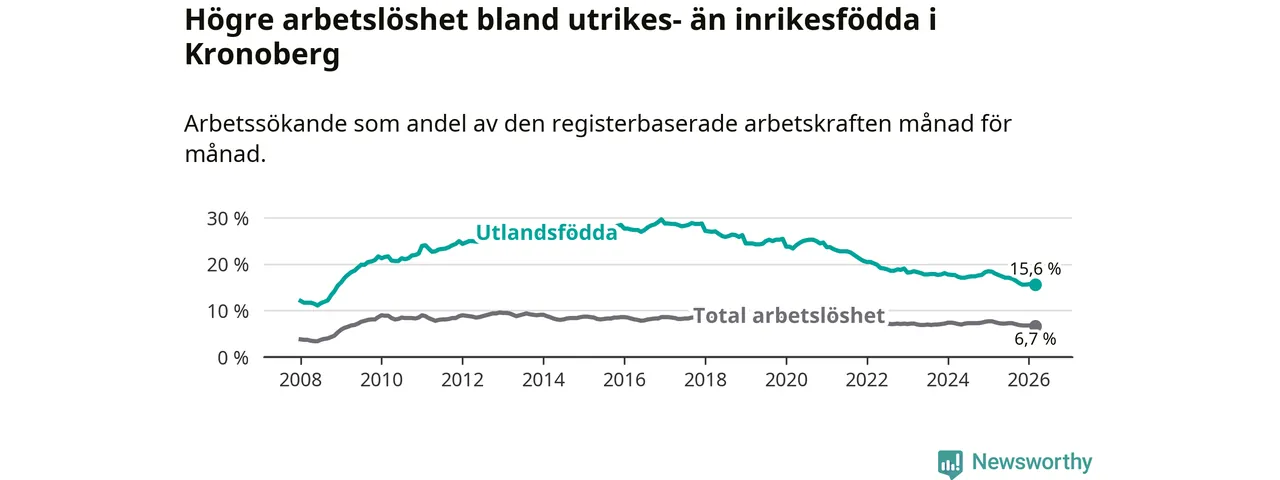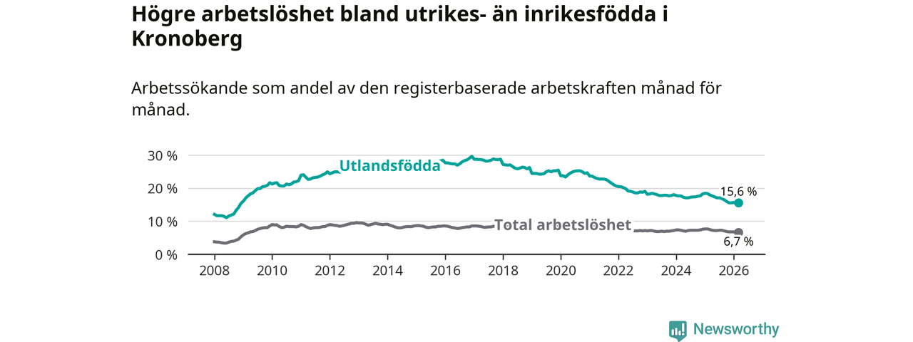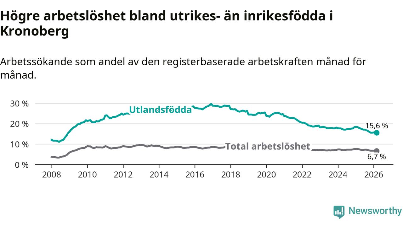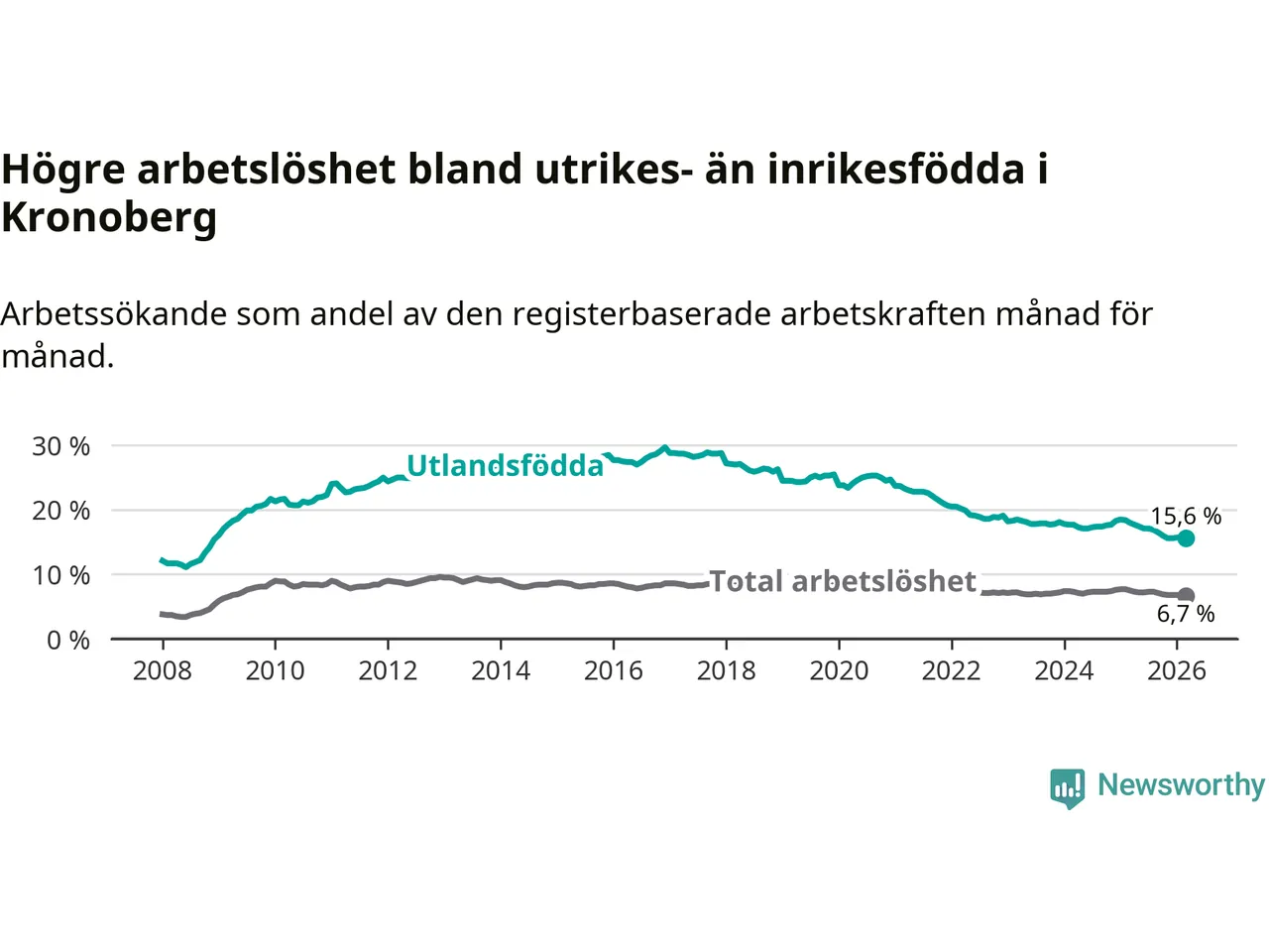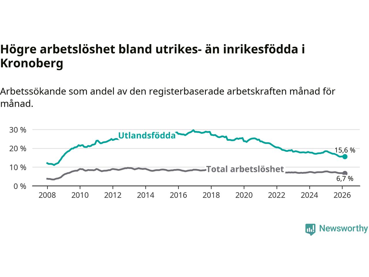 Arbetslösheten bland utlandsfödda var 15,6 procent i Kronoberg under mars månad, motsvarande 4 037 av 25 878 personer. Det är 2,4 procentenheter färre än vid samma tidpunkt i fjol (−547 om man räknar personer). Därmed är de utlandsföddas arbetslöshet lägre än vid samma tidpunkt i fjol för nionde månaden i följd. Sedan juni 2025 har arbetslösheten bland utlandsfödda minskat från 17,1 till 15,6 procent.