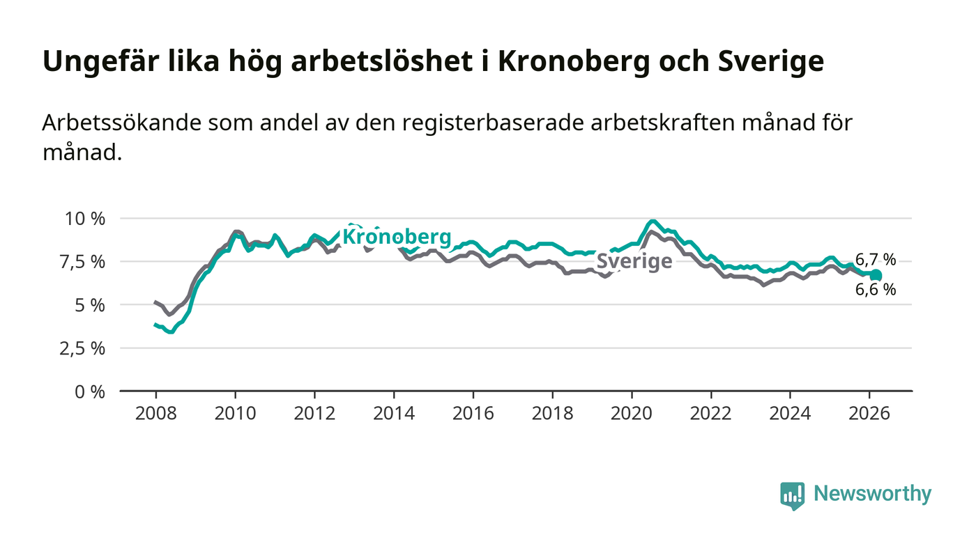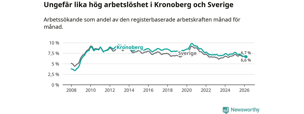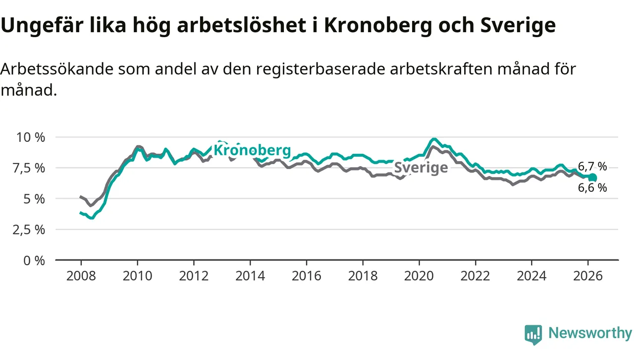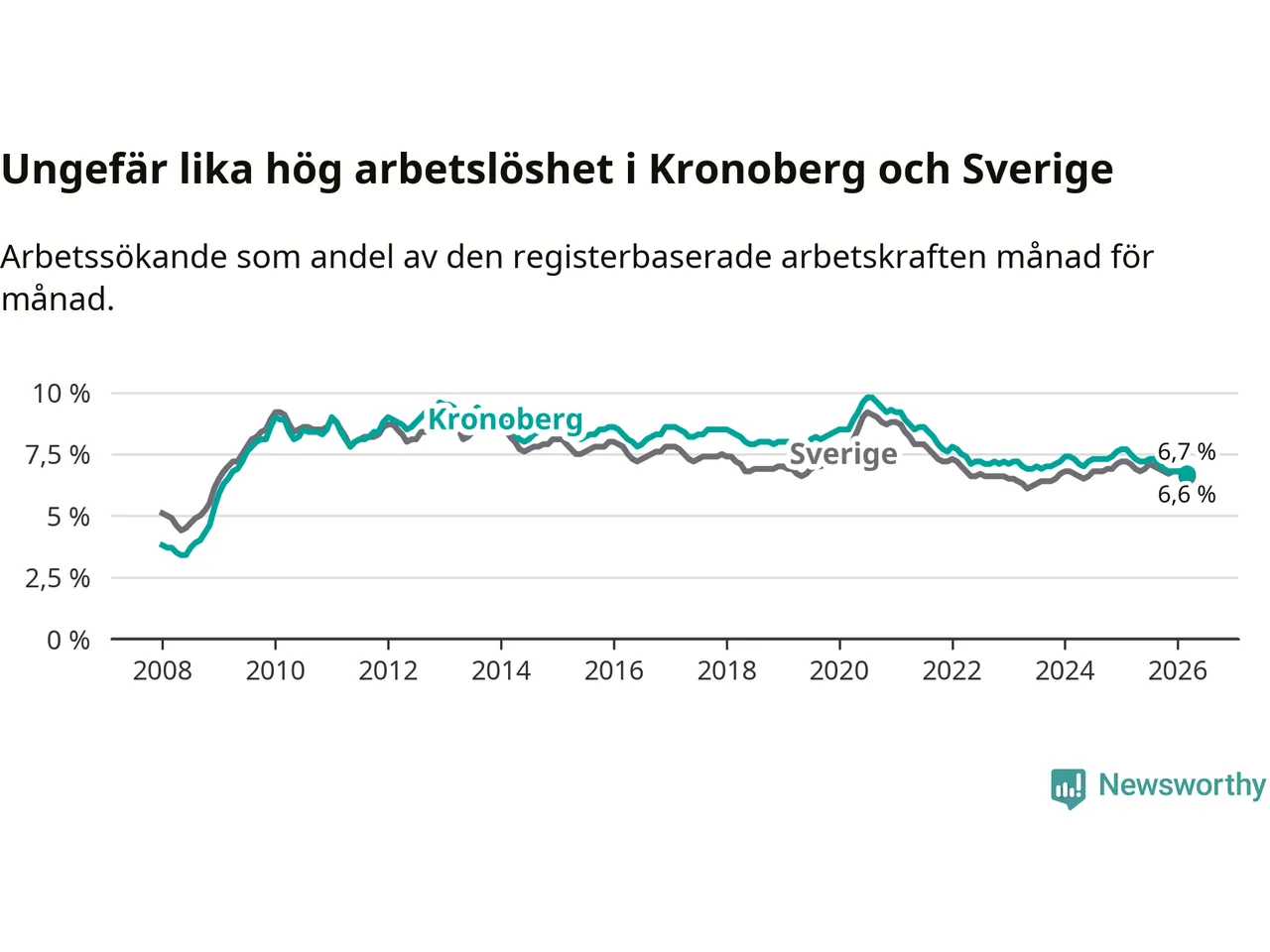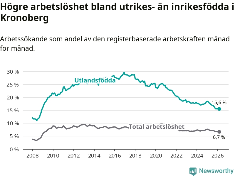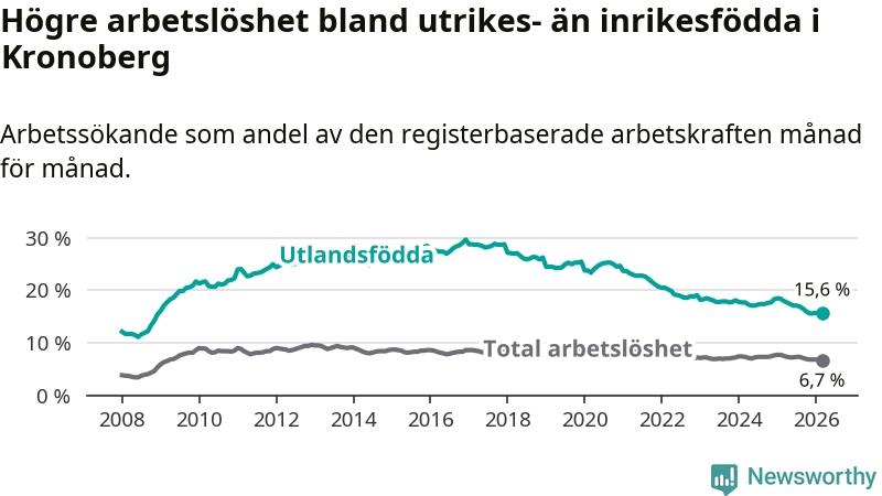 Arbetslösheten bland utlandsfödda var 15,6 procent i Kronoberg under mars månad, motsvarande 4 037 av 25 878 personer. Det är 2,4 procentenheter färre än vid samma tidpunkt i fjol (−547 om man räknar personer). Därmed är de utlandsföddas arbetslöshet lägre än vid samma tidpunkt i fjol för nionde månaden i följd. Sedan juni 2025 har arbetslösheten bland utlandsfödda minskat från 17,1 till 15,6 procent.