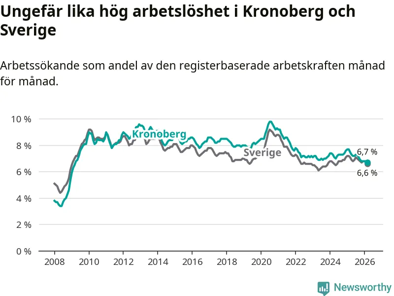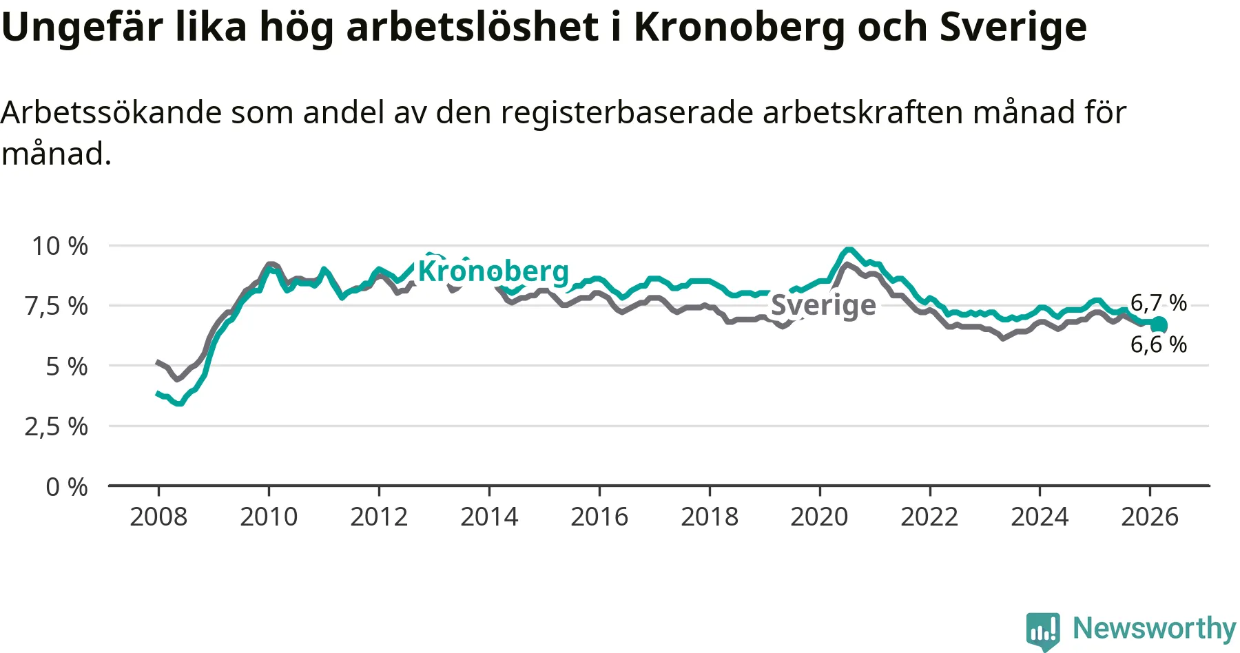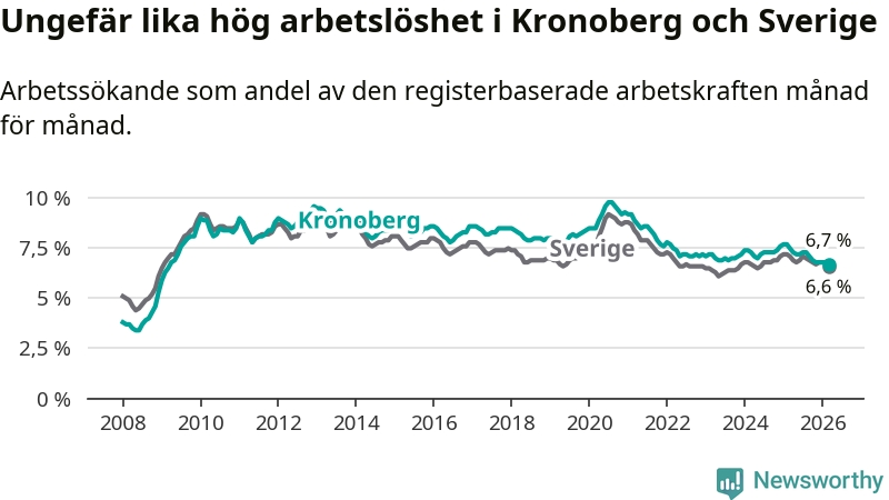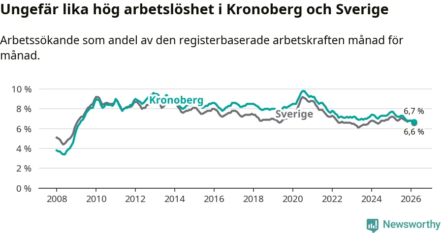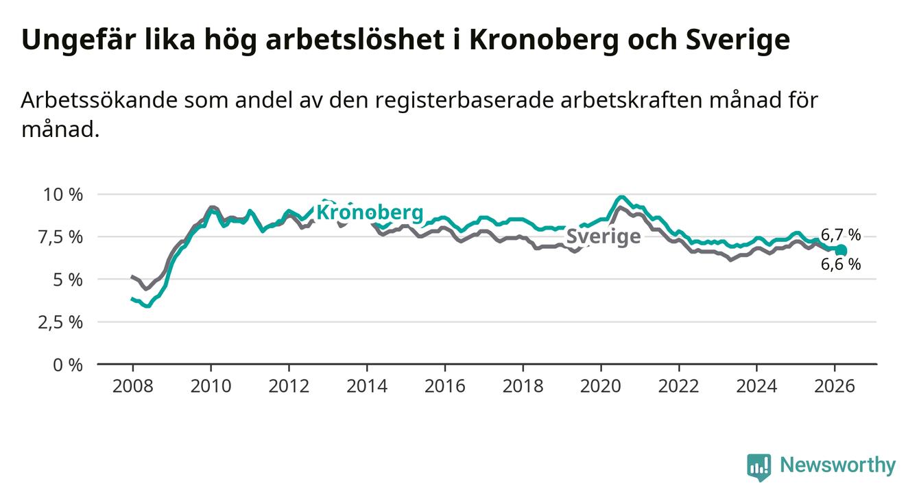 Under mars månad rapporterade Kronobergs län en total arbetslöshet på 6,7 procent. Det är en minskning jämfört med samma tidpunkt i fjol (−0,8 procentenheter). Även i Sverige sjunker arbetslösheten .