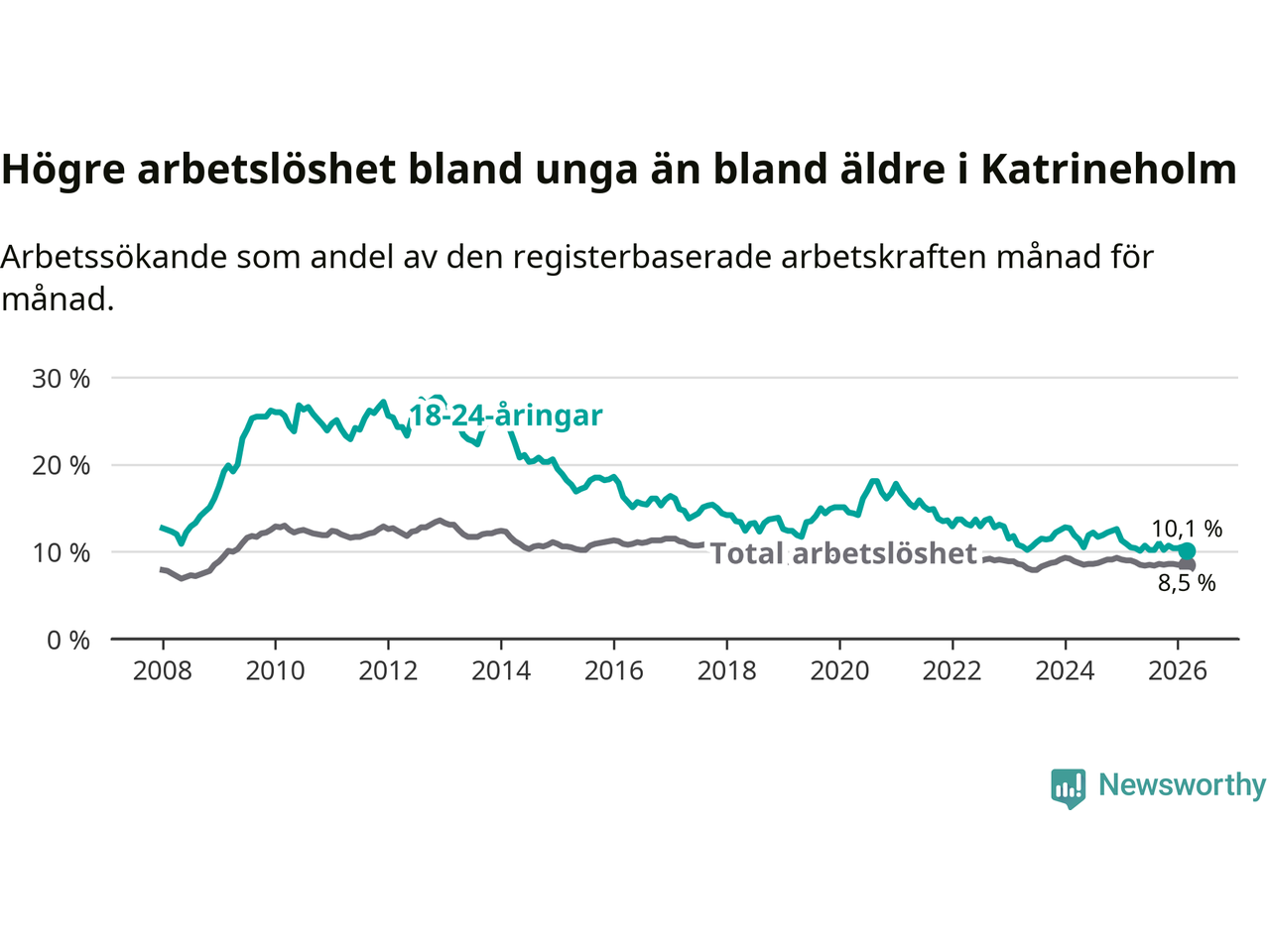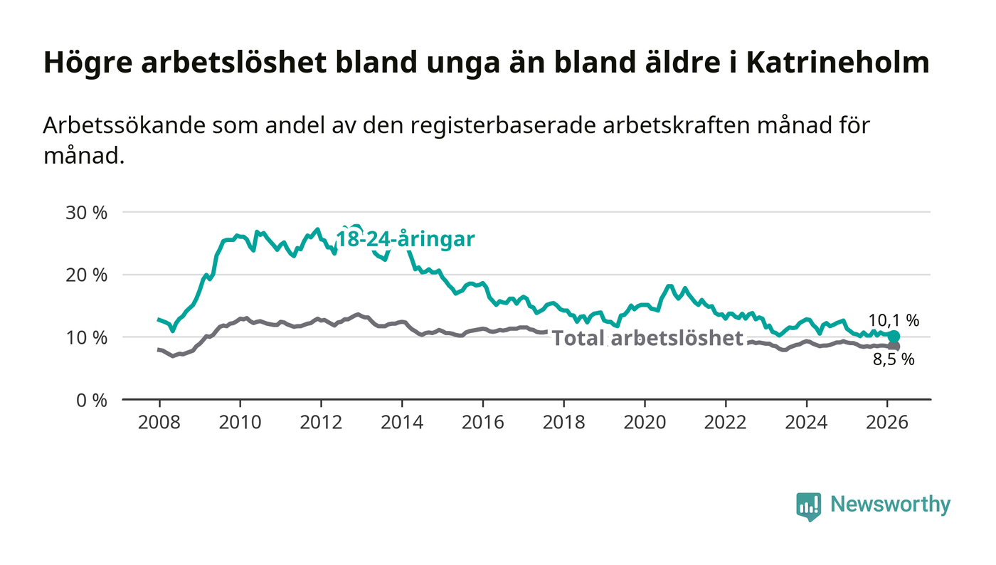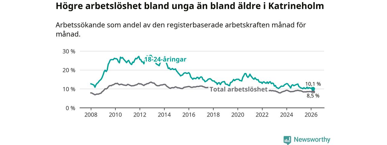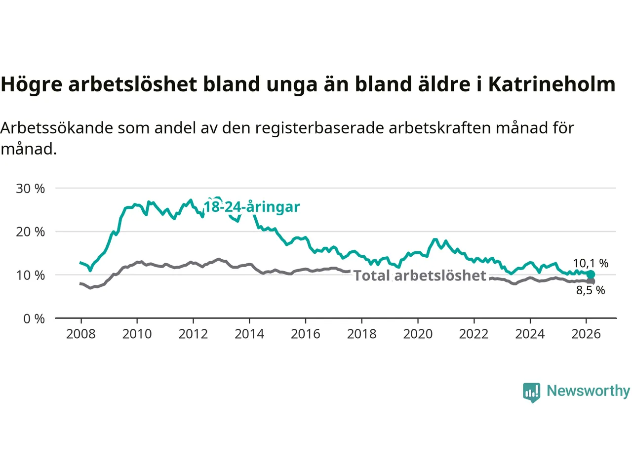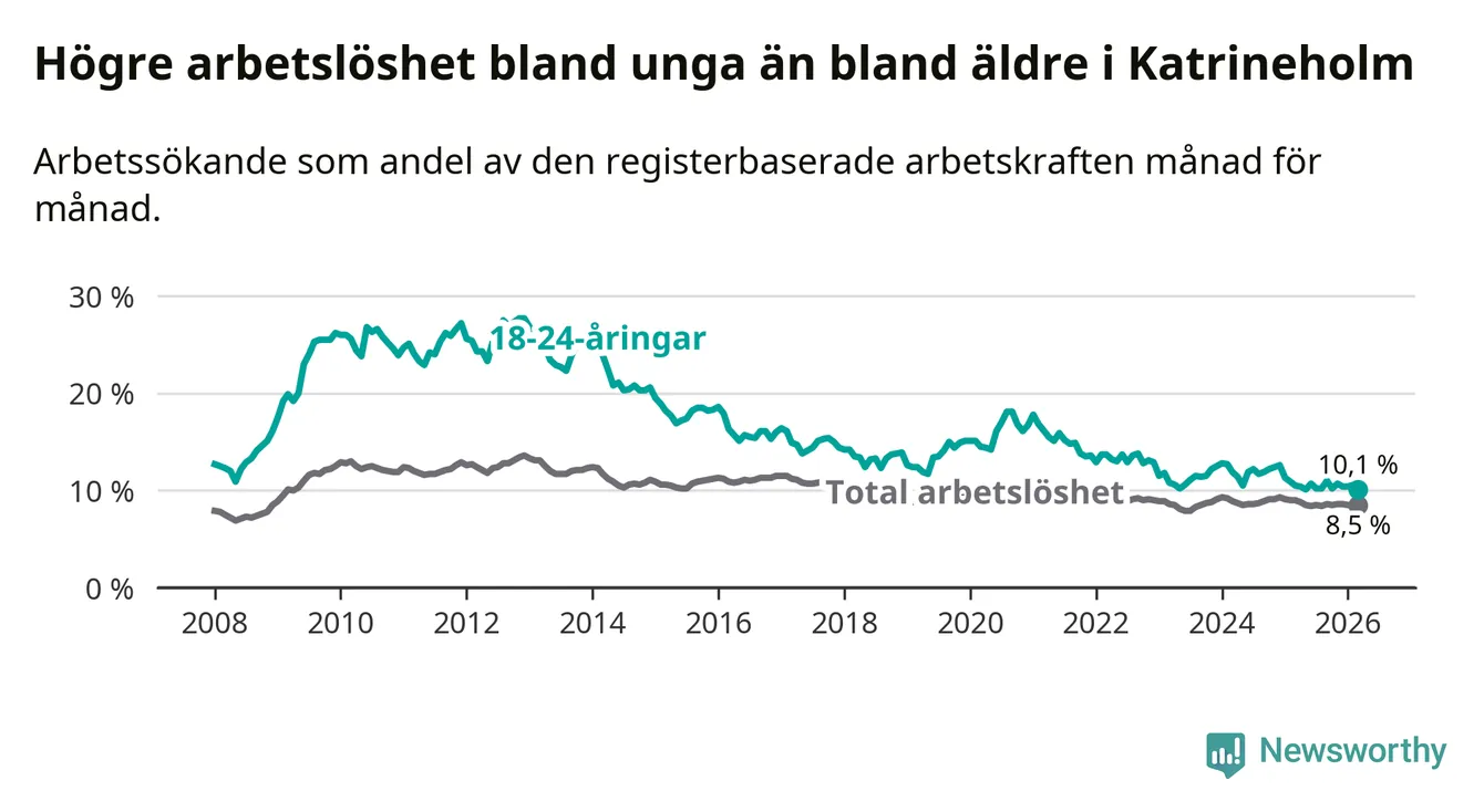 I och med den senaste månadens nedgång har de ungas arbetslöshet i Katrineholm sjunkit 15 månader i följd (ner från 12,6 procent i december 2024 till 10,1 procent nu).