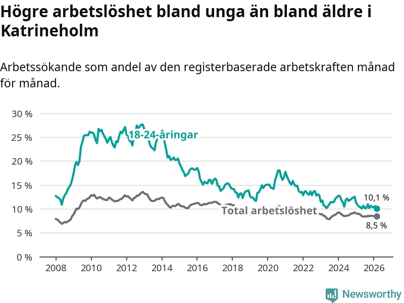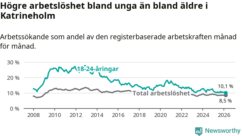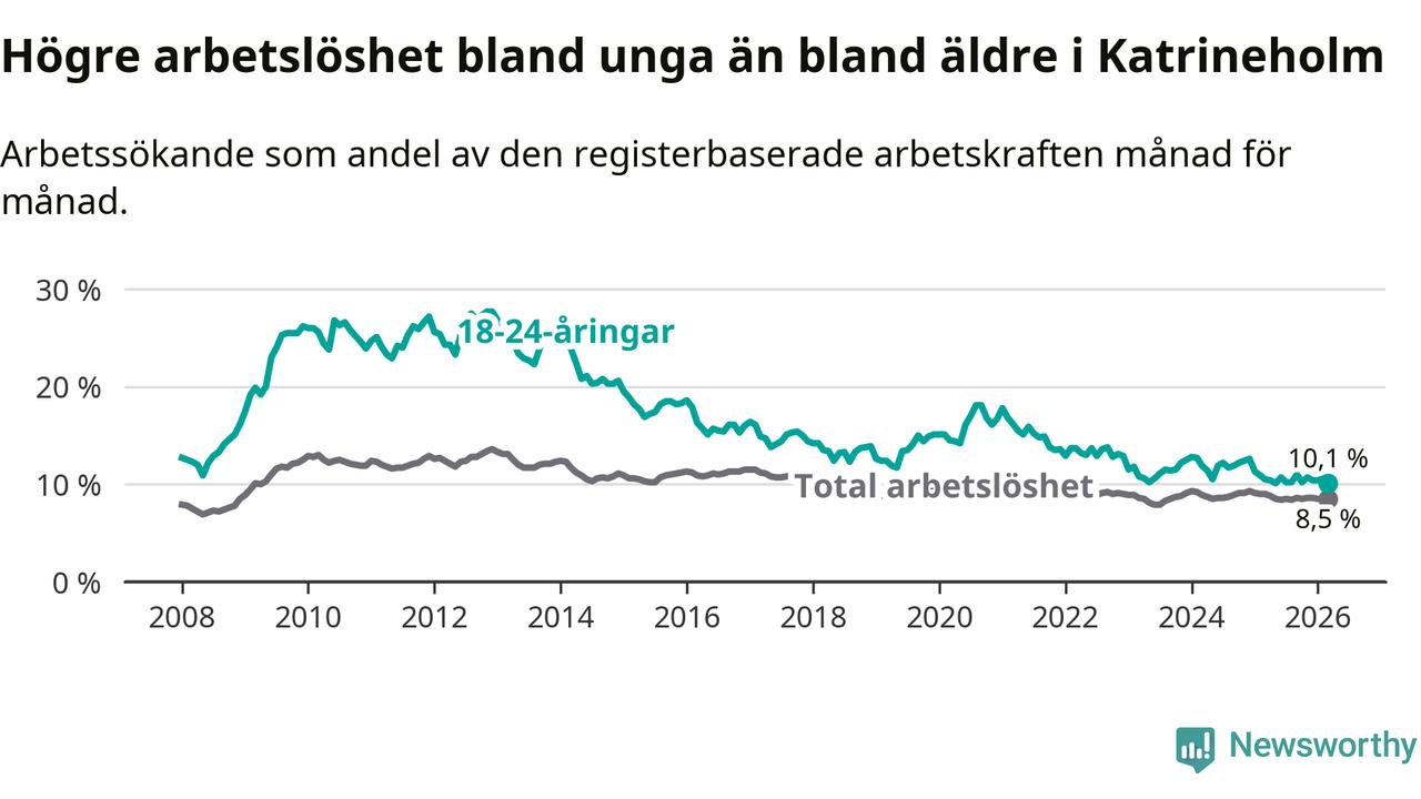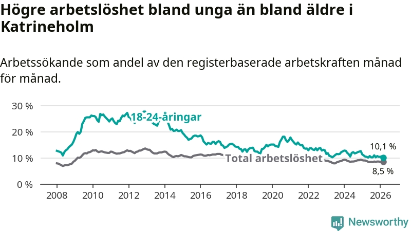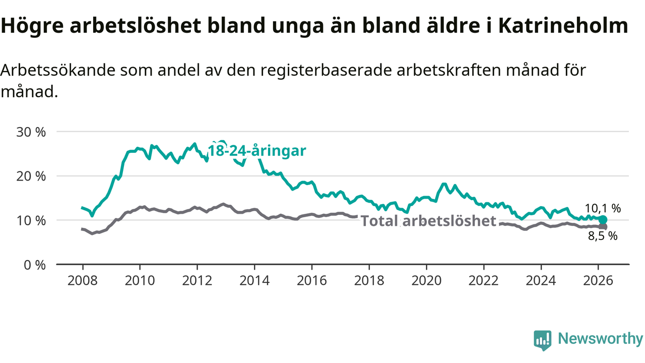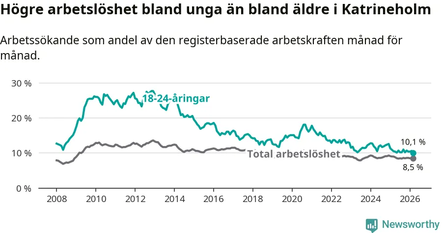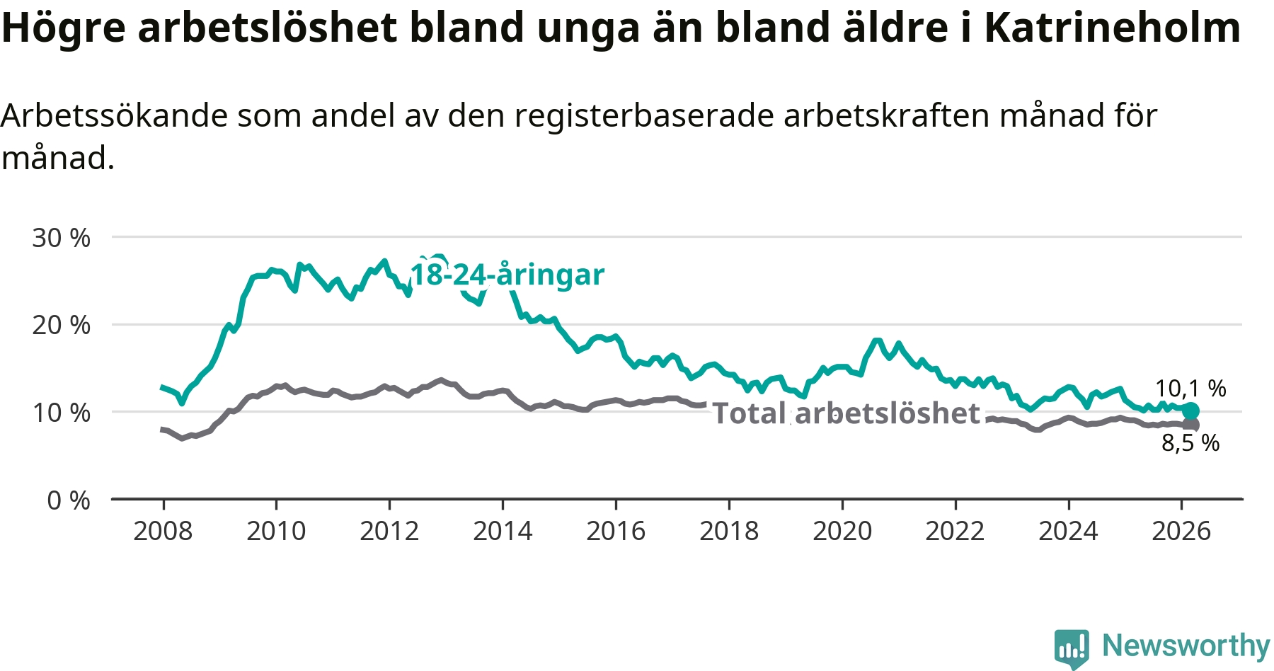 I och med den senaste månadens nedgång har de ungas arbetslöshet i Katrineholm sjunkit 15 månader i följd (ner från 12,6 procent i december 2024 till 10,1 procent nu).