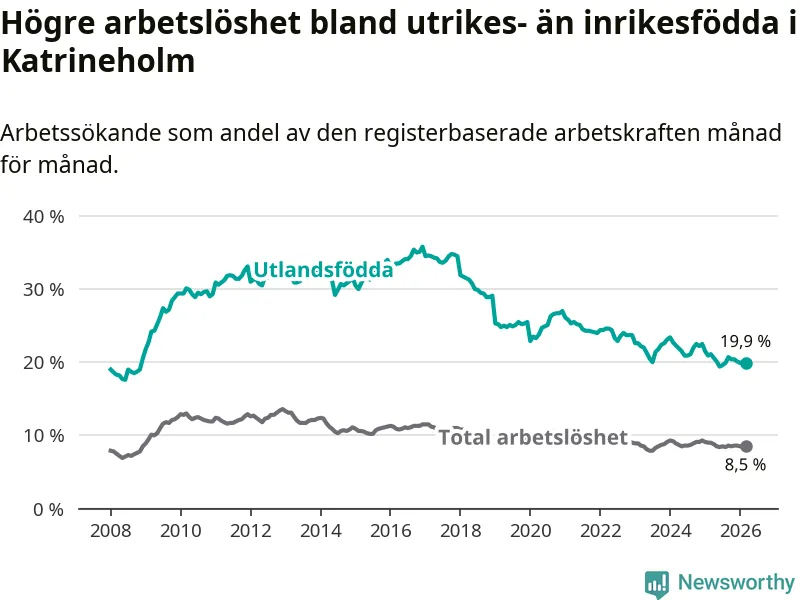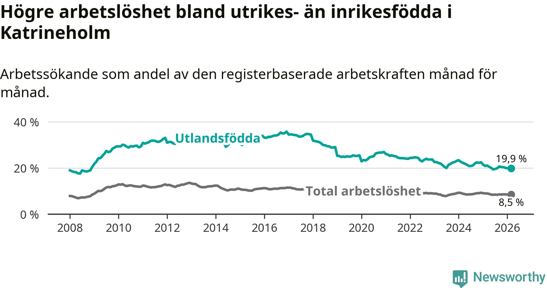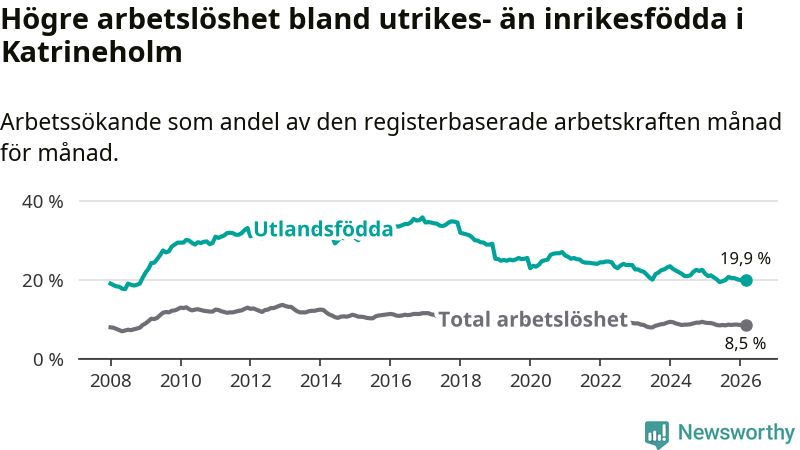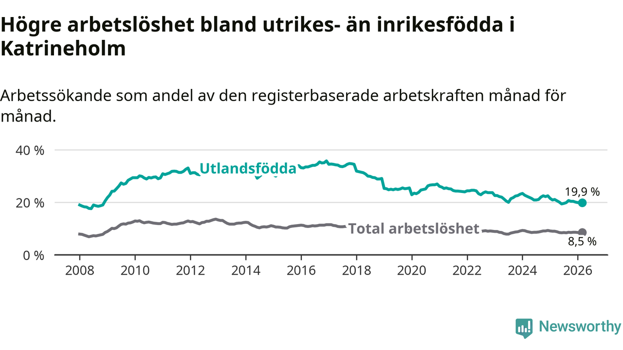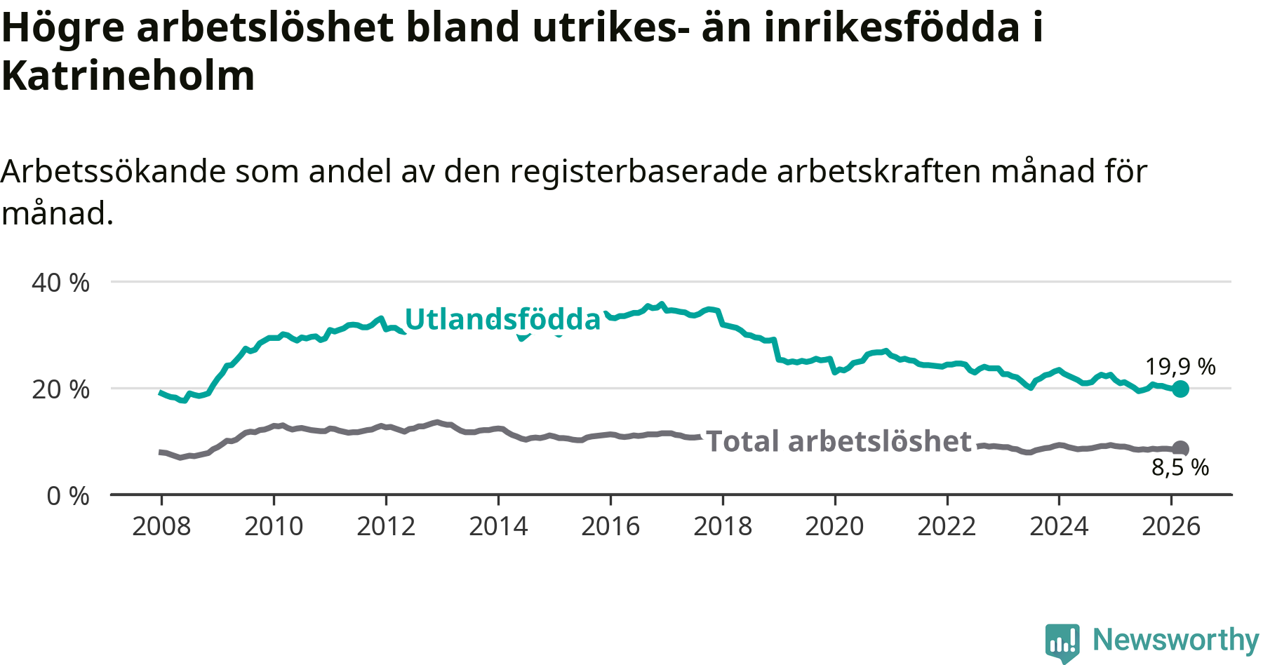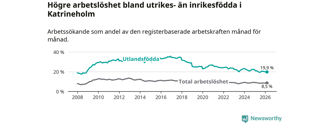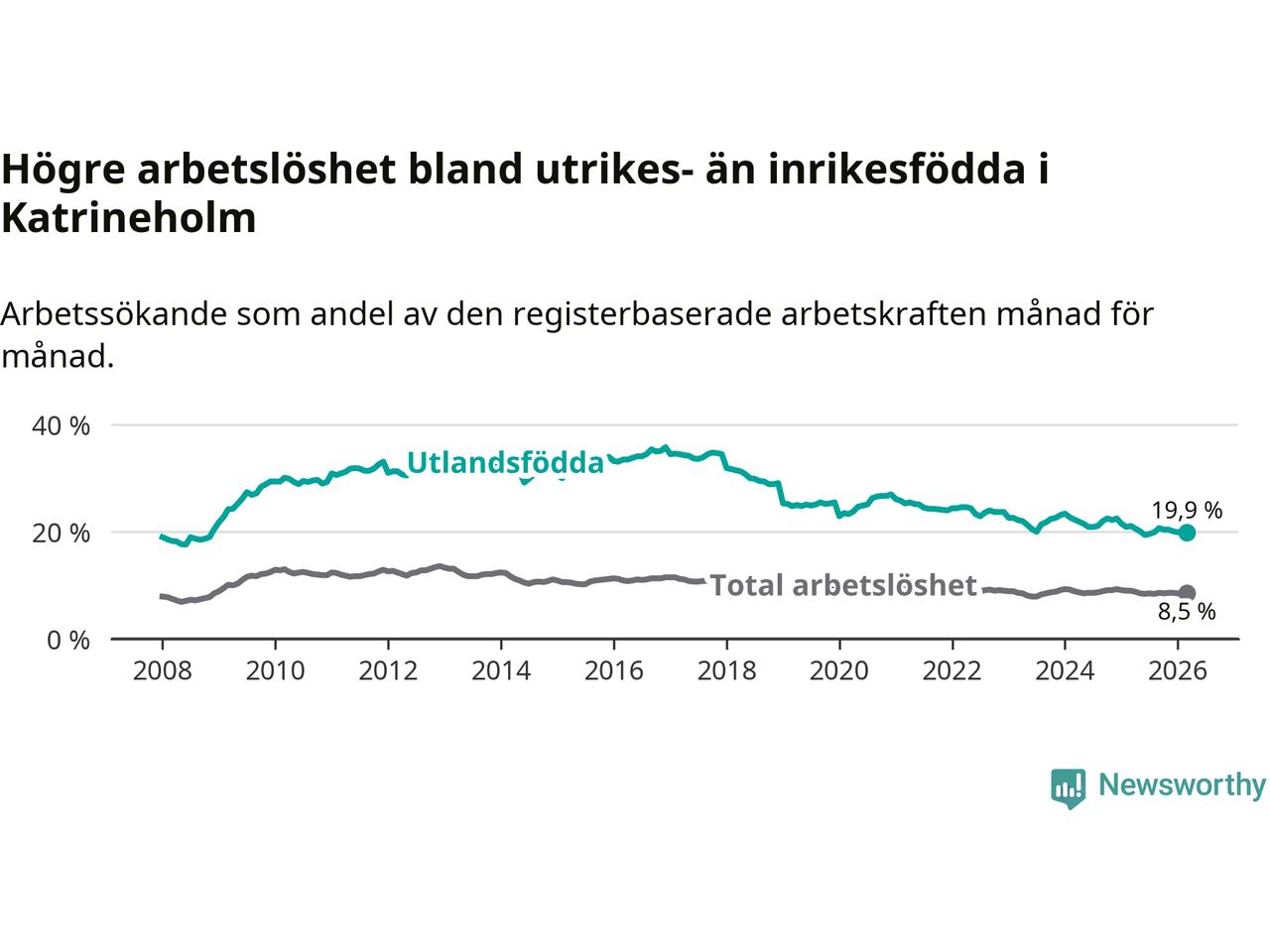 Arbetslösheten bland utlandsfödda var 19,9 procent i Katrineholm under mars månad, motsvarande 771 av 3 874 personer. Det är 1,2 procentenheter färre än vid samma tidpunkt i fjol (−37 om man räknar personer). Därmed är de utlandsföddas arbetslöshet lägre än vid samma tidpunkt i fjol för 17:e månaden i följd. Sedan oktober 2024 har arbetslösheten bland utlandsfödda minskat från 22,5 till 19,9 procent.