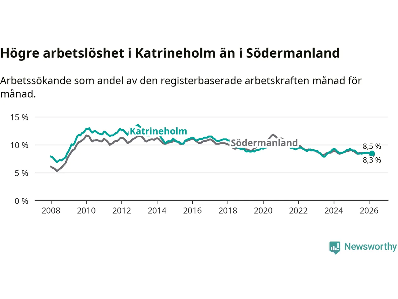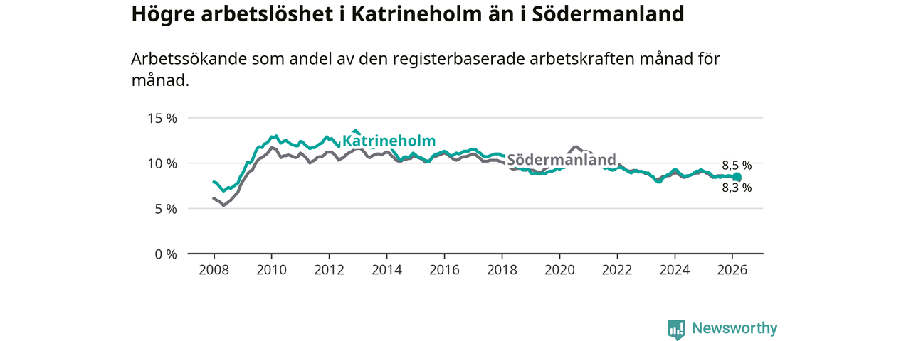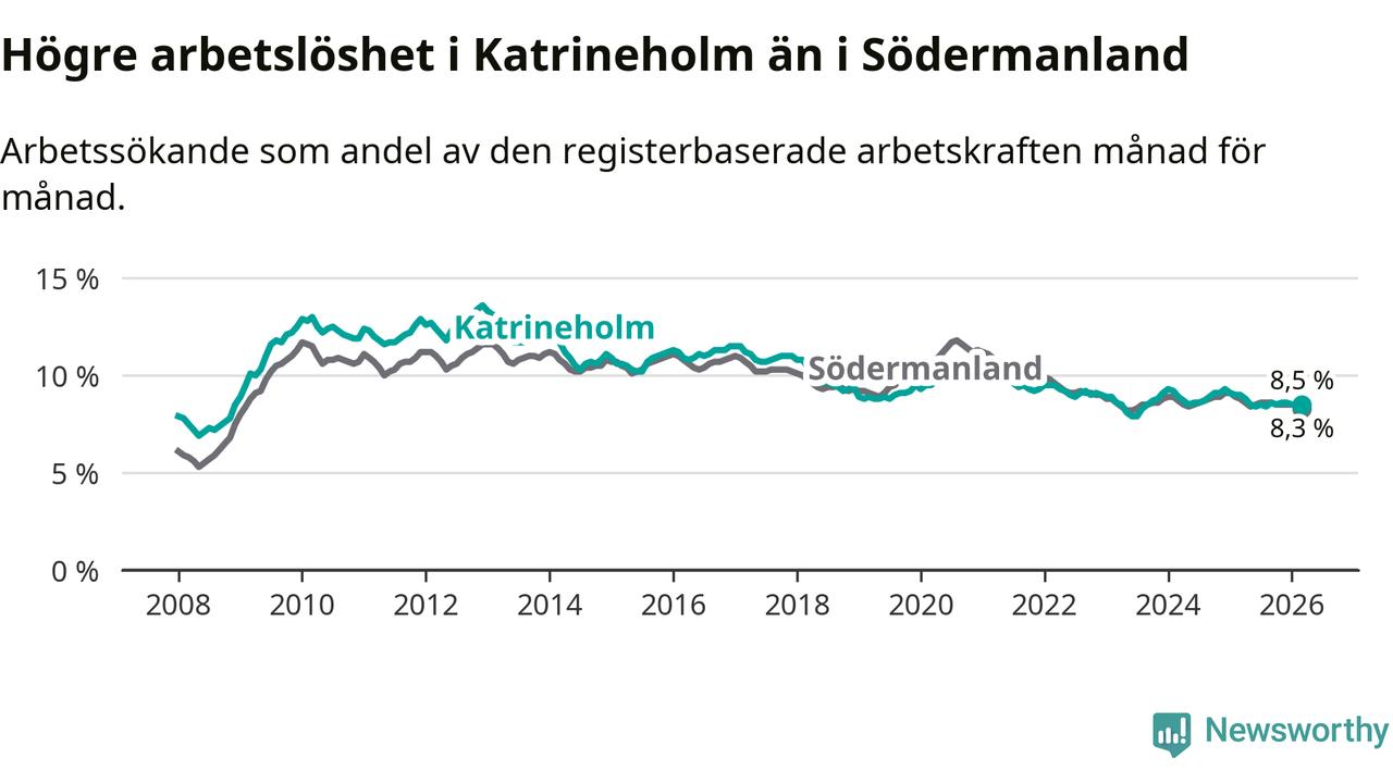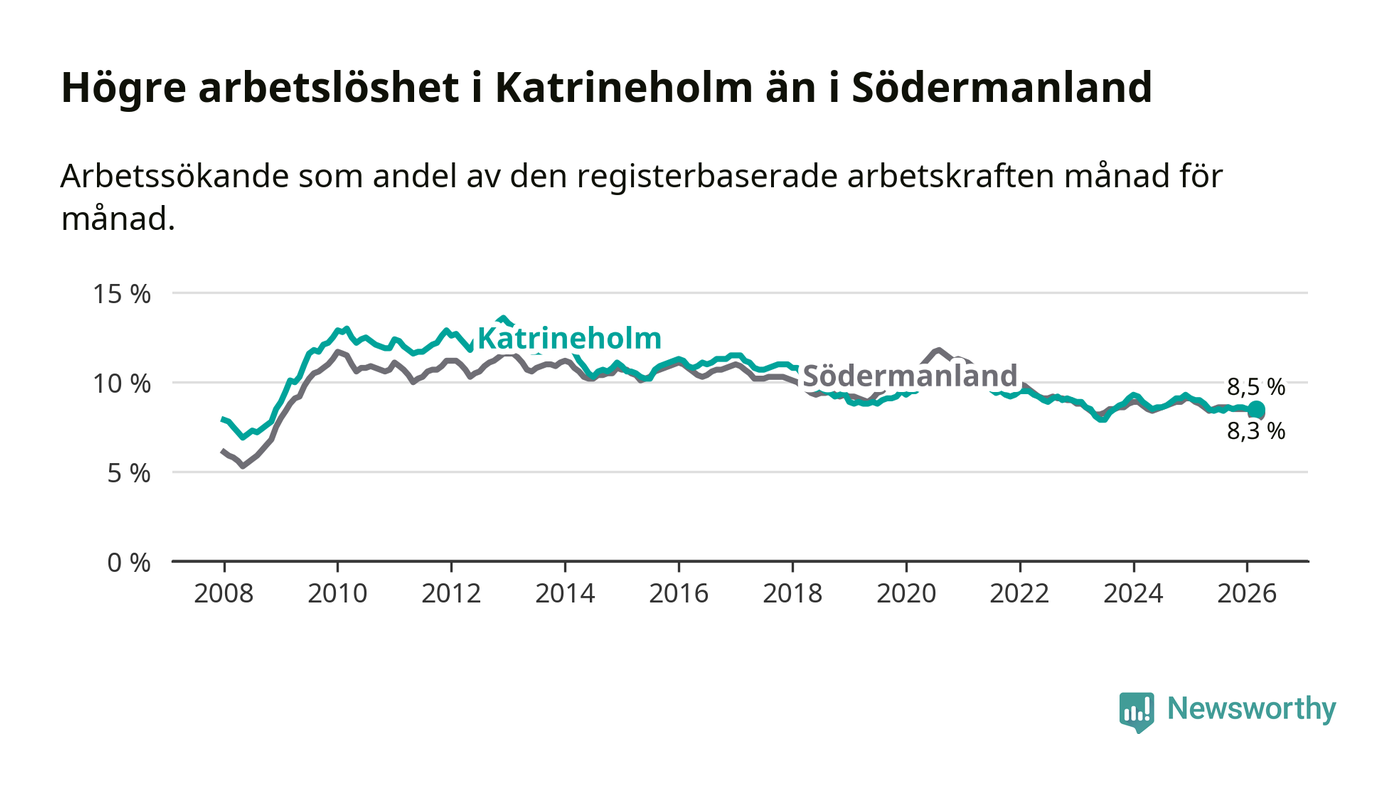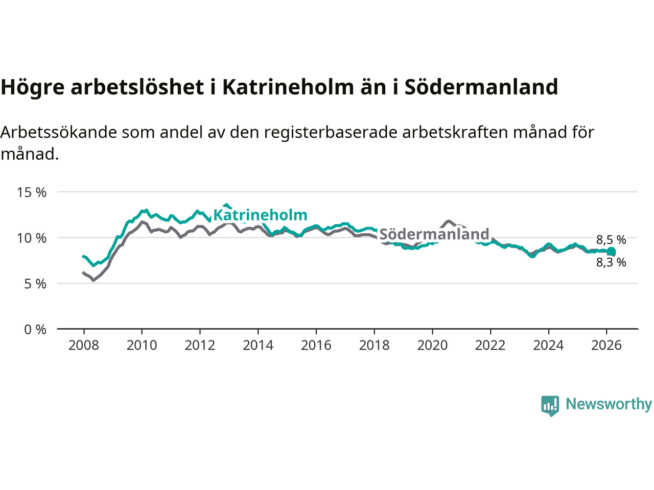 Under mars månad rapporterade Katrineholms kommun en total arbetslöshet på 8,5 procent. Det är en minskning jämfört med samma tidpunkt i fjol (−0,5 procentenheter). Även i Södermanlands län sjunker arbetslösheten .
