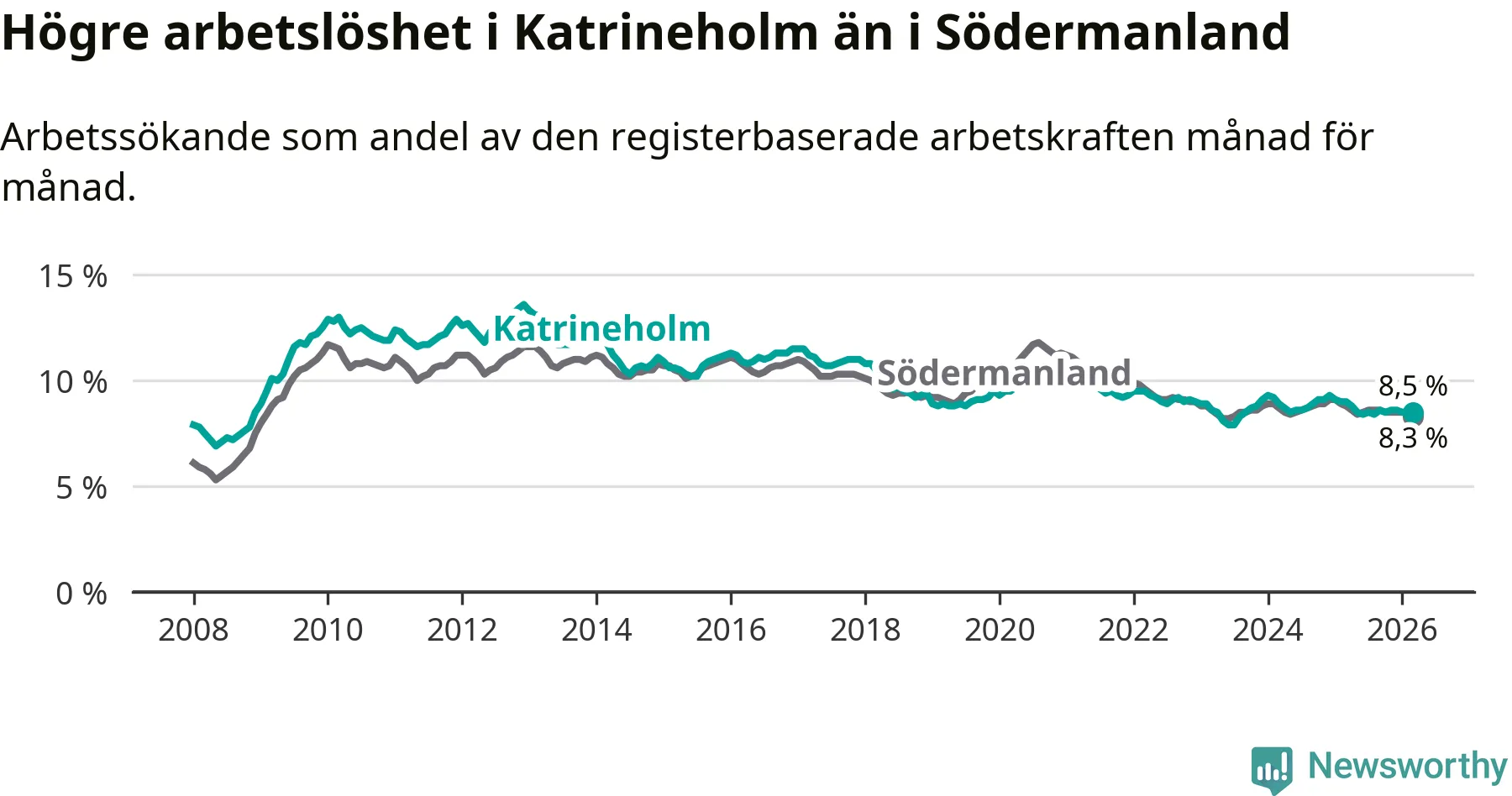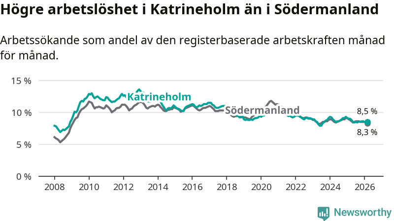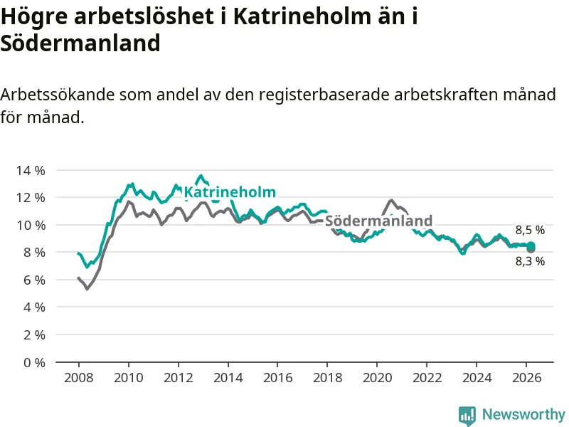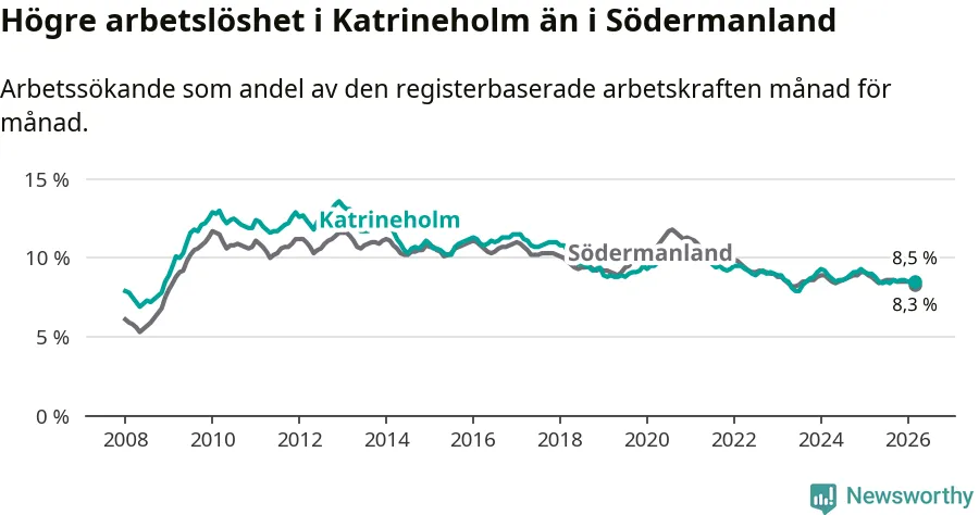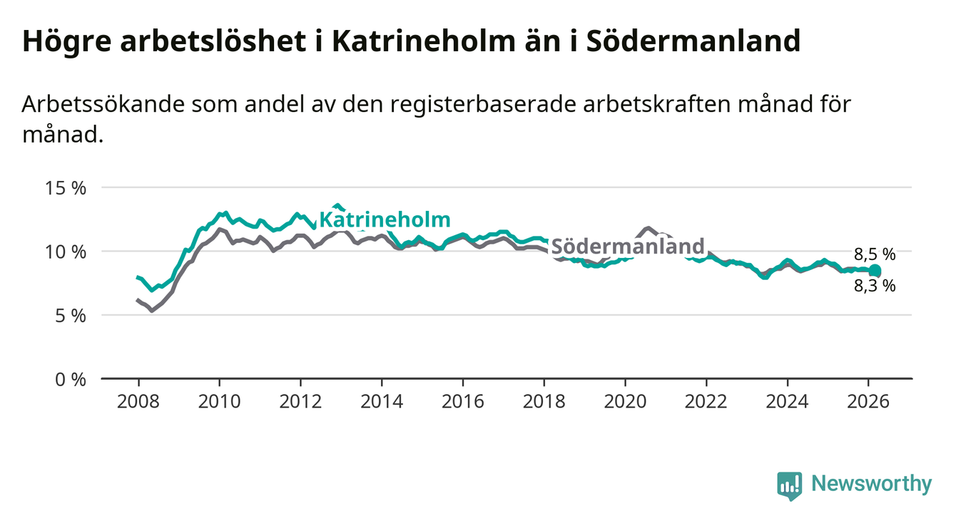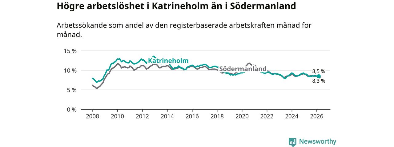Under mars månad rapporterade Katrineholms kommun en total arbetslöshet på 8,5 procent. Det är en minskning jämfört med samma tidpunkt i fjol (−0,5 procentenheter). Även i Södermanlands län sjunker arbetslösheten .