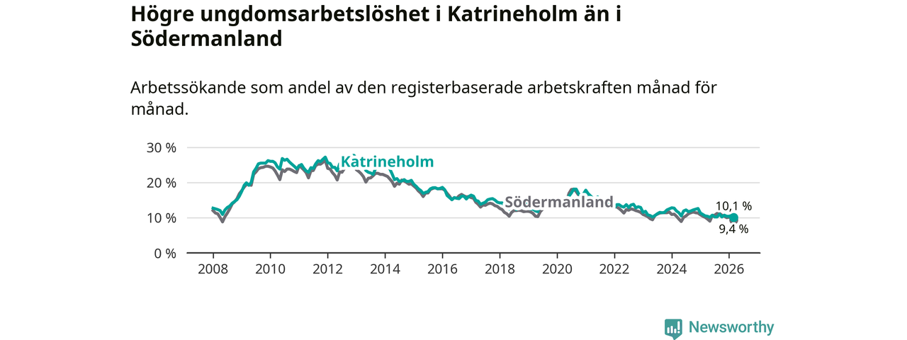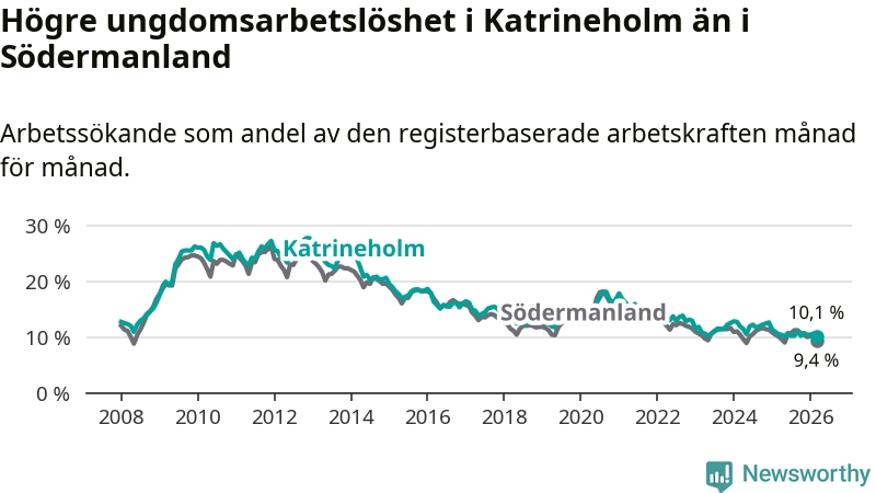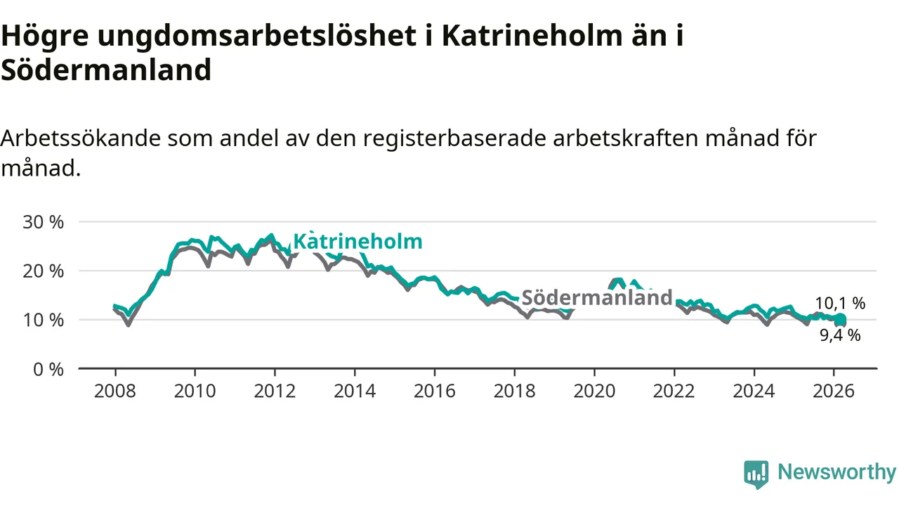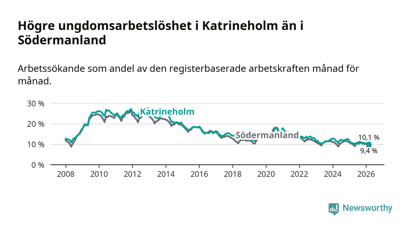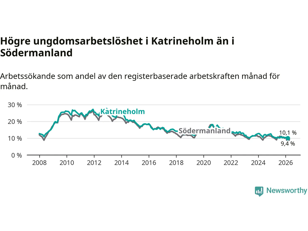 Precis som den totala arbetslösheten ligger ungdomsarbetslösheten i Katrineholm högre än i Södermanland som helhet. Skillnaden mellan kommunen och länet är 0,7 procentenheter.