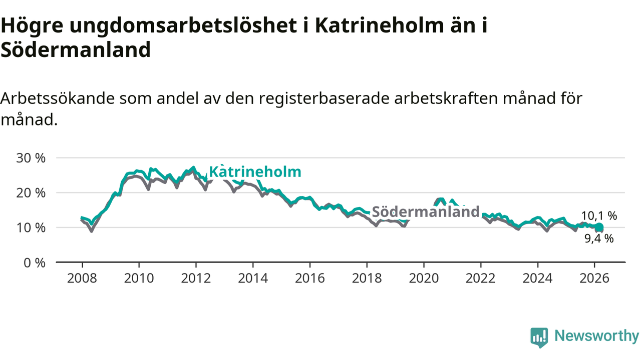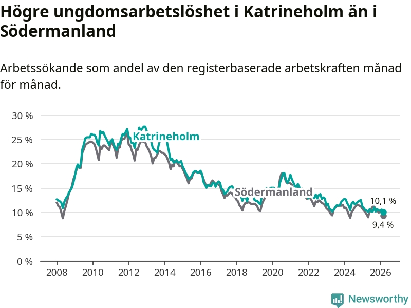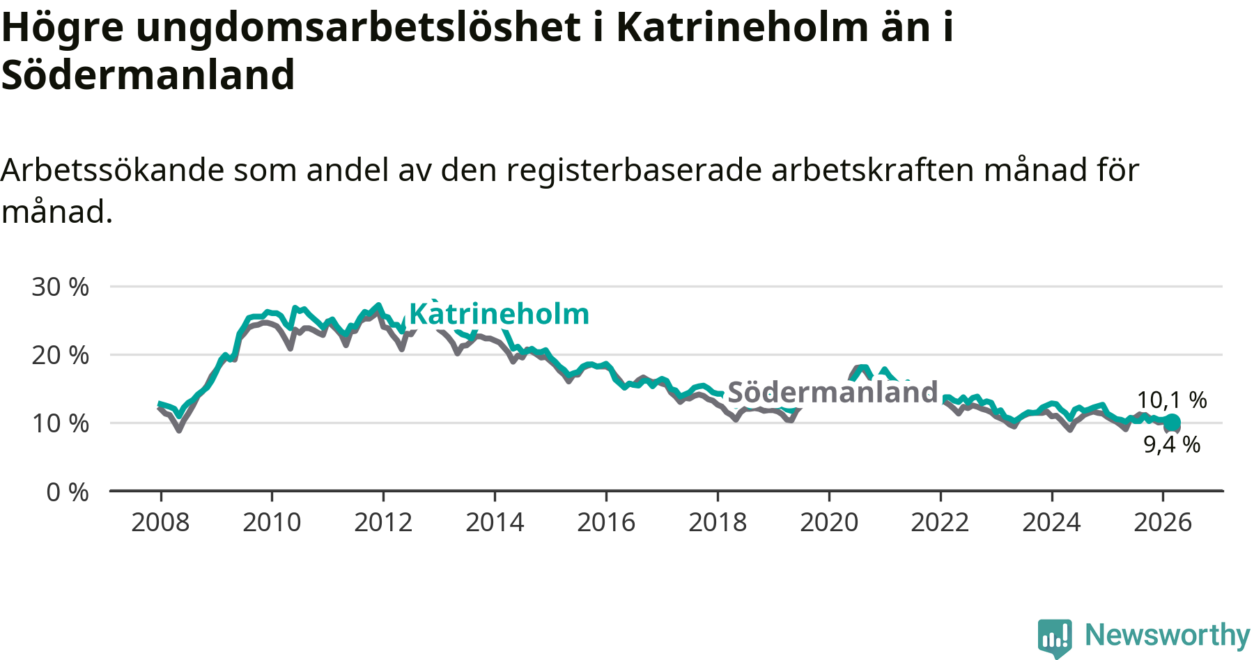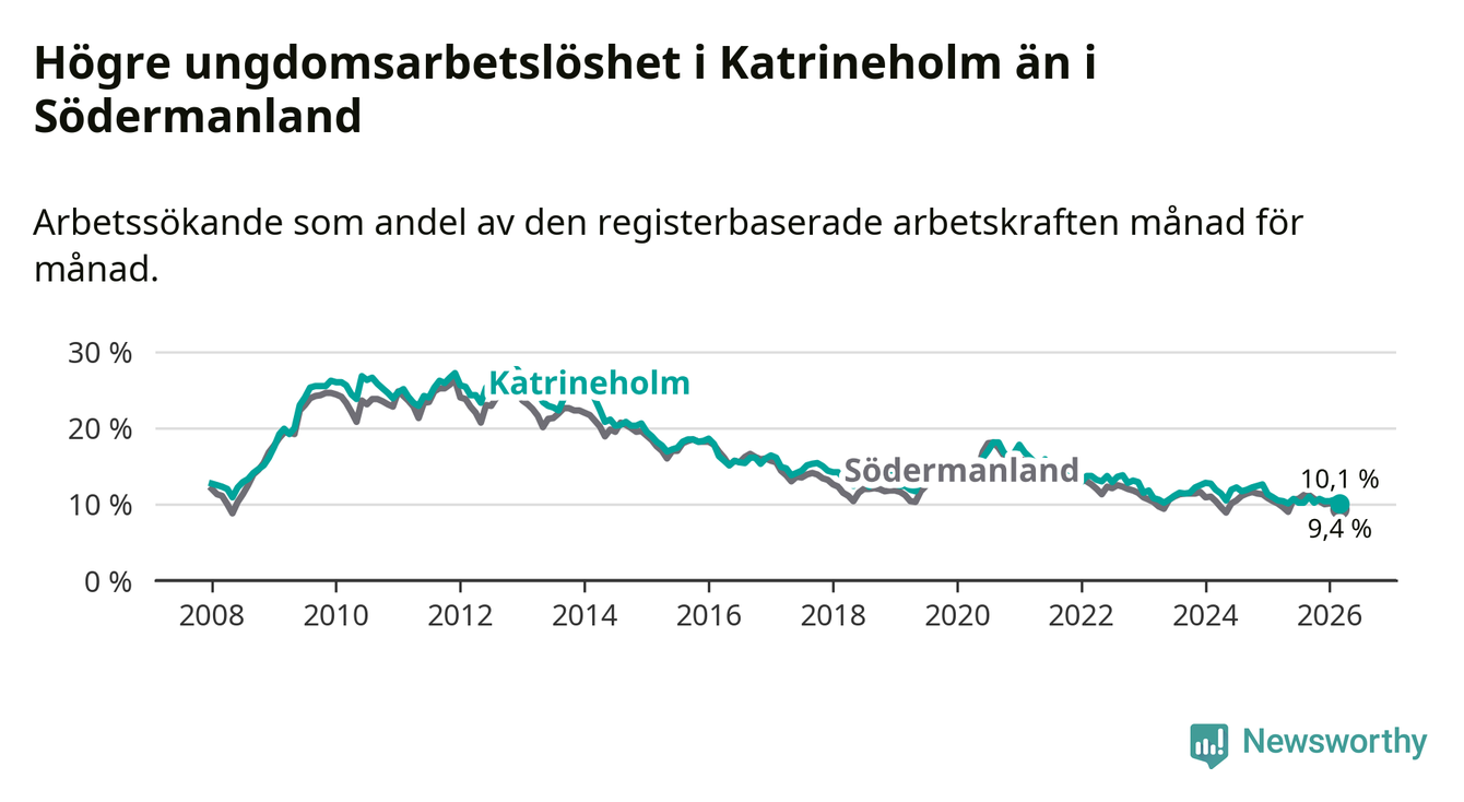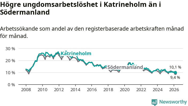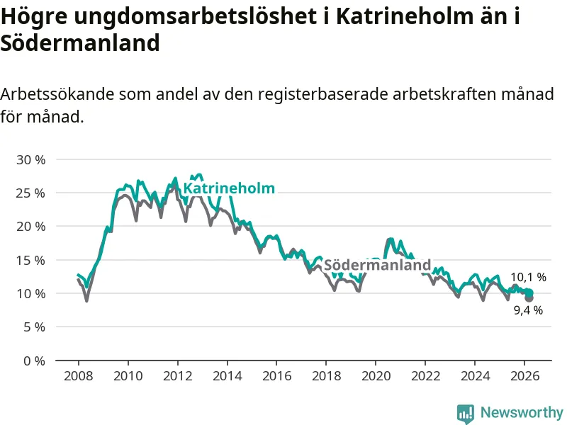 Precis som den totala arbetslösheten ligger ungdomsarbetslösheten i Katrineholm högre än i Södermanland som helhet. Skillnaden mellan kommunen och länet är 0,7 procentenheter.