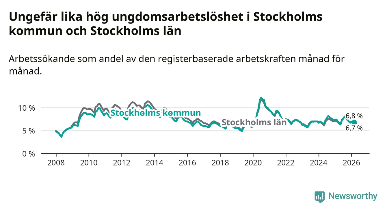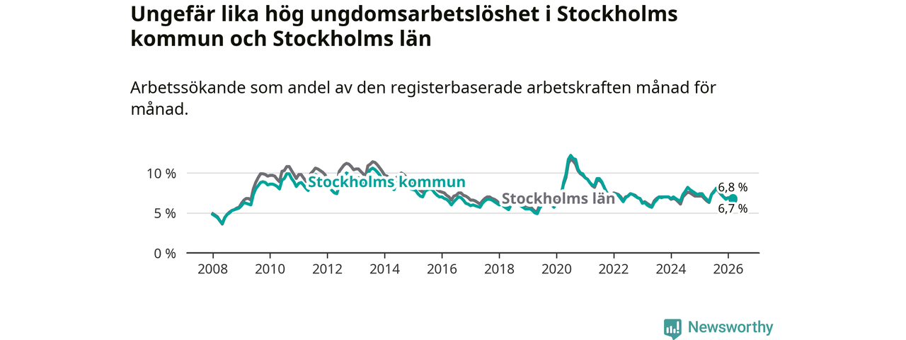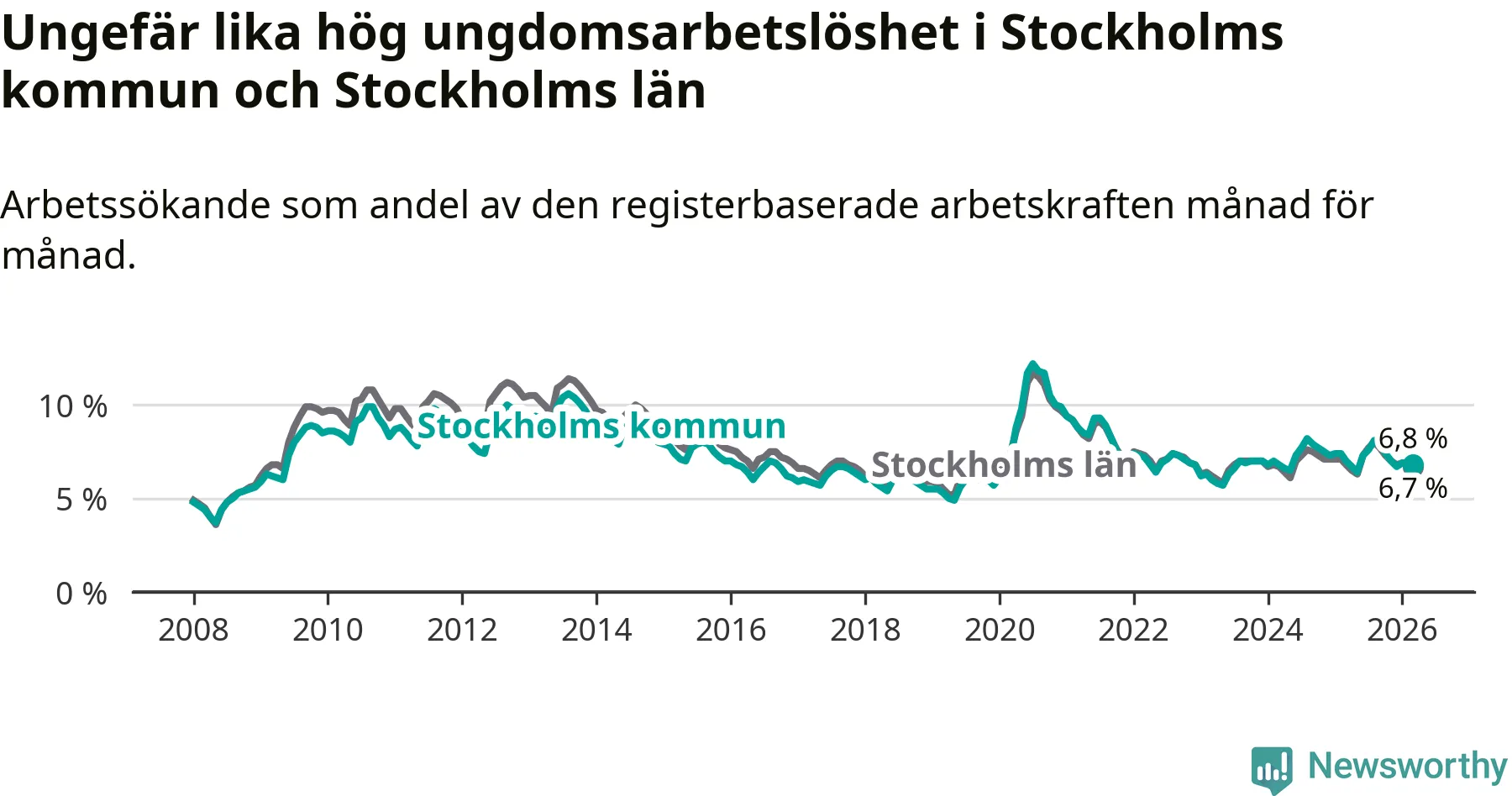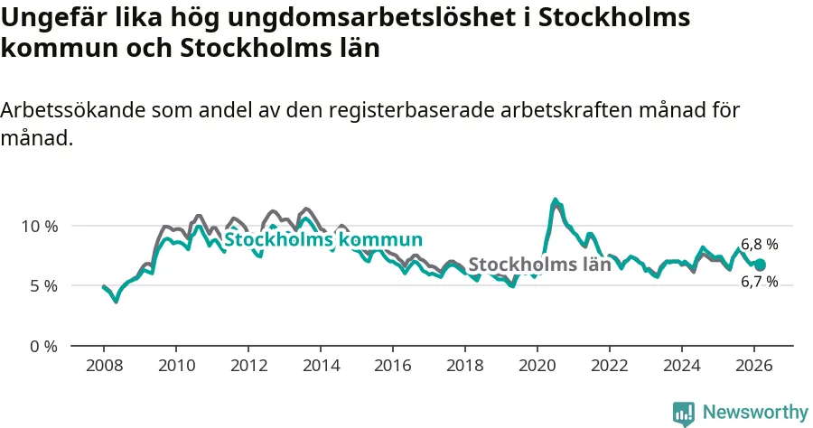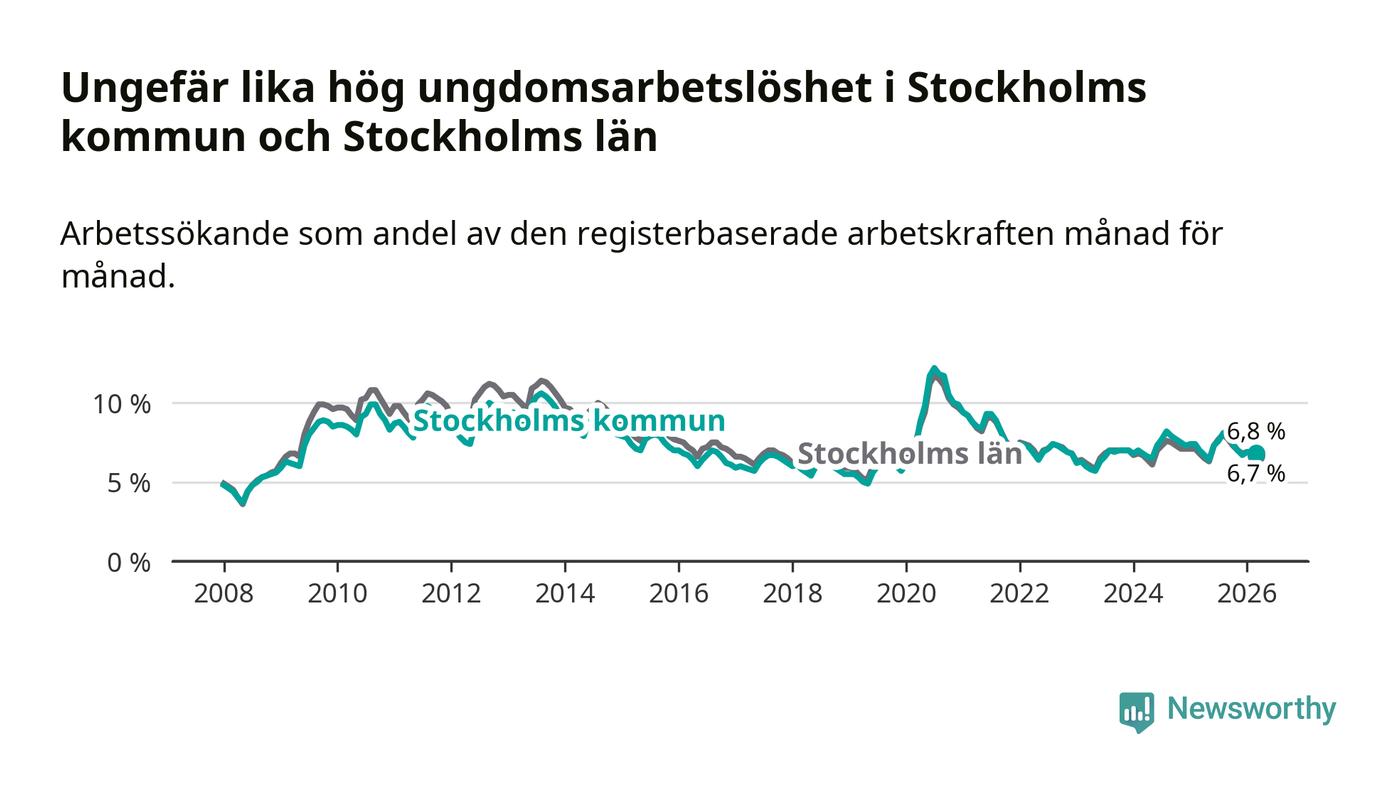 Precis som den totala arbetslösheten ligger ungdomsarbetslösheten i Stockholm på i stort sett samma nivå som i Stockholms län som helhet.