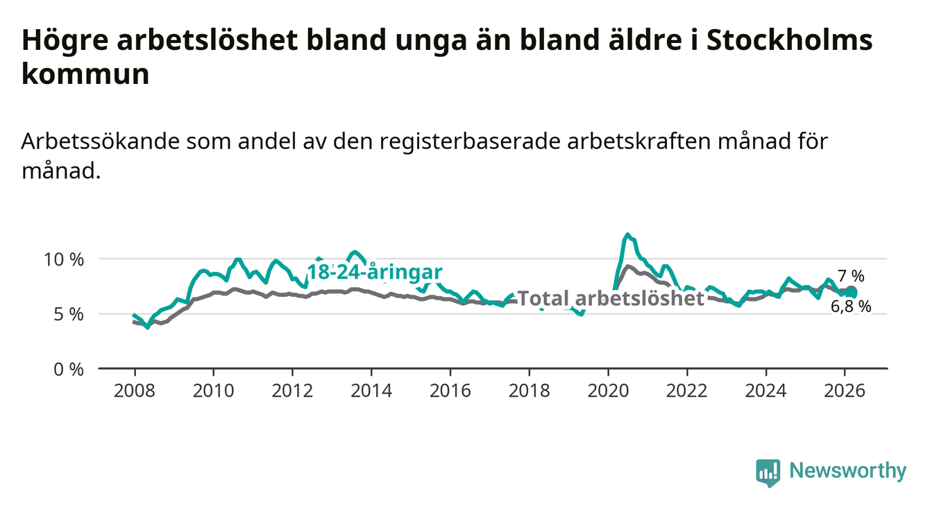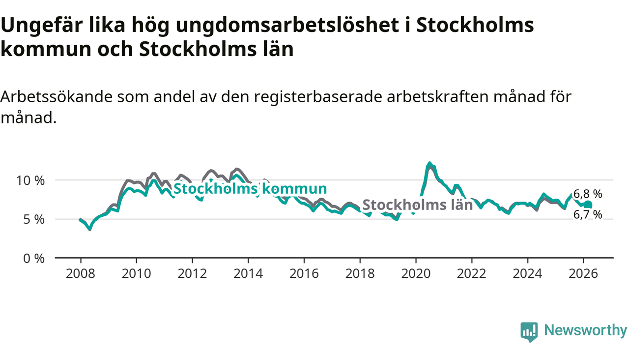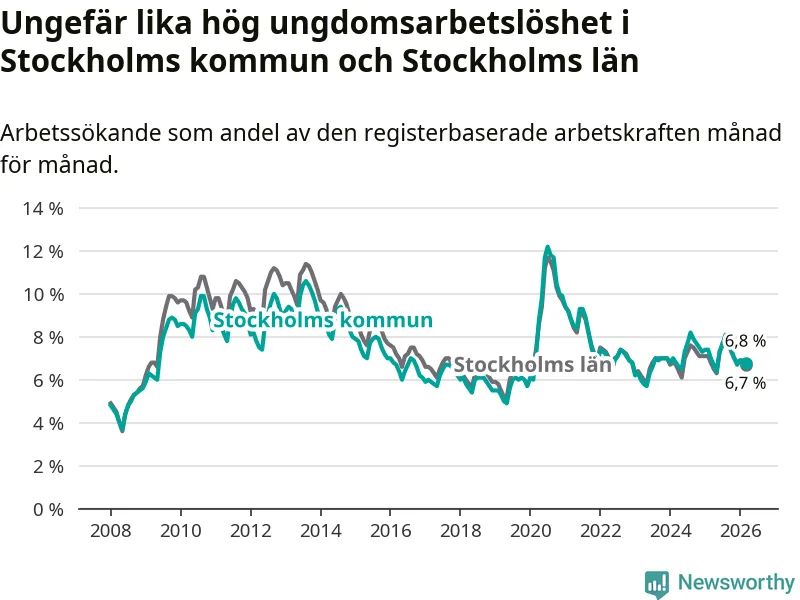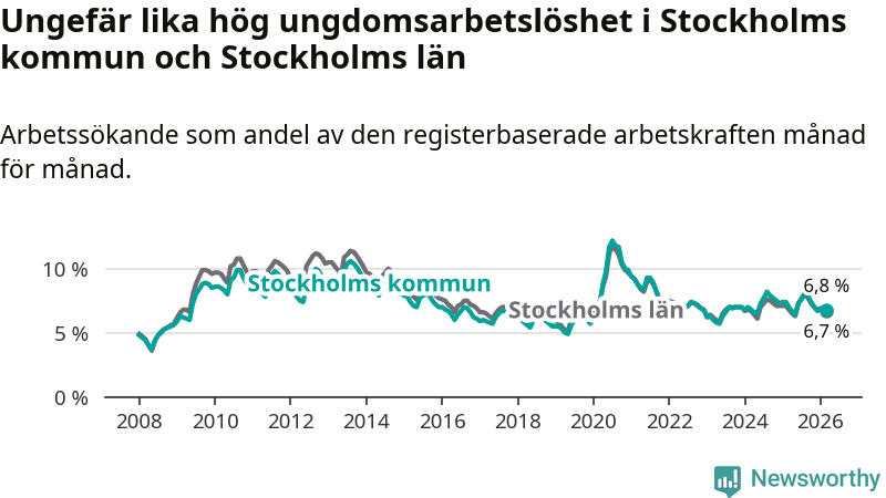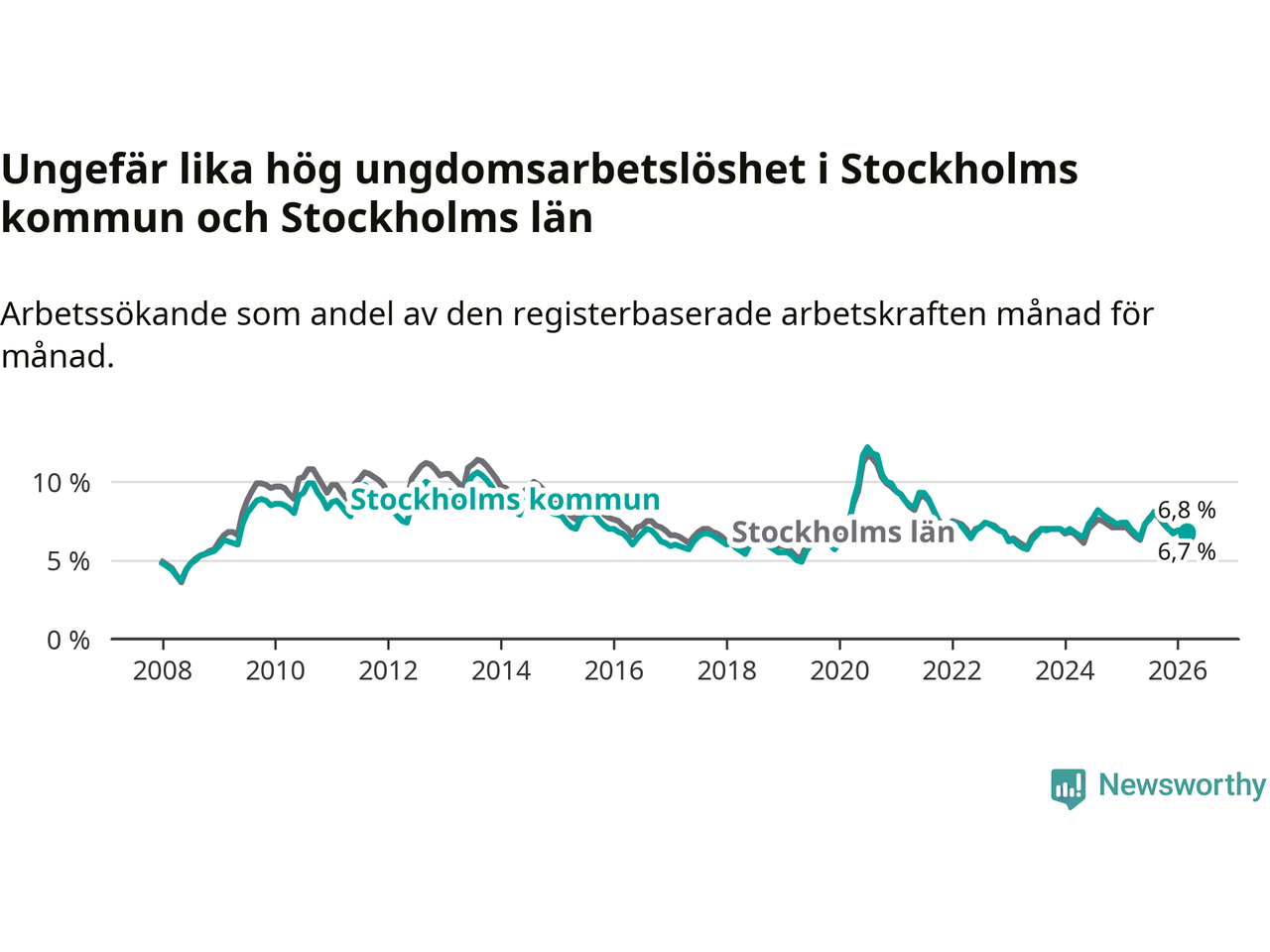Precis som den totala arbetslösheten ligger ungdomsarbetslösheten i Stockholm på i stort sett samma nivå som i Stockholms län som helhet.