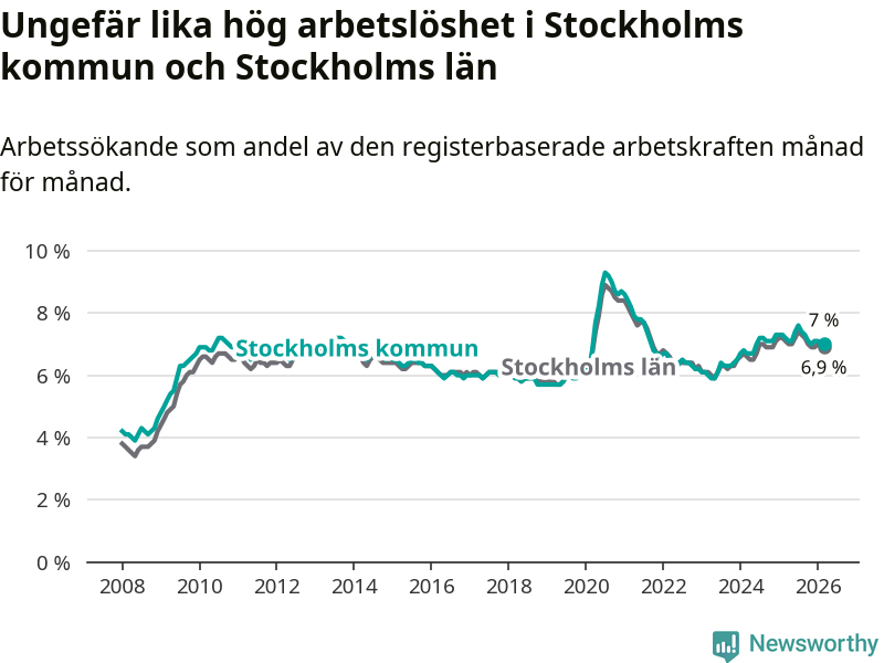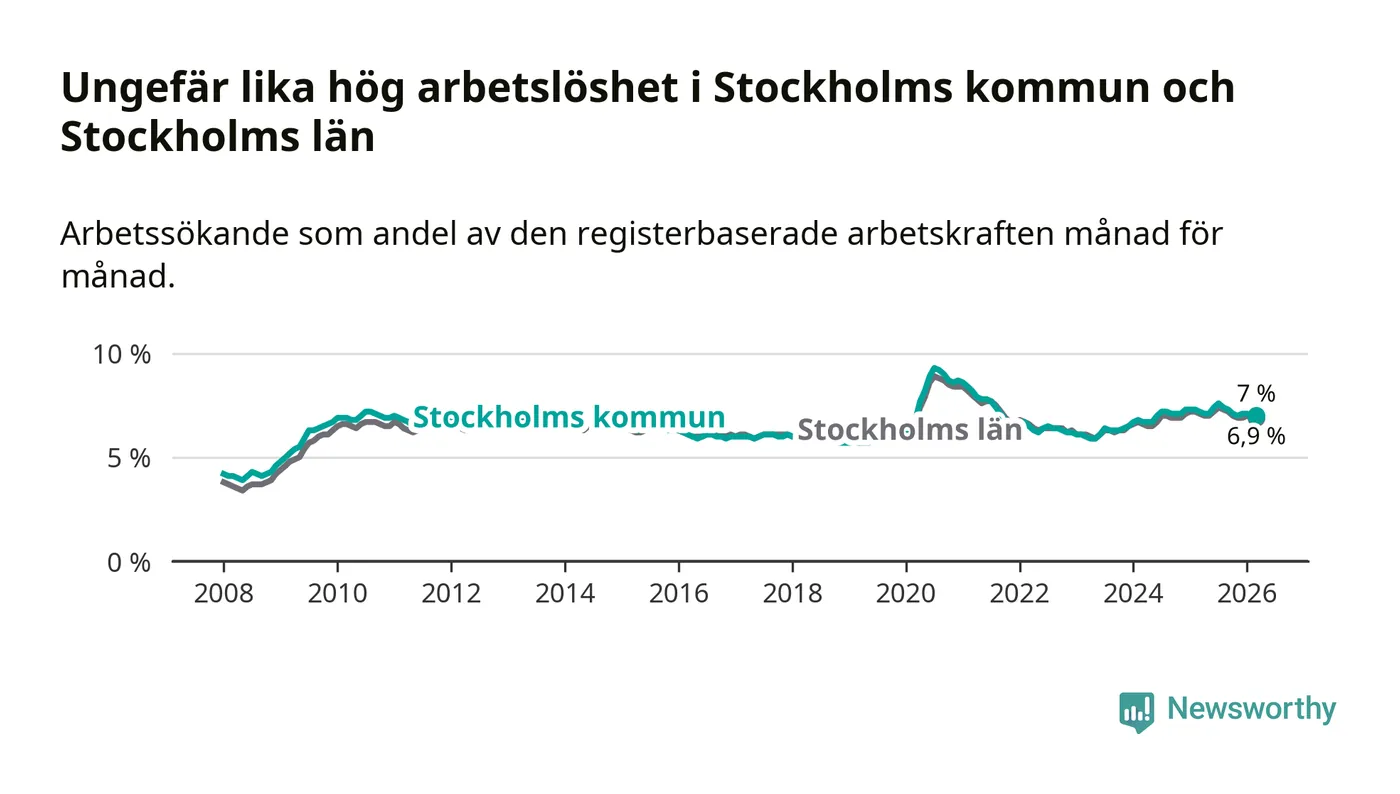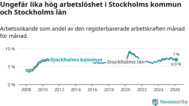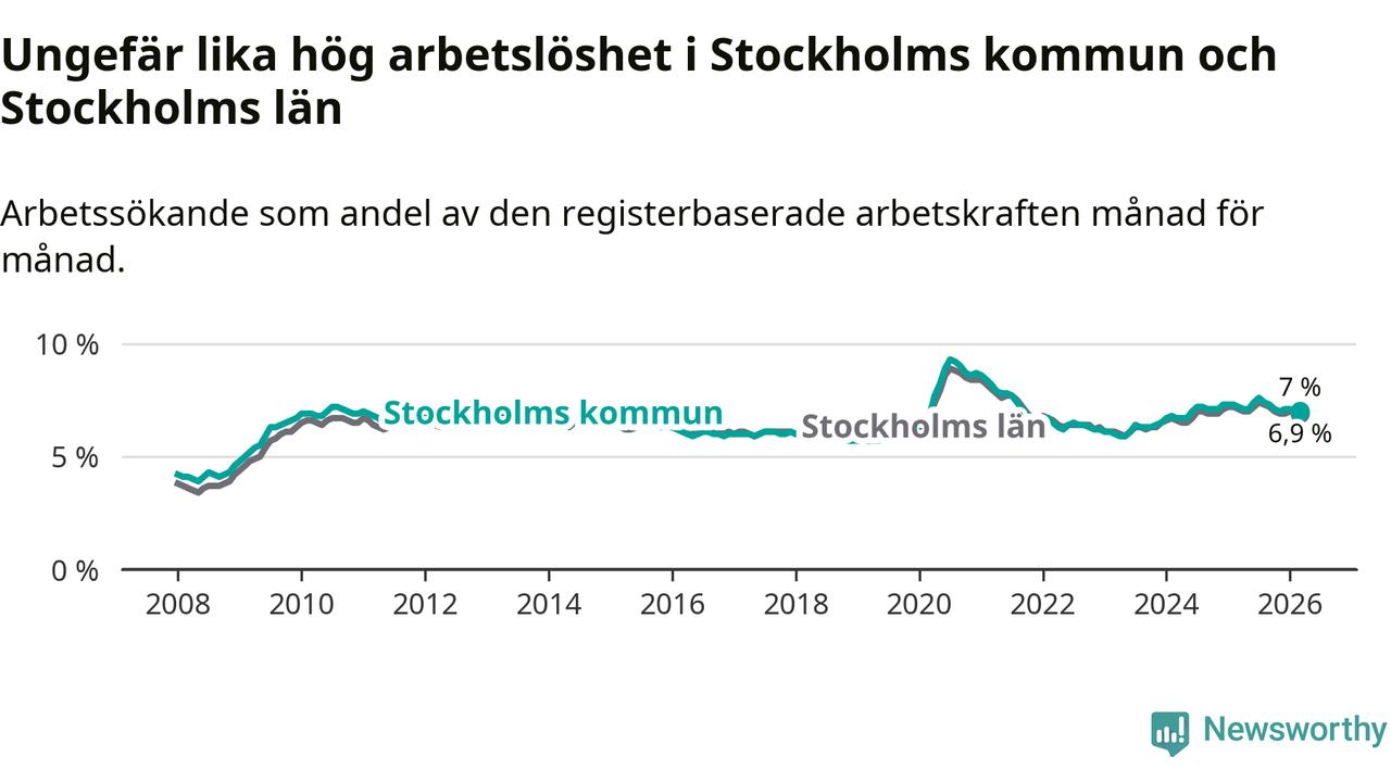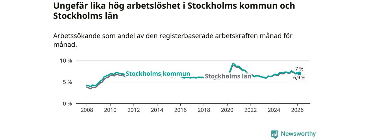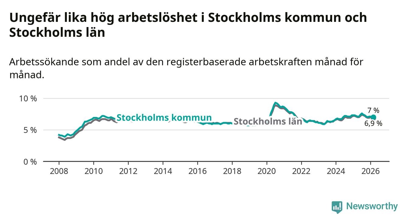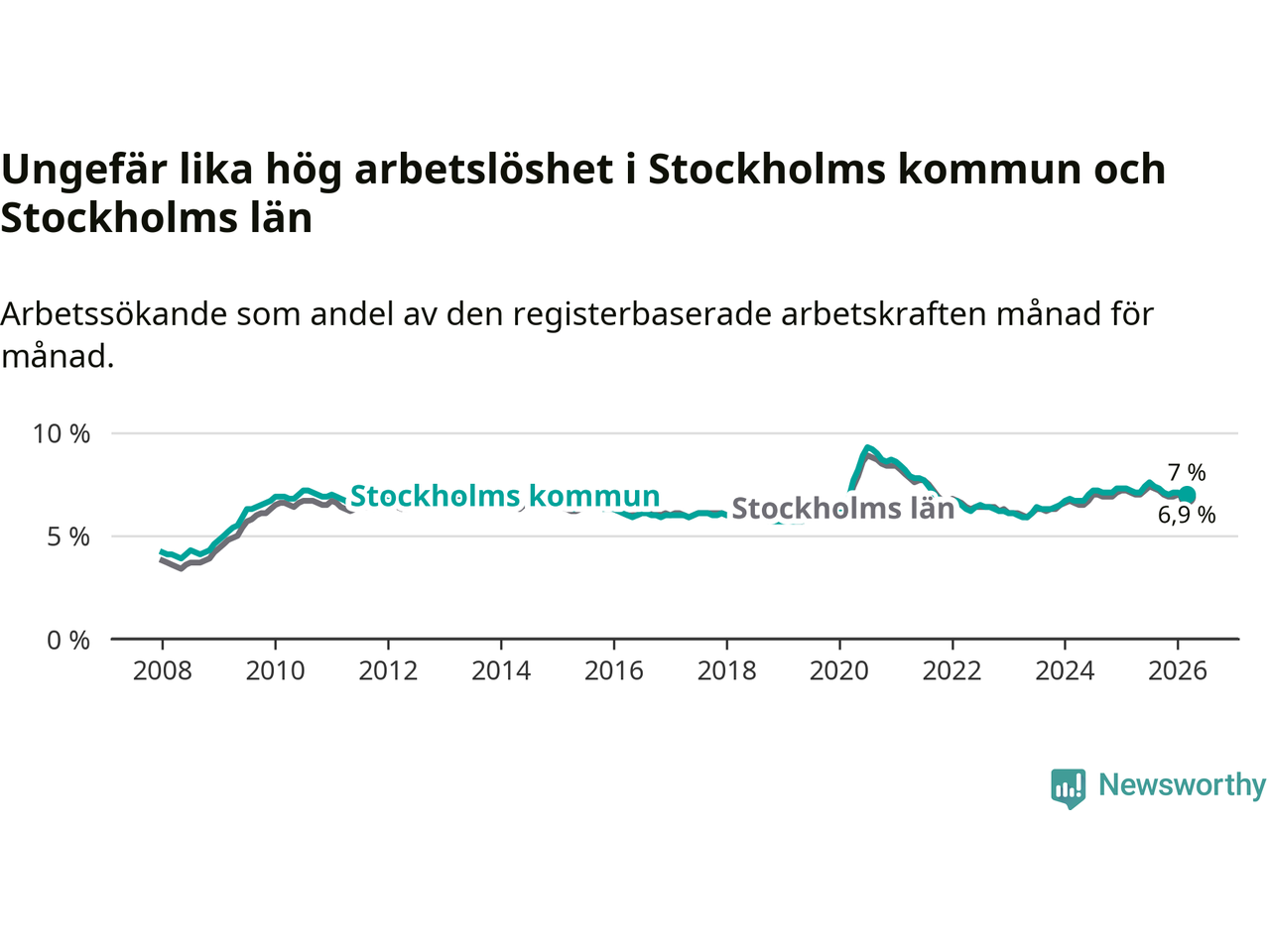 Under mars månad rapporterade Stockholms kommun en total arbetslöshet på 7,0 procent. Det är en minskning jämfört med samma tidpunkt i fjol (−0,2 procentenheter). Även i Stockholms län sjunker arbetslösheten något.