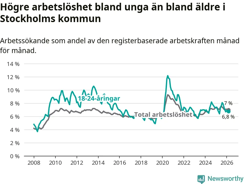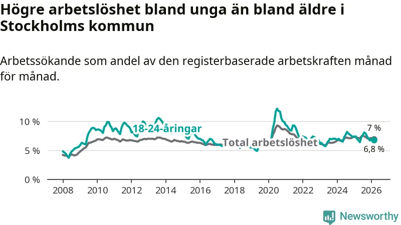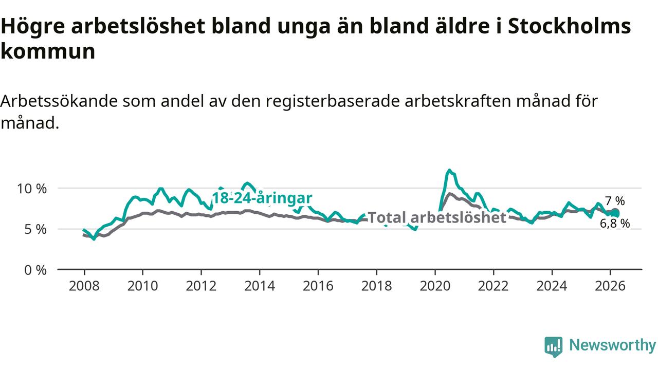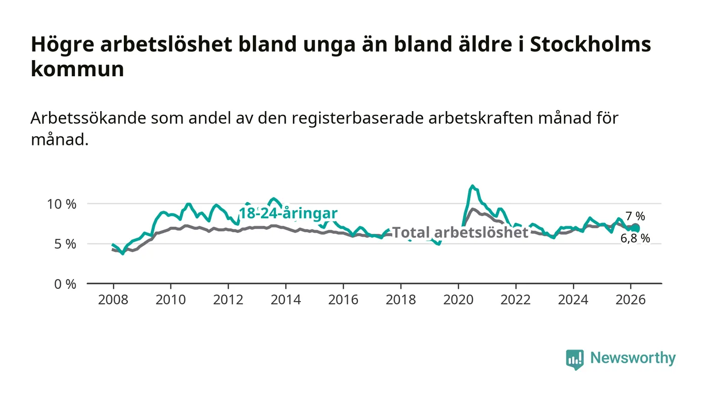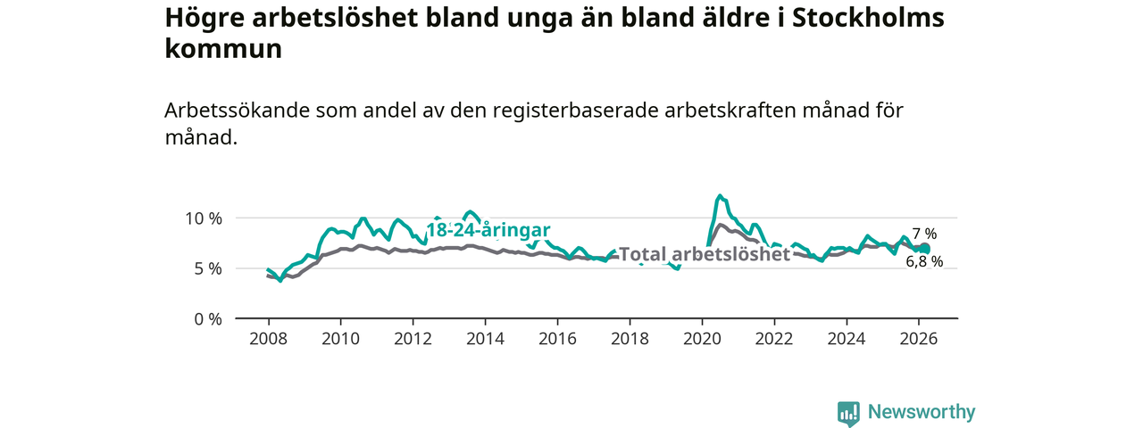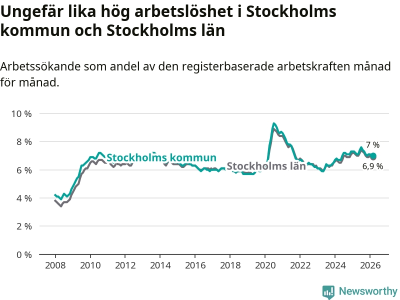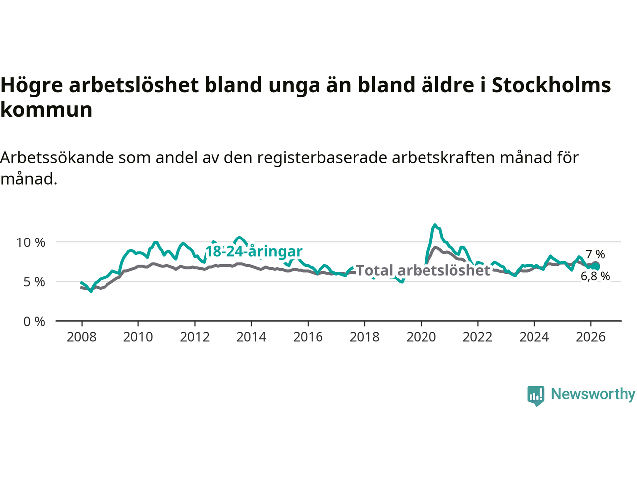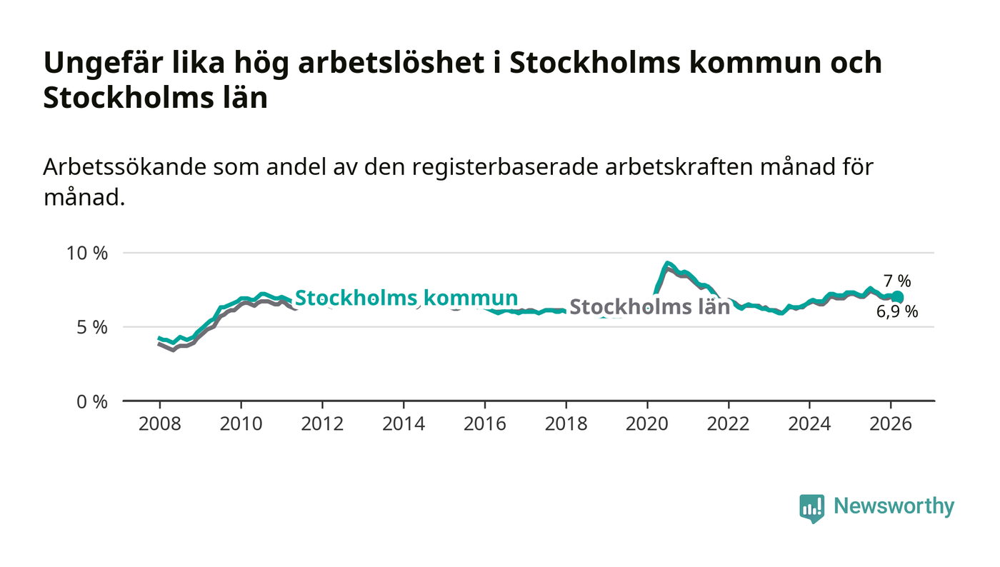 Under mars månad rapporterade Stockholms kommun en total arbetslöshet på 7,0 procent. Det är en minskning jämfört med samma tidpunkt i fjol (−0,2 procentenheter). Även i Stockholms län sjunker arbetslösheten något.