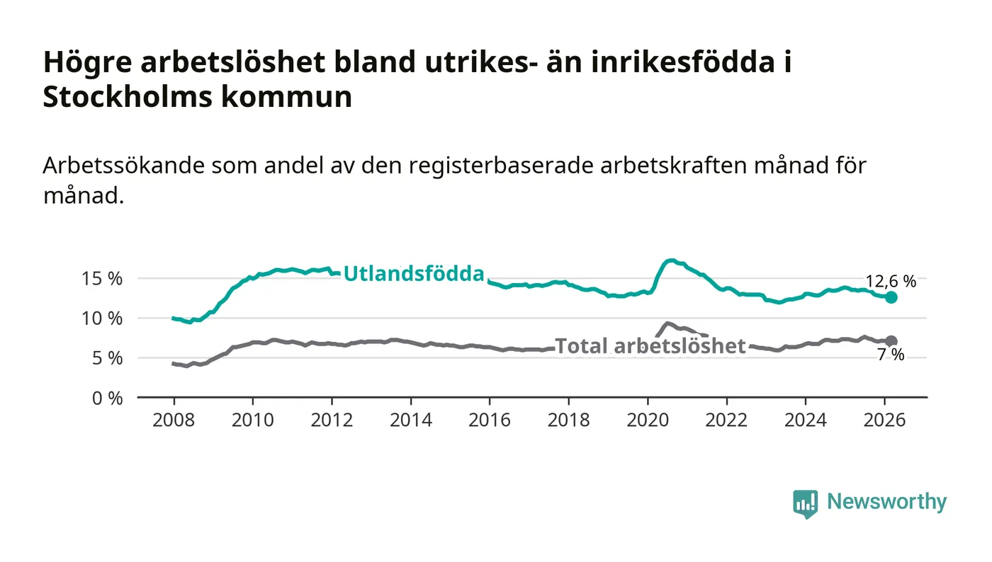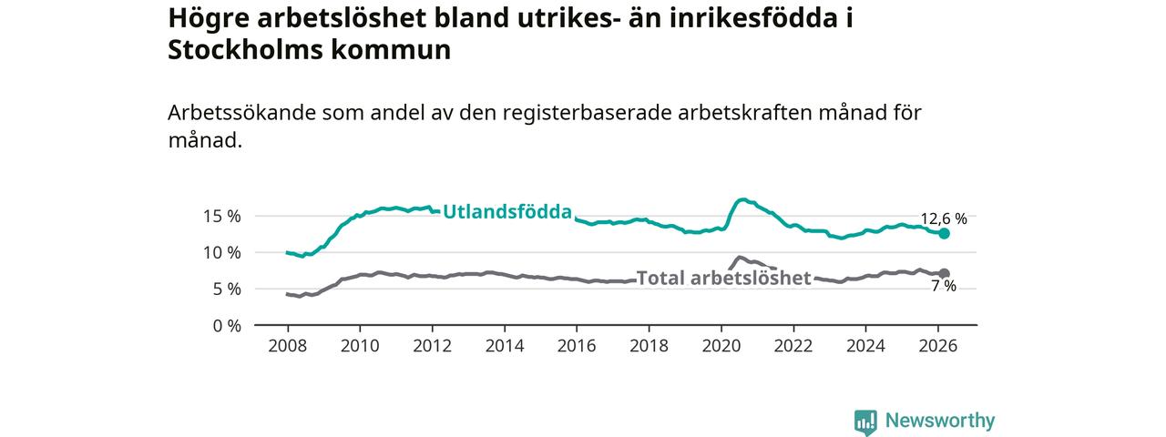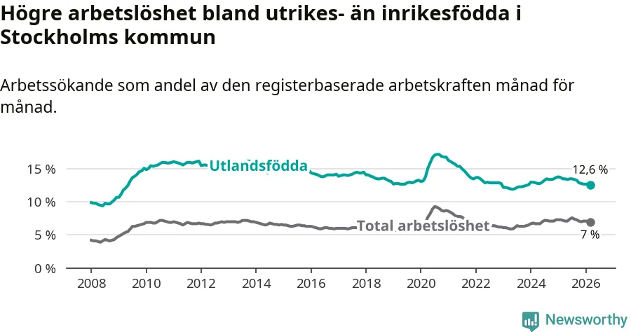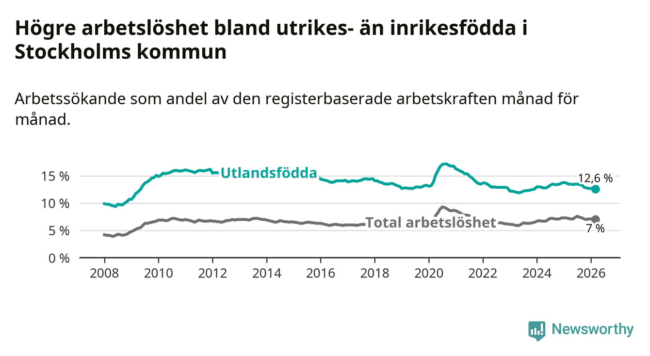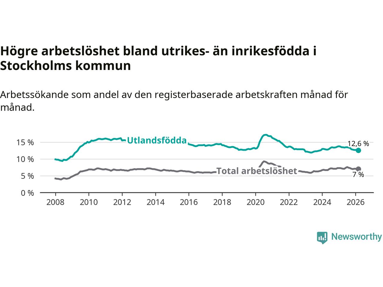 Arbetslösheten bland utlandsfödda var 12,6 procent i Stockholm under mars månad, motsvarande 20 287 av 161 008 personer. Det är 0,9 procentenheter färre än vid samma tidpunkt i fjol (−1 013 om man räknar personer). Därmed är de utlandsföddas arbetslöshet lägre än vid samma tidpunkt i fjol för åttonde månaden i följd.