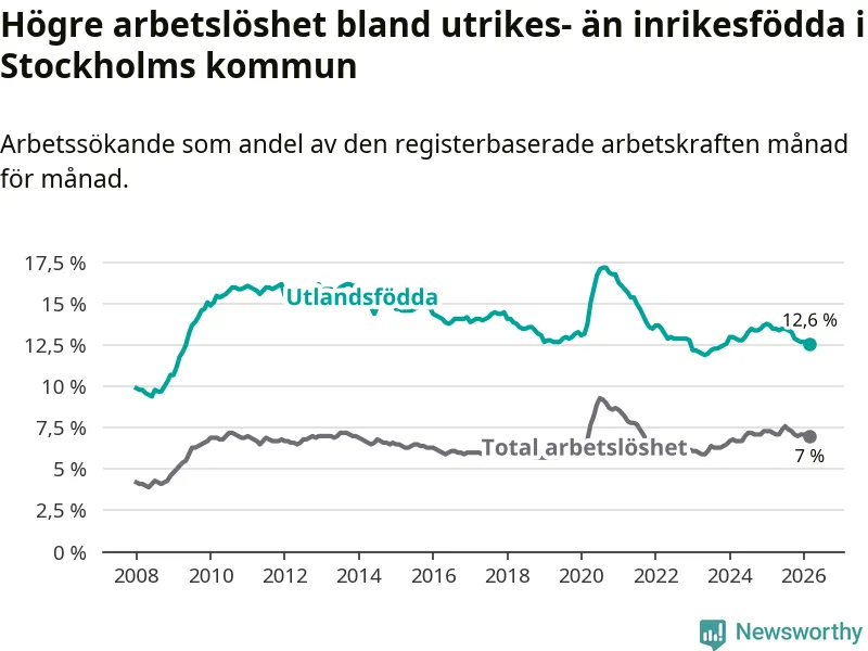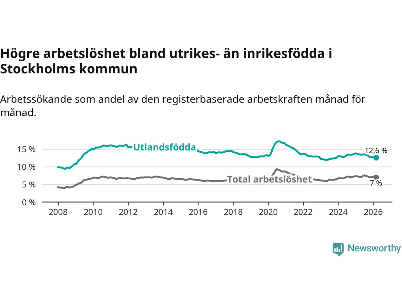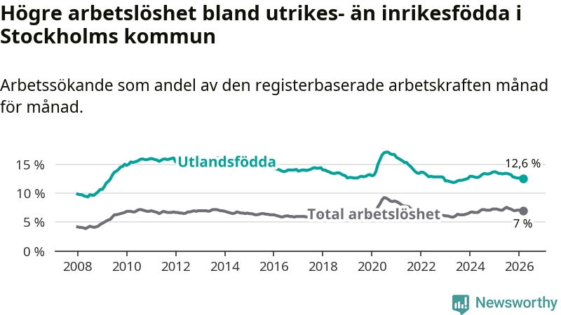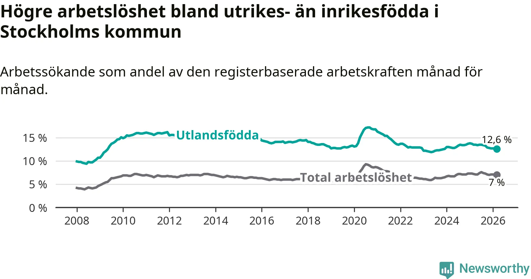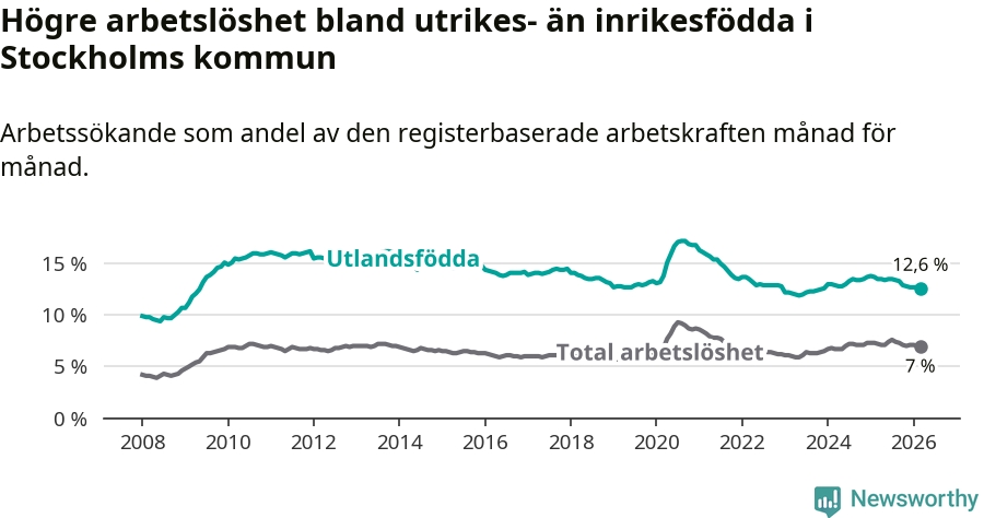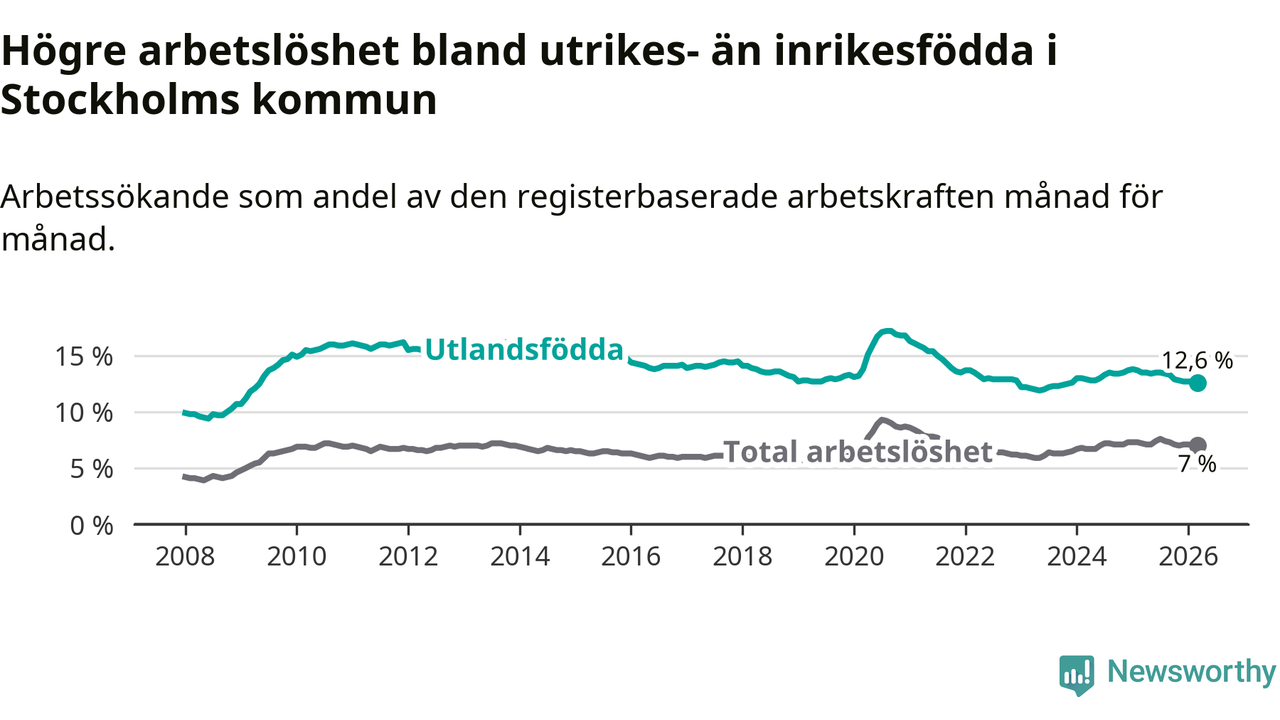 Arbetslösheten bland utlandsfödda var 12,6 procent i Stockholm under mars månad, motsvarande 20 287 av 161 008 personer. Det är 0,9 procentenheter färre än vid samma tidpunkt i fjol (−1 013 om man räknar personer). Därmed är de utlandsföddas arbetslöshet lägre än vid samma tidpunkt i fjol för åttonde månaden i följd.
