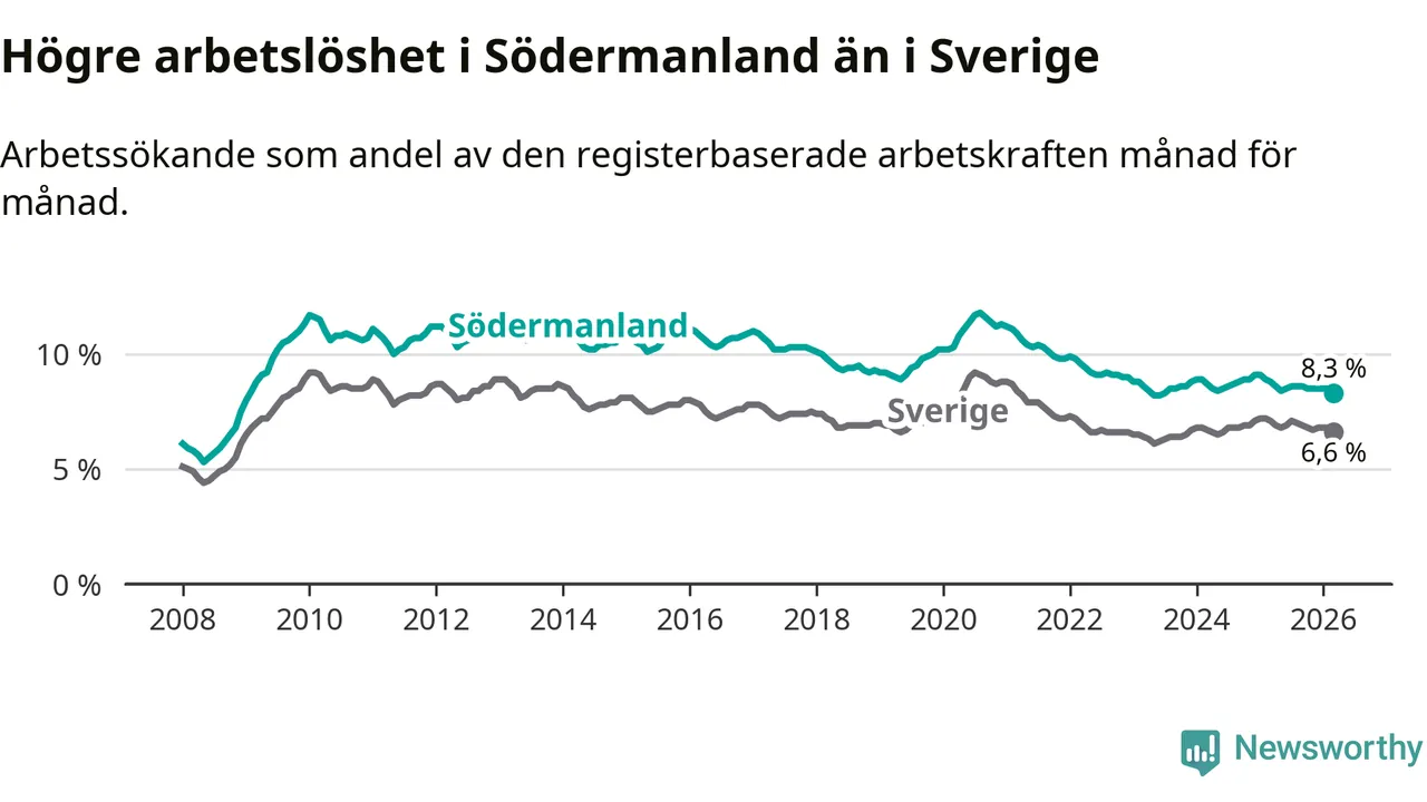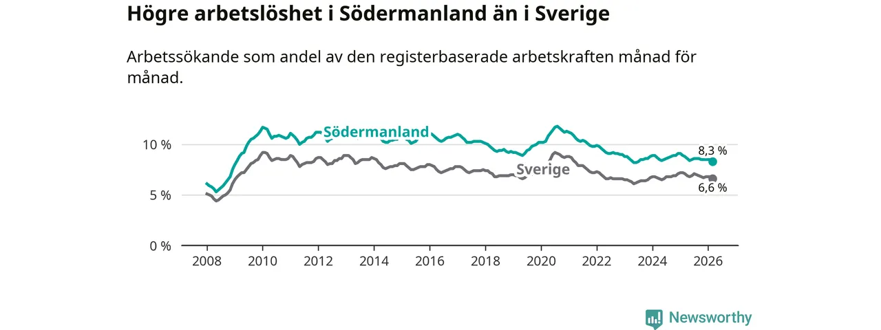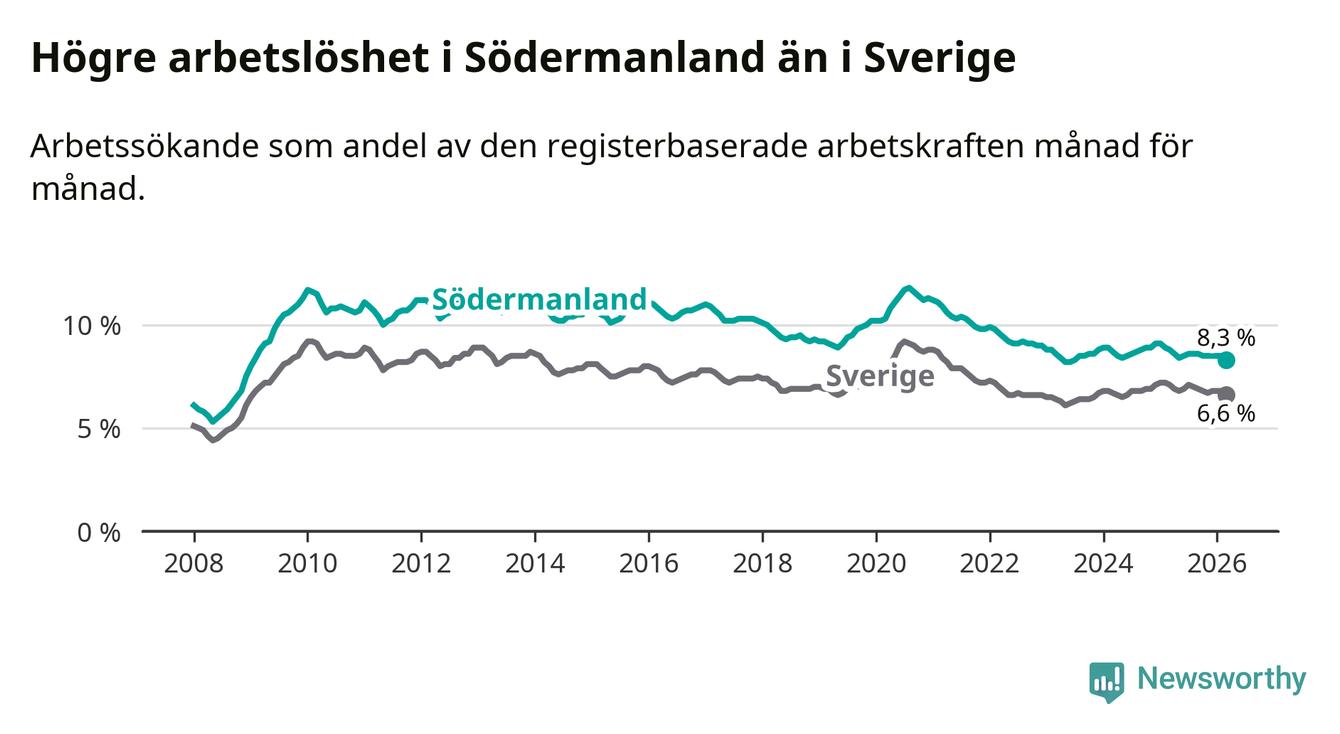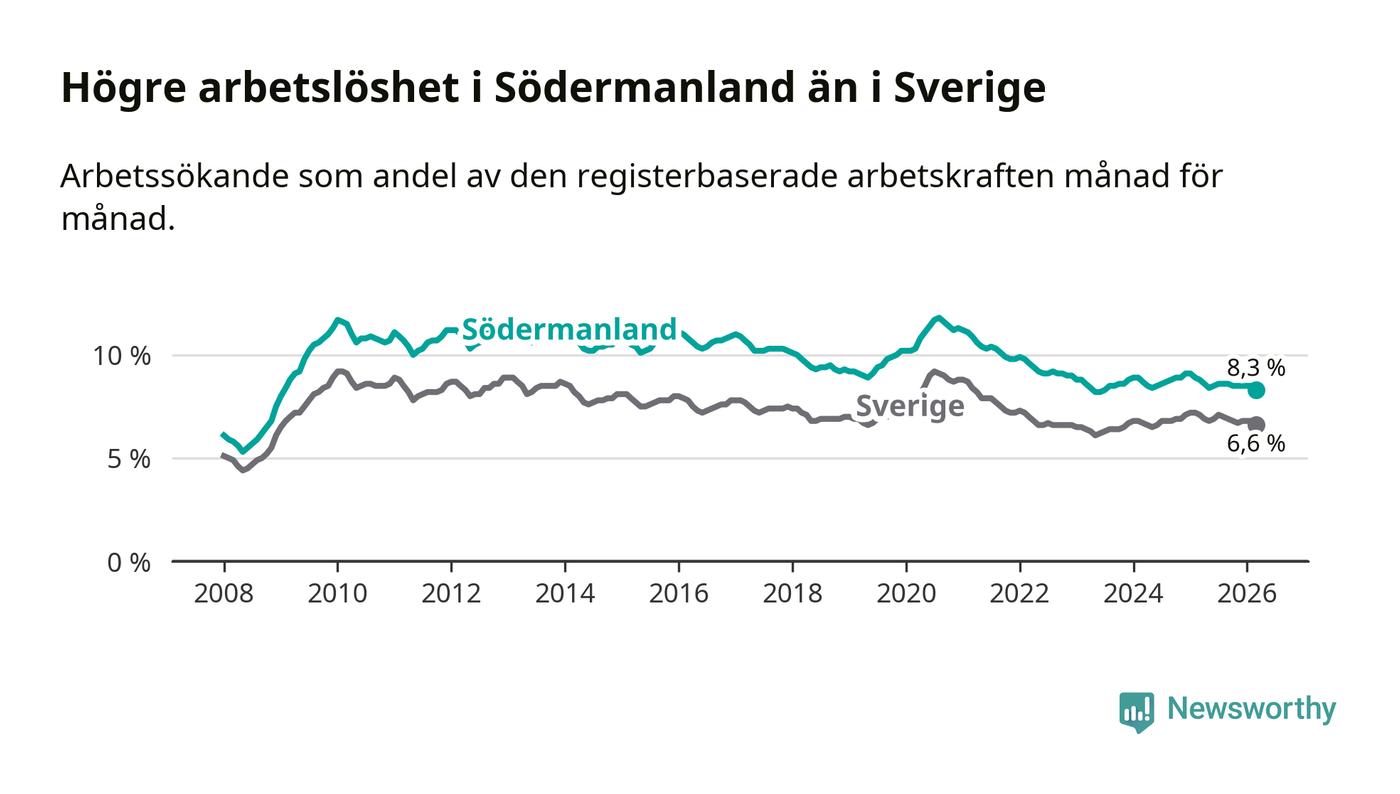 Under mars månad rapporterade Södermanlands län en total arbetslöshet på 8,3 procent. Det är en minskning jämfört med samma tidpunkt i fjol (−0,5 procentenheter). Även i Sverige sjunker arbetslösheten .