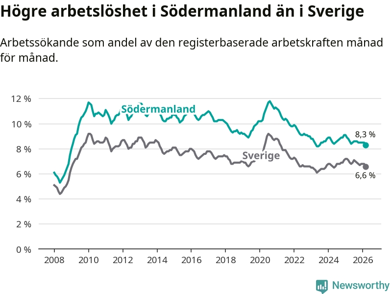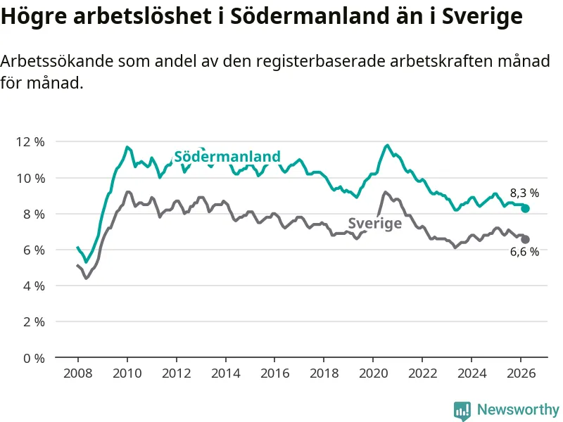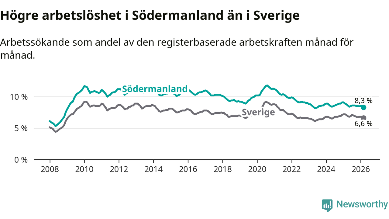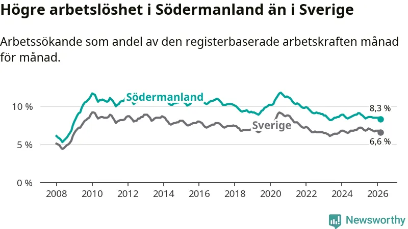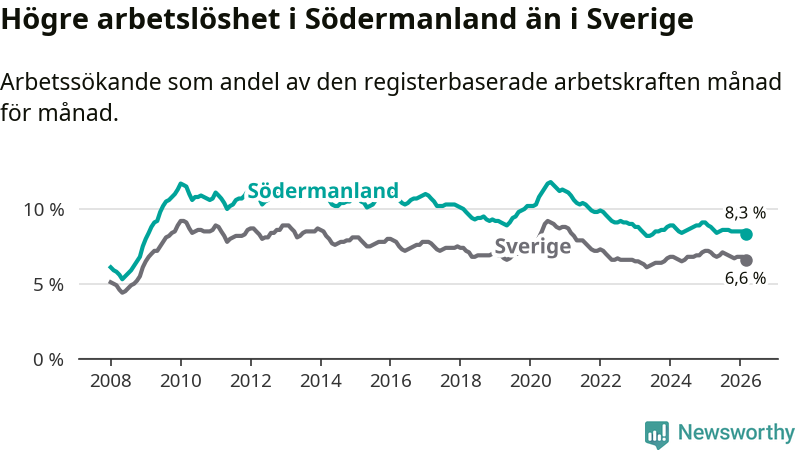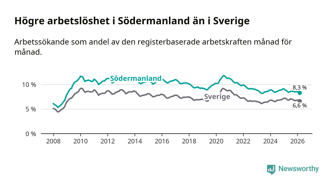 Under mars månad rapporterade Södermanlands län en total arbetslöshet på 8,3 procent. Det är en minskning jämfört med samma tidpunkt i fjol (−0,5 procentenheter). Även i Sverige sjunker arbetslösheten .