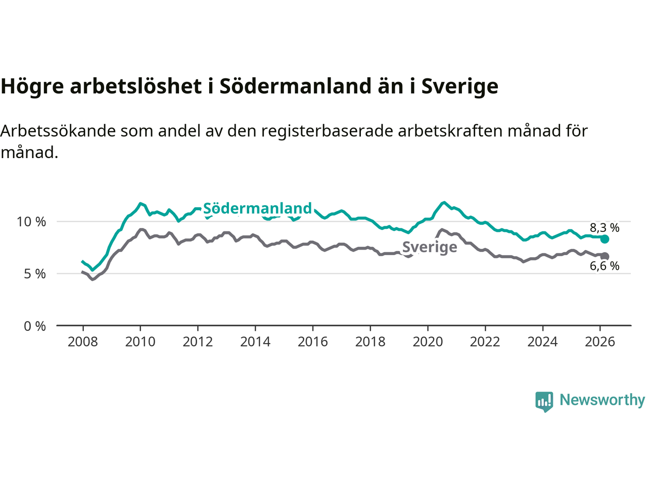 Även om arbetslösheten i Södermanland alltså minskar, så ligger den fortfarande över snittet i hela Sverige (8,3 procent i länet, jämfört med 6,6 procent i hela riket). Norrbotten har den lägsta arbetslösheten i riket (3,8 procent), medan Skåne har den högsta (8,6 procent). För att Södermanland skulle komma ner i samma arbetslöshetsnivå som Norrbotten skulle 6 429 personer behöva sysselsättas.