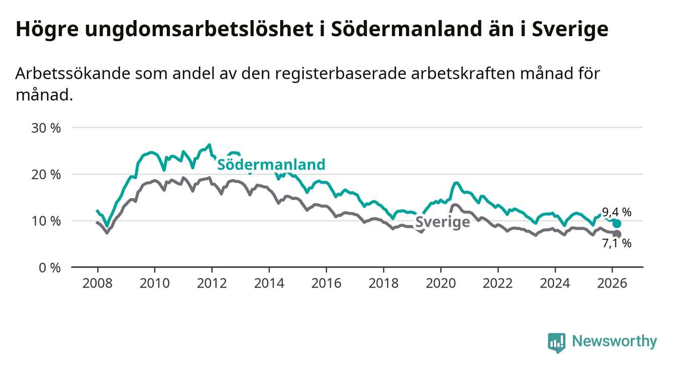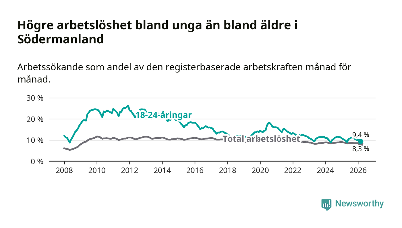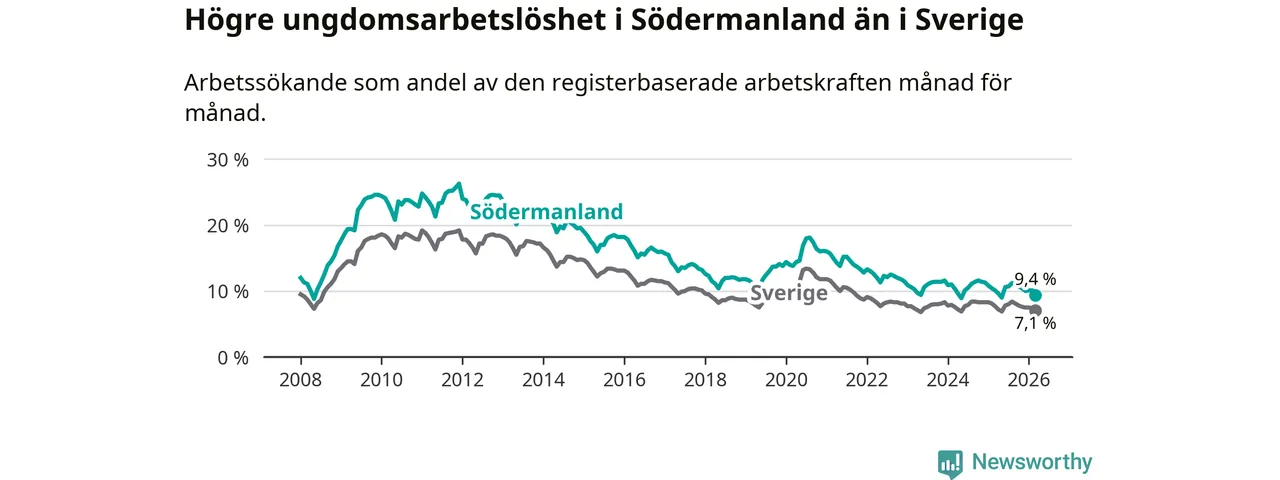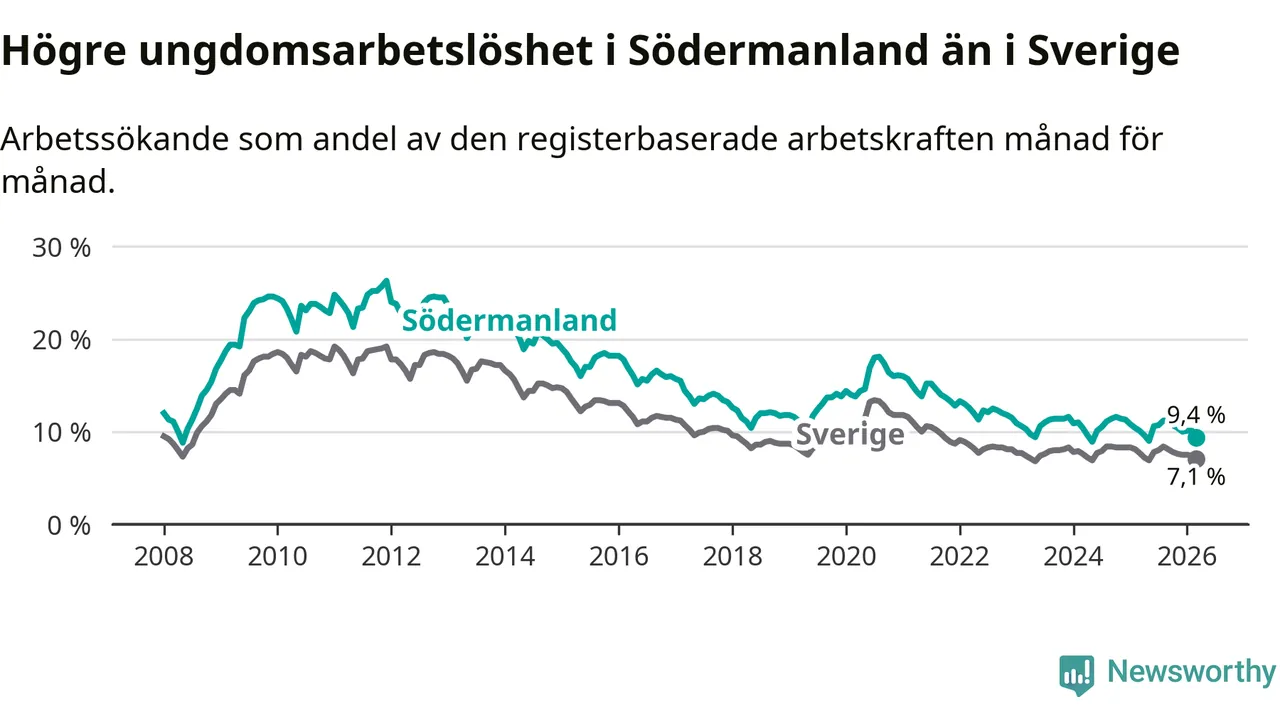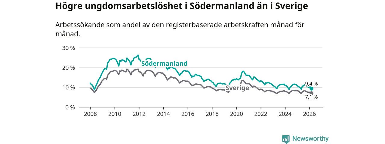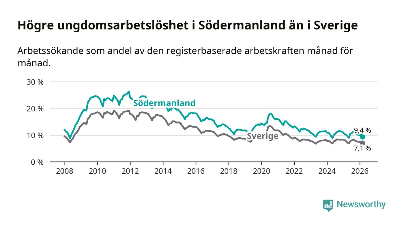 I och med den senaste månadens nedgång har de ungas arbetslöshet i Södermanland sjunkit sju månader i följd (ner från 11,2 procent i augusti 2025 till 9,4 procent nu).
