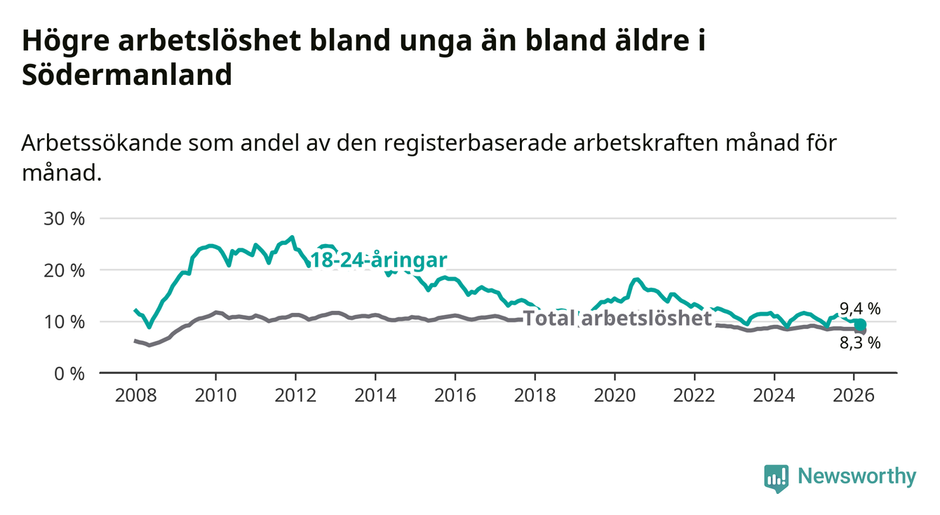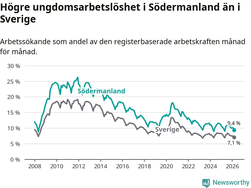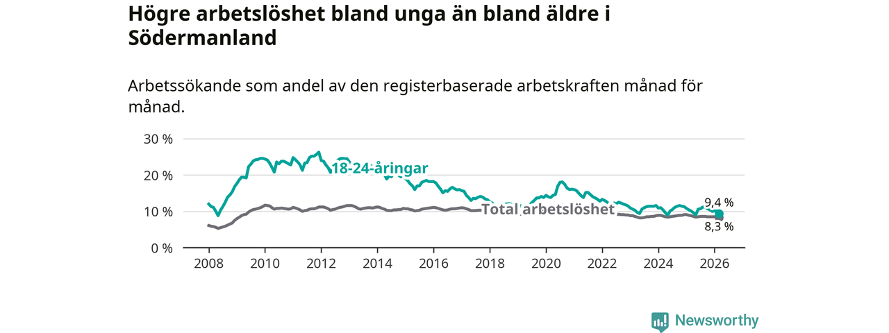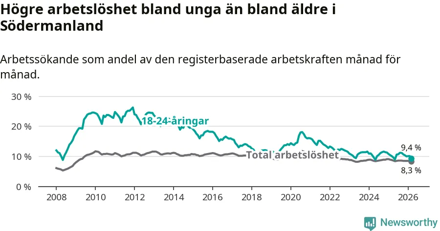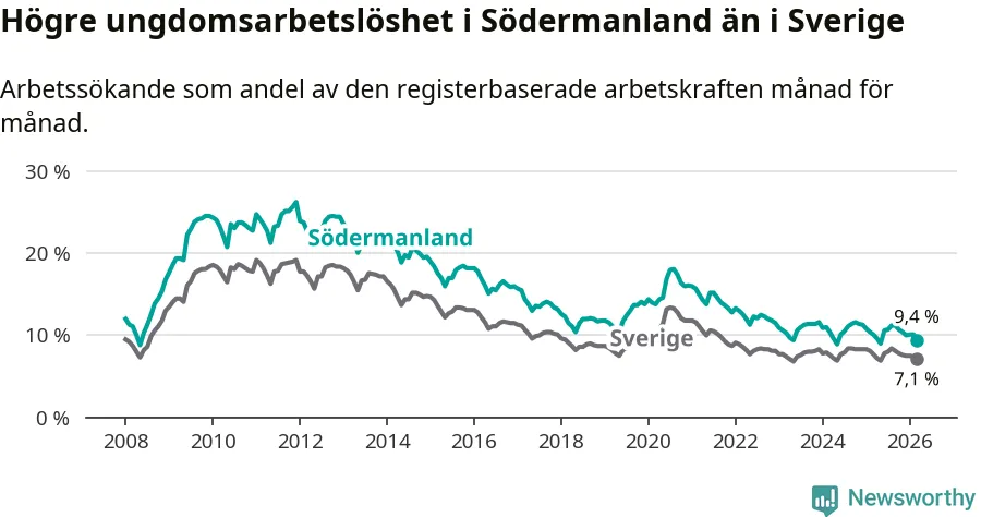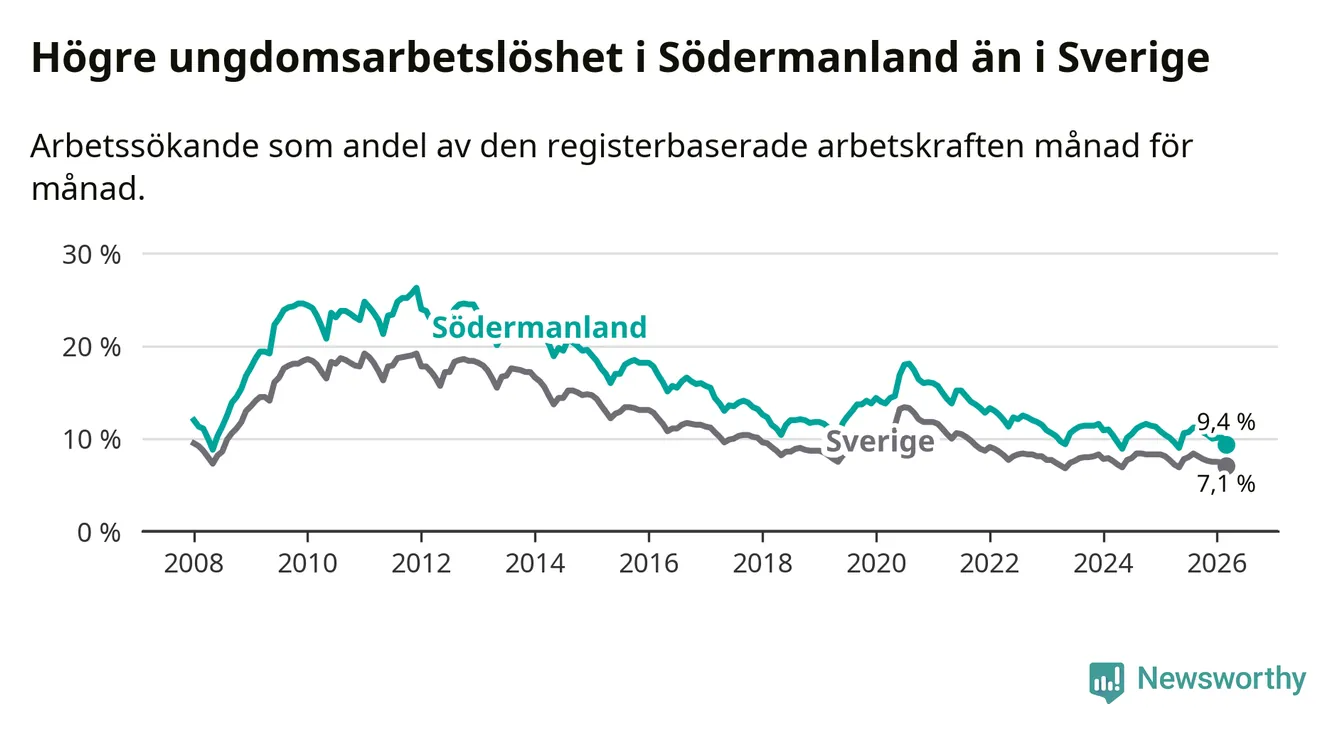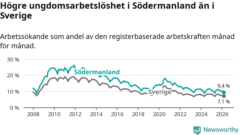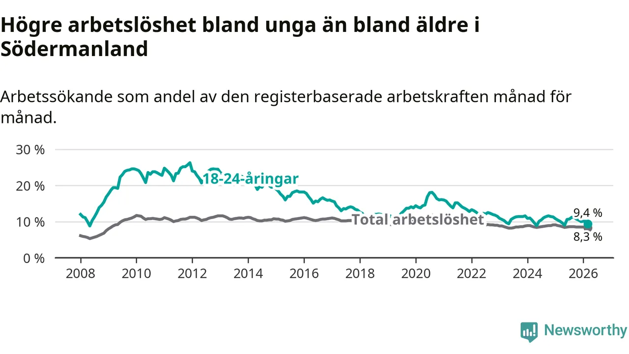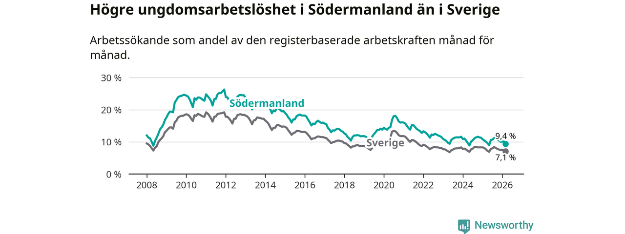 I och med den senaste månadens nedgång har de ungas arbetslöshet i Södermanland sjunkit sju månader i följd (ner från 11,2 procent i augusti 2025 till 9,4 procent nu).
