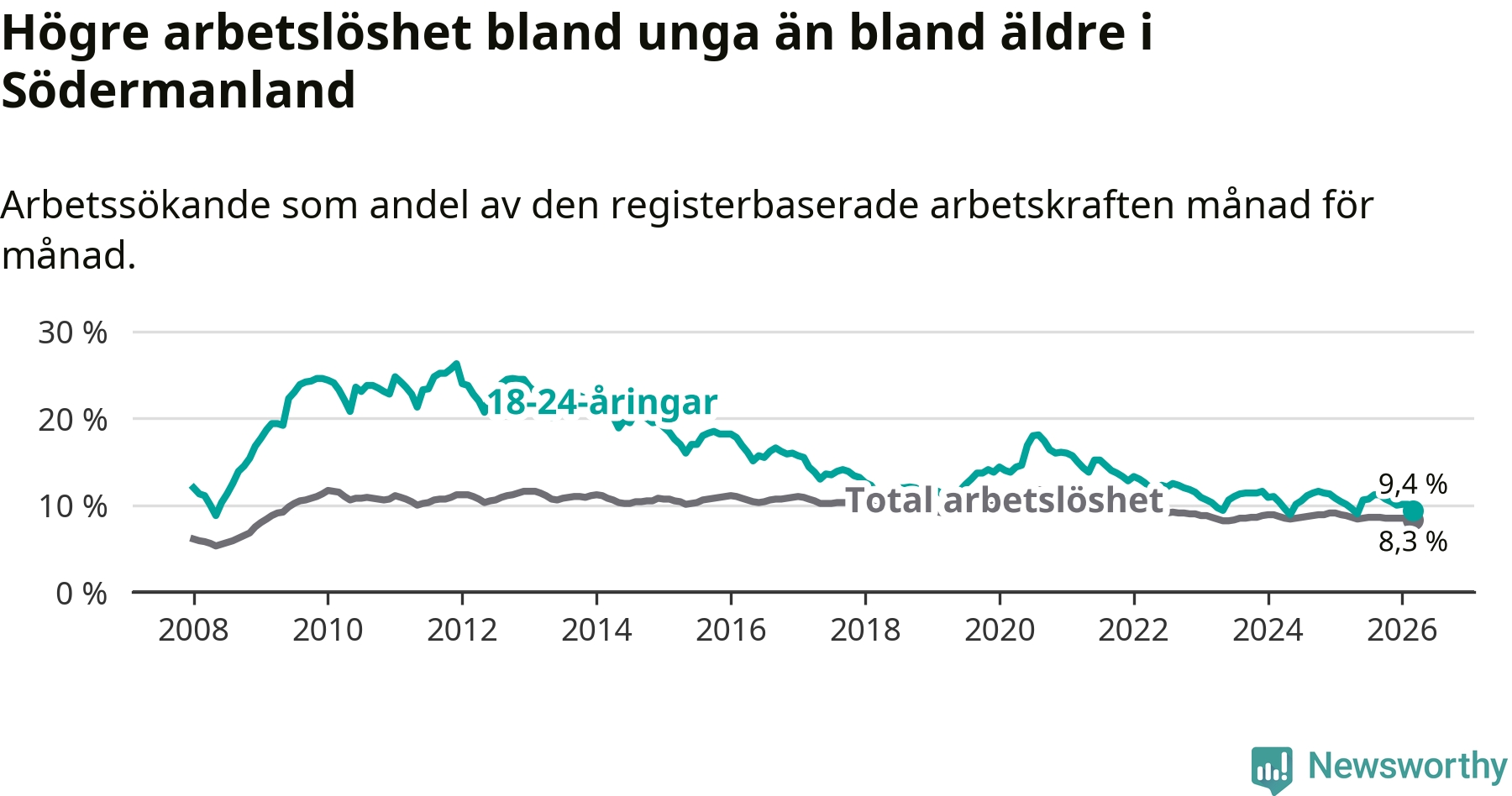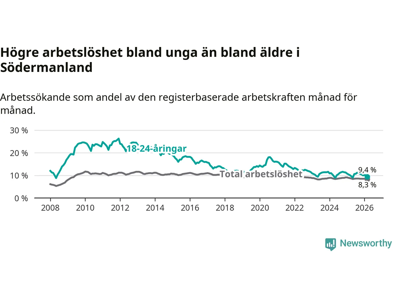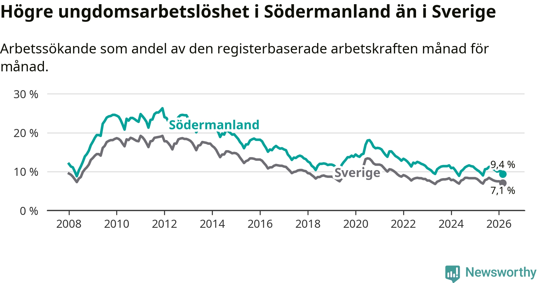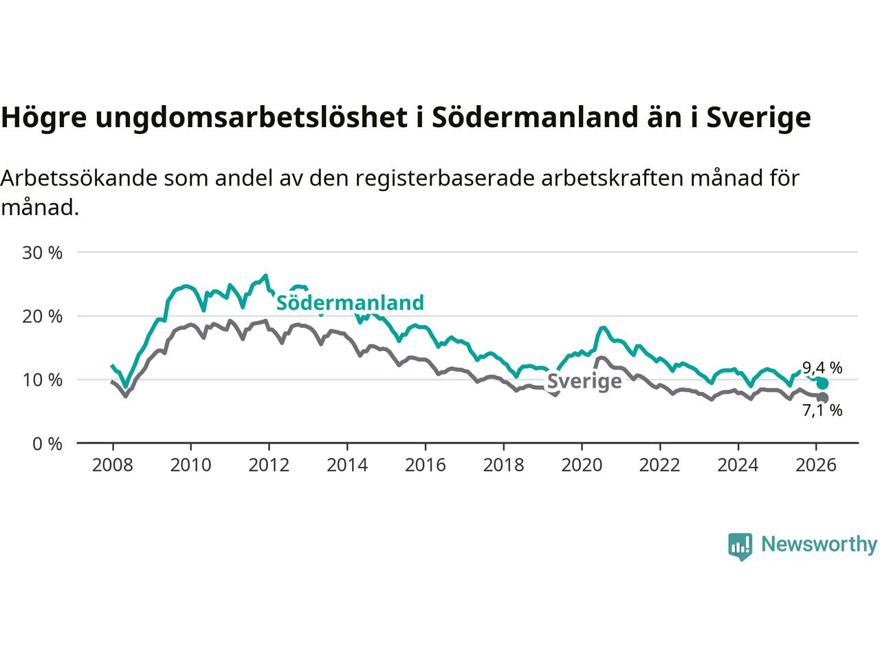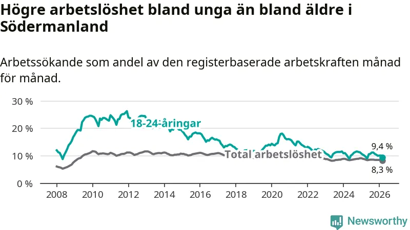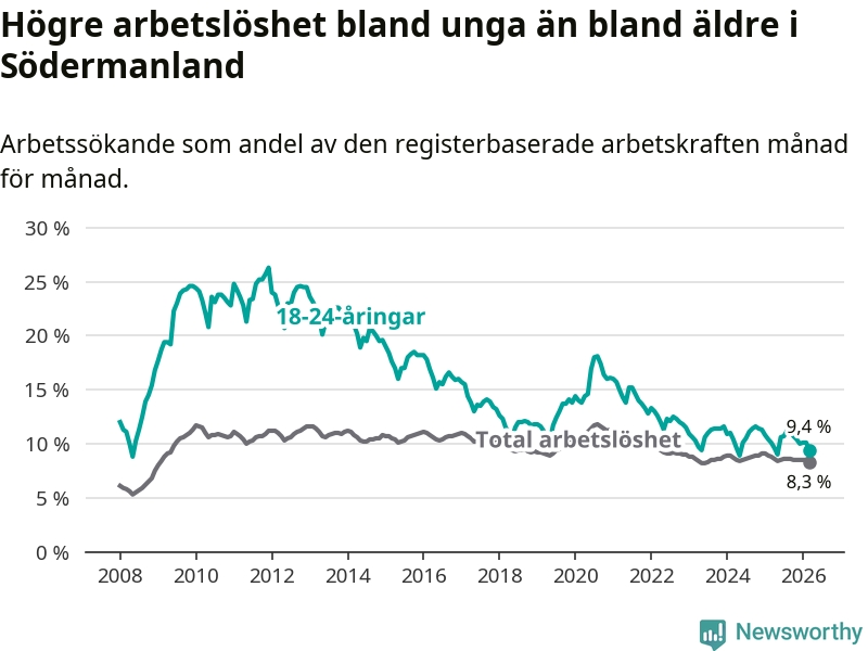 I och med den senaste månadens nedgång har de ungas arbetslöshet i Södermanland sjunkit sju månader i följd (ner från 11,2 procent i augusti 2025 till 9,4 procent nu).