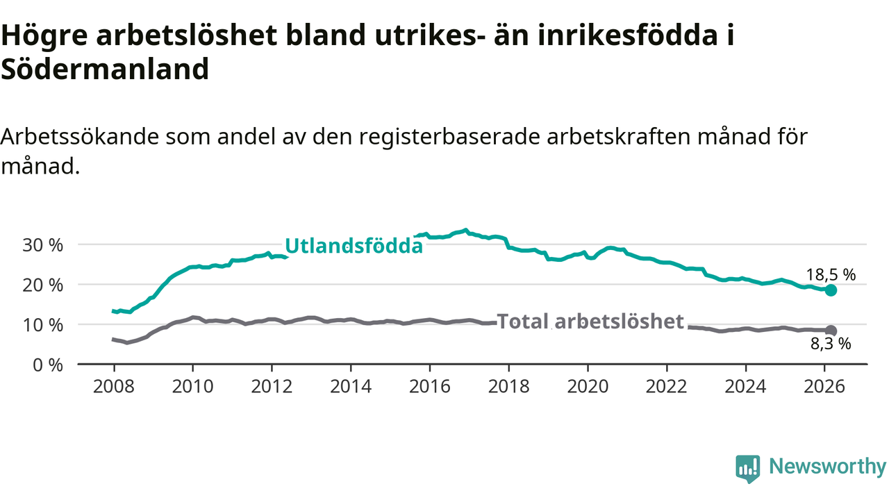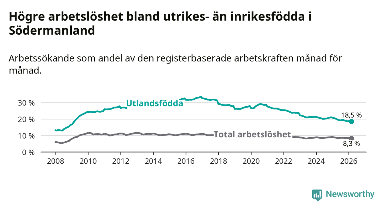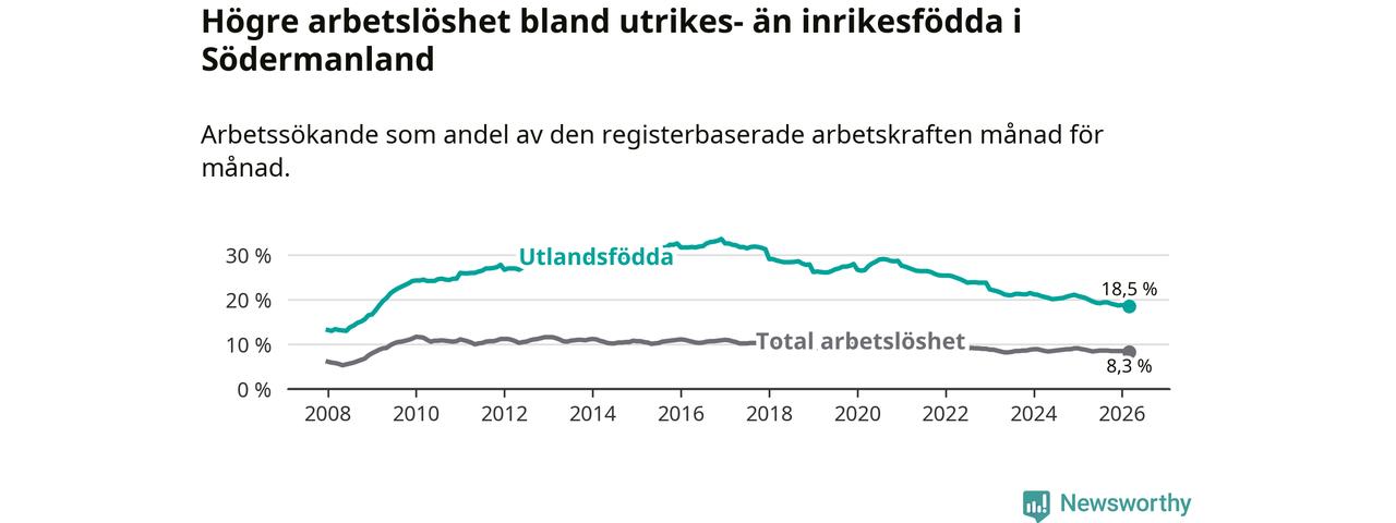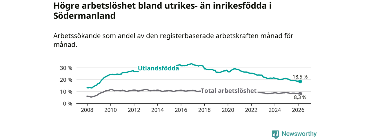 Arbetslösheten bland utlandsfödda var 18,5 procent i Södermanland under mars månad, motsvarande 6 706 av 36 249 personer. Det är 1,9 procentenheter färre än vid samma tidpunkt i fjol (−652 om man räknar personer). Därmed har de utlandsföddas arbetslöshet varit lägre än vid samma tidpunkt i fjol i över fem år i sträck. Sedan mars 2021 har arbetslösheten bland utlandsfödda minskat från 27,1 till 18,5 procent. Den nuvarande arbetslöshetsnivån är den lägsta sedan februari 2009.