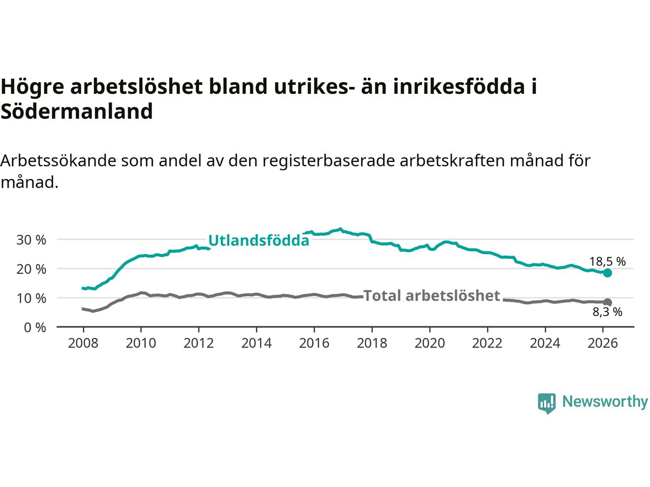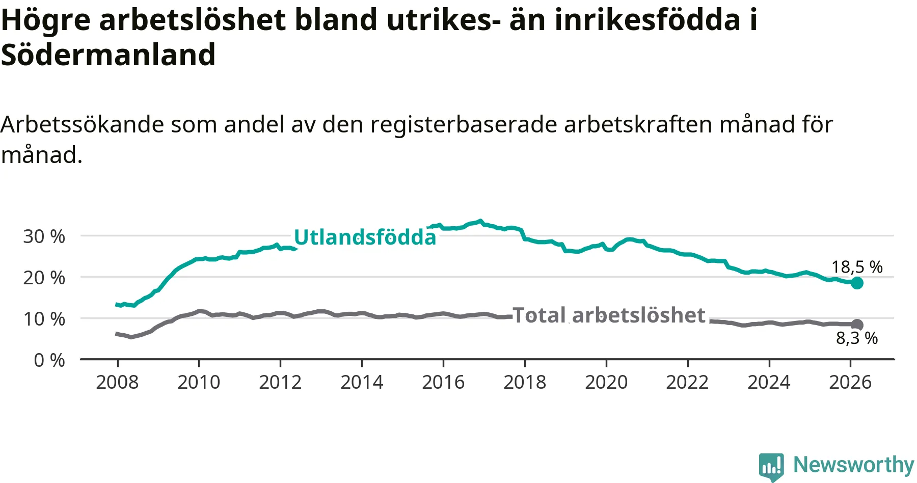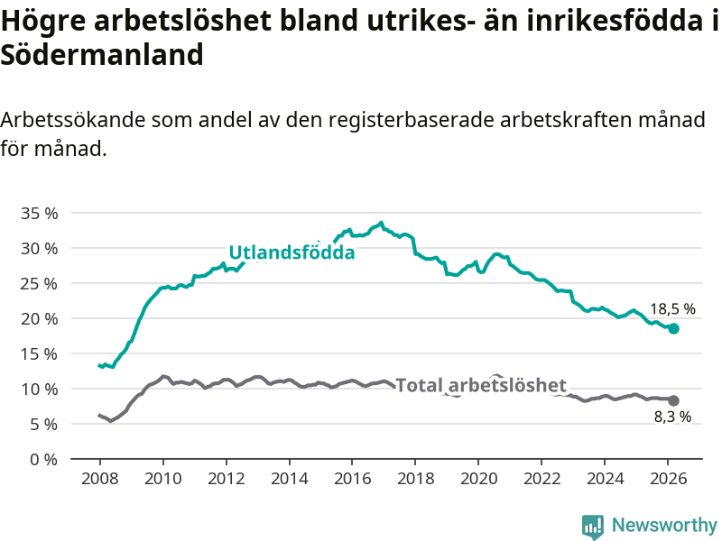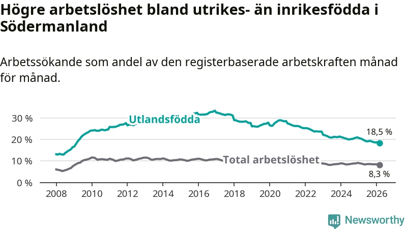Arbetslösheten bland utlandsfödda var 18,5 procent i Södermanland under mars månad, motsvarande 6 706 av 36 249 personer. Det är 1,9 procentenheter färre än vid samma tidpunkt i fjol (−652 om man räknar personer). Därmed har de utlandsföddas arbetslöshet varit lägre än vid samma tidpunkt i fjol i över fem år i sträck. Sedan mars 2021 har arbetslösheten bland utlandsfödda minskat från 27,1 till 18,5 procent. Den nuvarande arbetslöshetsnivån är den lägsta sedan februari 2009.