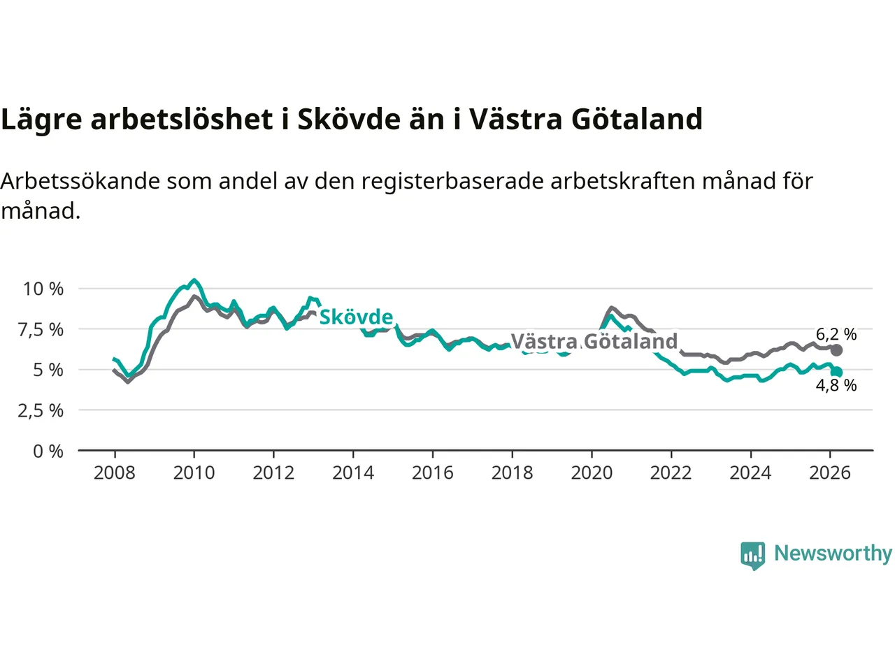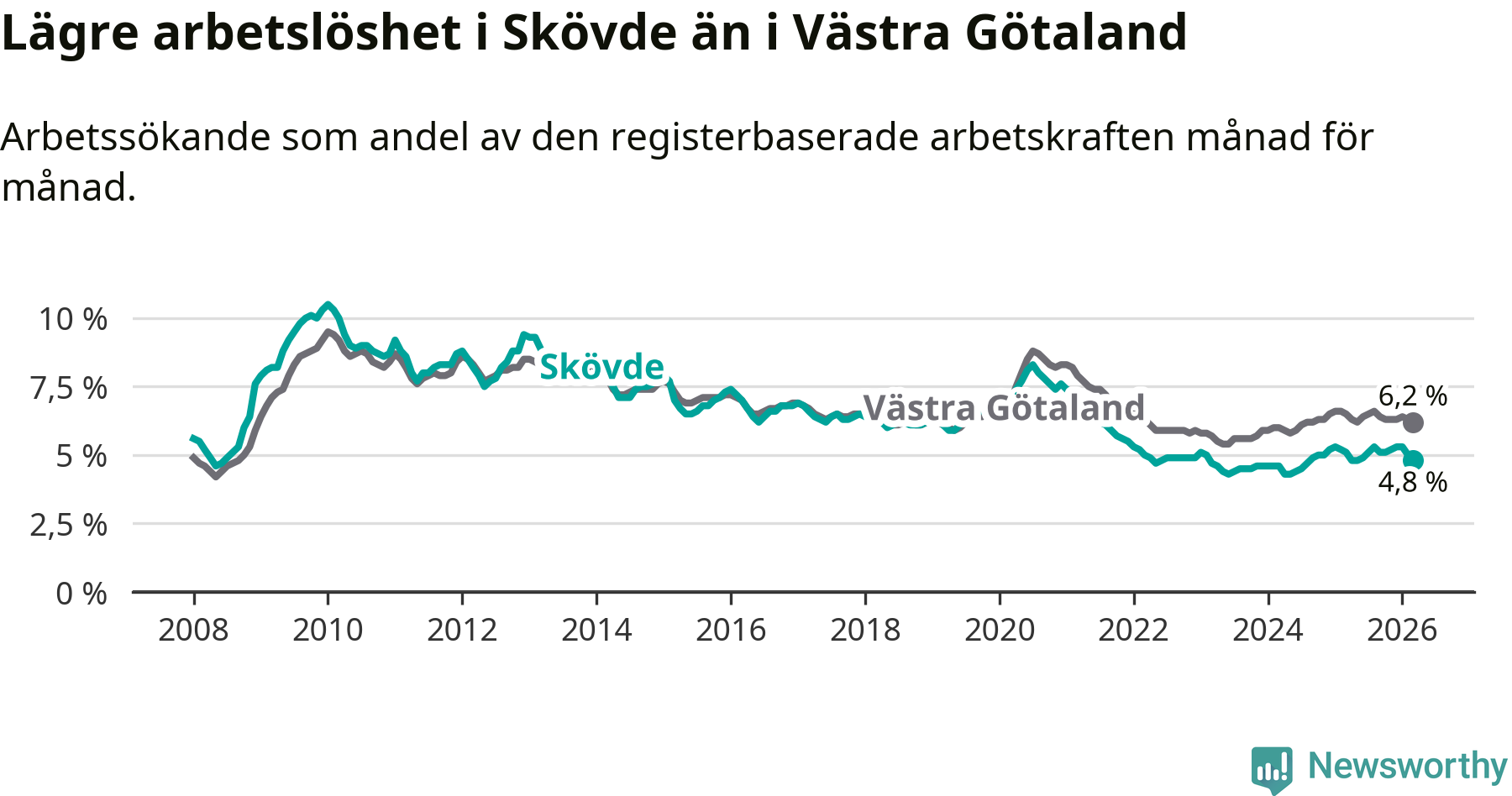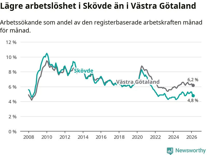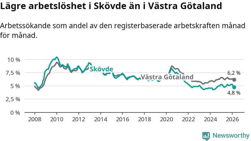 Skövde hade redan tidigare lägre arbetslöshet än snittet i hela Västra Götalands län och nu växer klyftan (4,8 procent i kommunen, jämfört med 6,2 procent i hela länet). Öckerö har den lägsta arbetslösheten i länet (2,6 procent), medan Gullspång har den högsta (8,1 procent). För att Skövde skulle komma ner i samma arbetslöshetsnivå som Öckerö skulle 661 personer behöva sysselsättas.