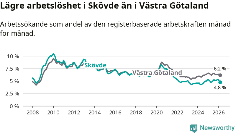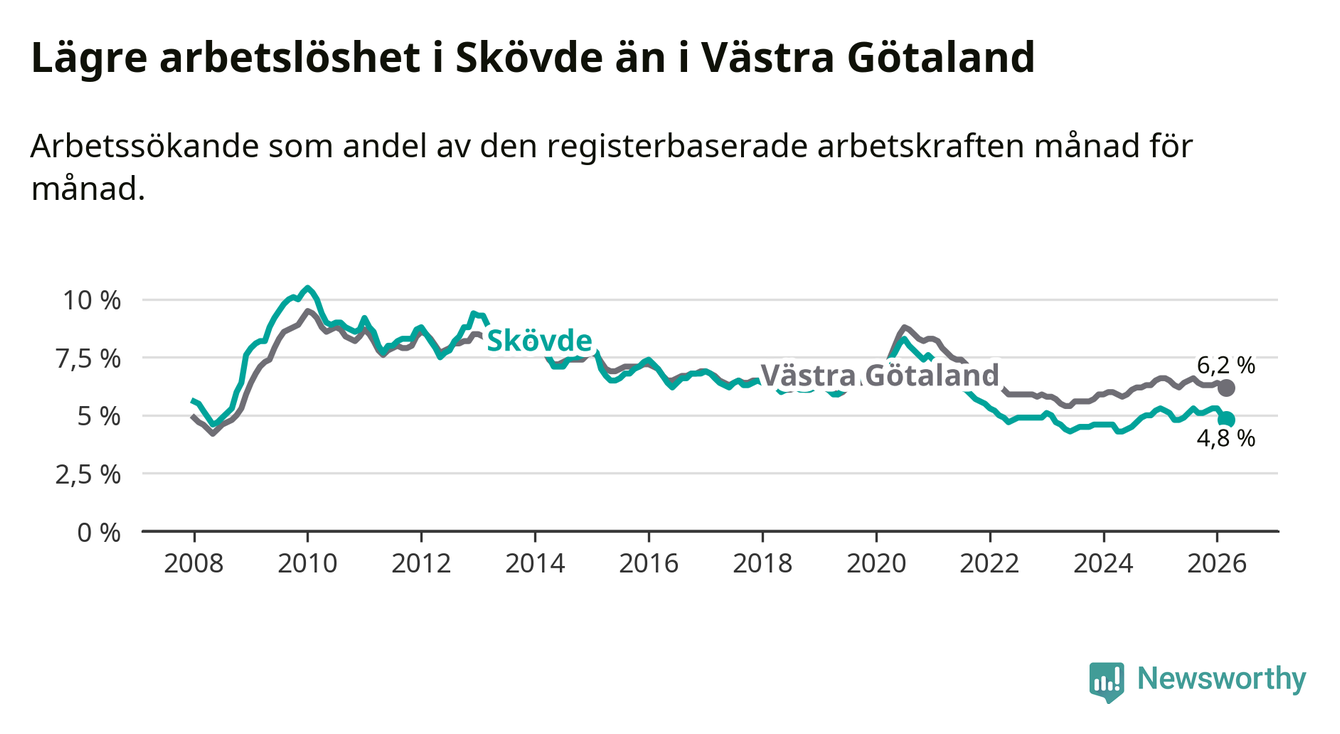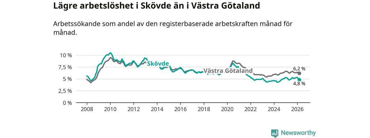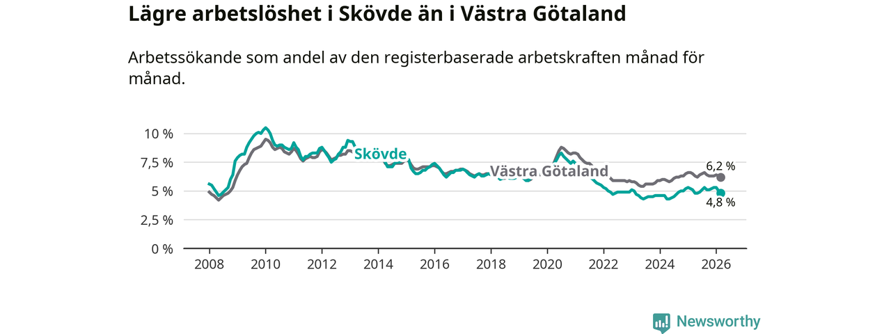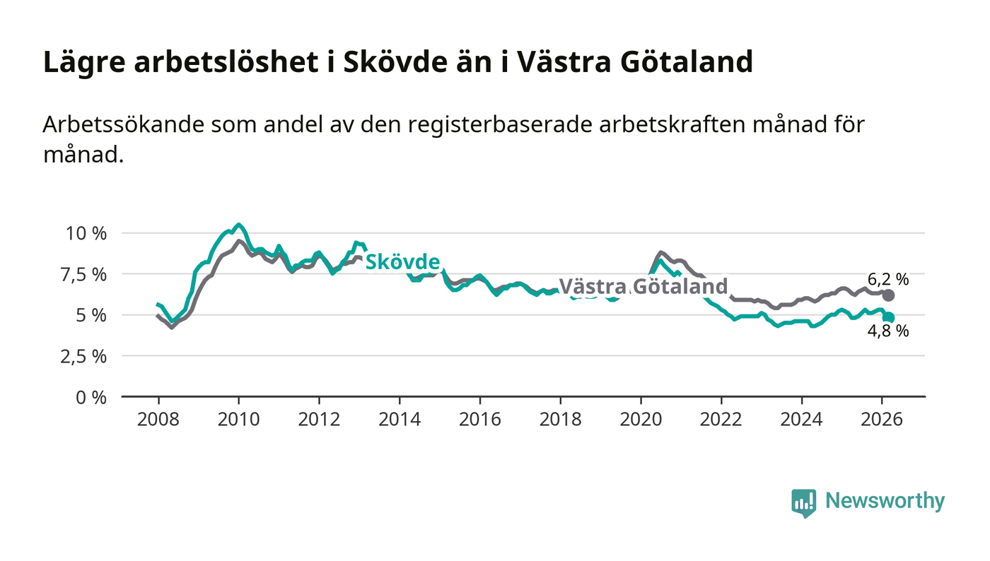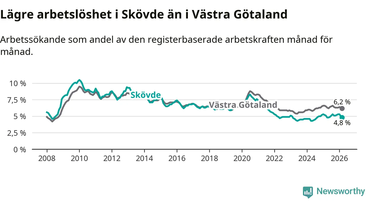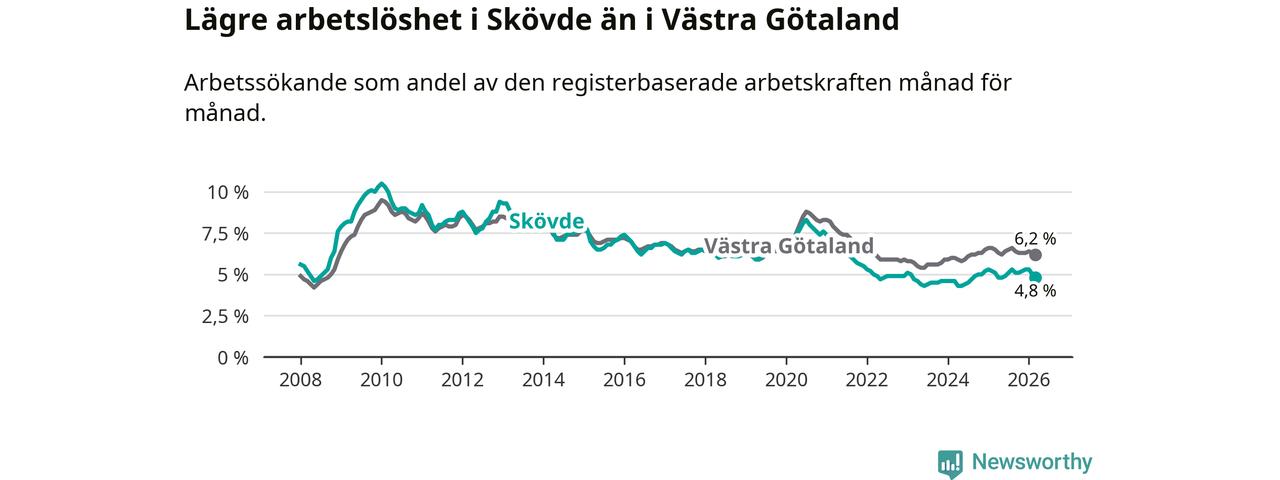 Under mars månad rapporterade Skövde kommun en total arbetslöshet på 4,8 procent. Det är en minskning jämfört med samma tidpunkt i fjol (−0,3 procentenheter). Även i Västra Götalands län sjunker arbetslösheten .