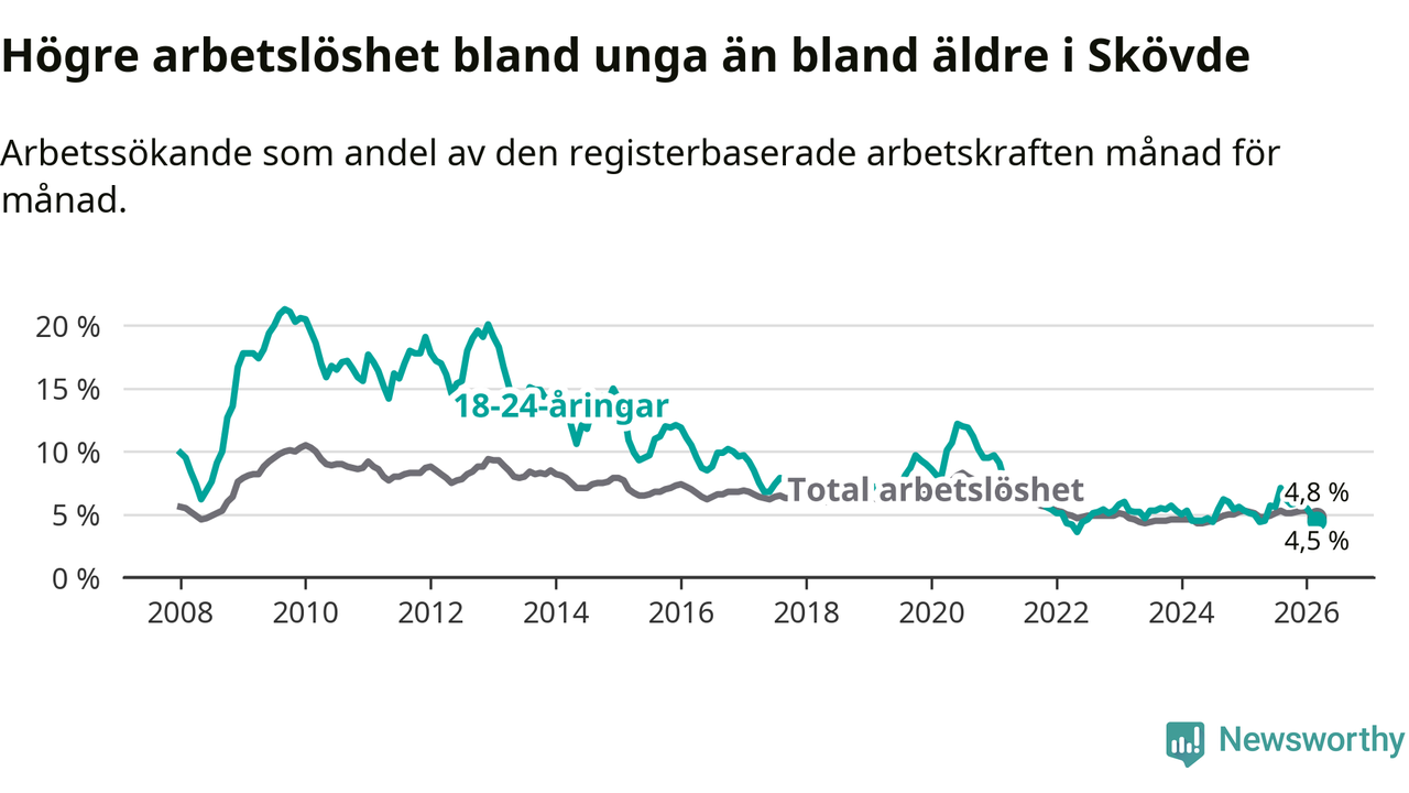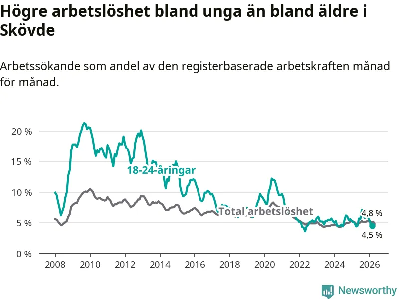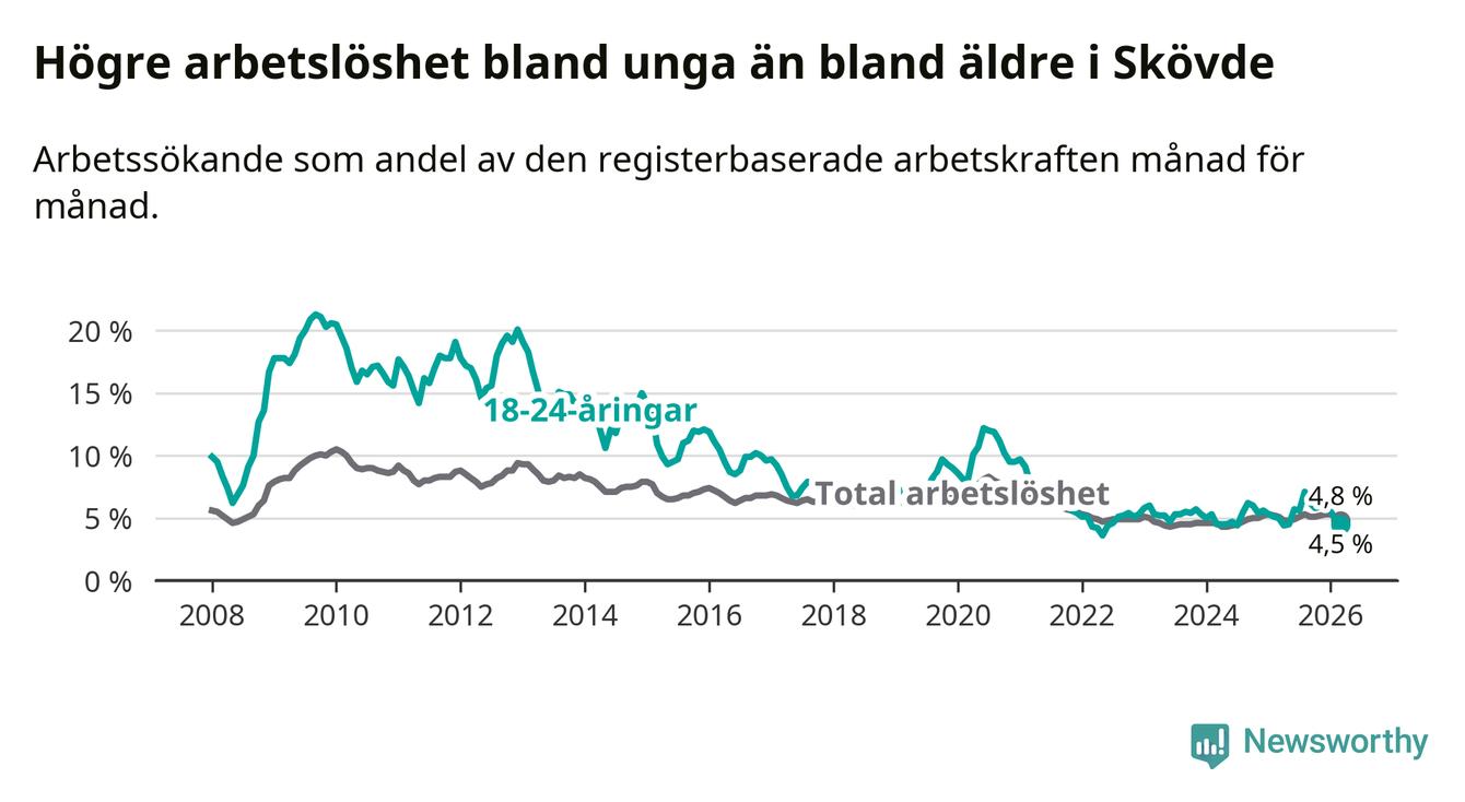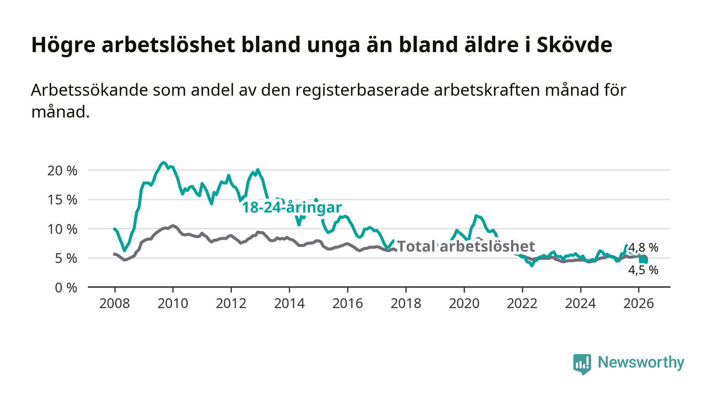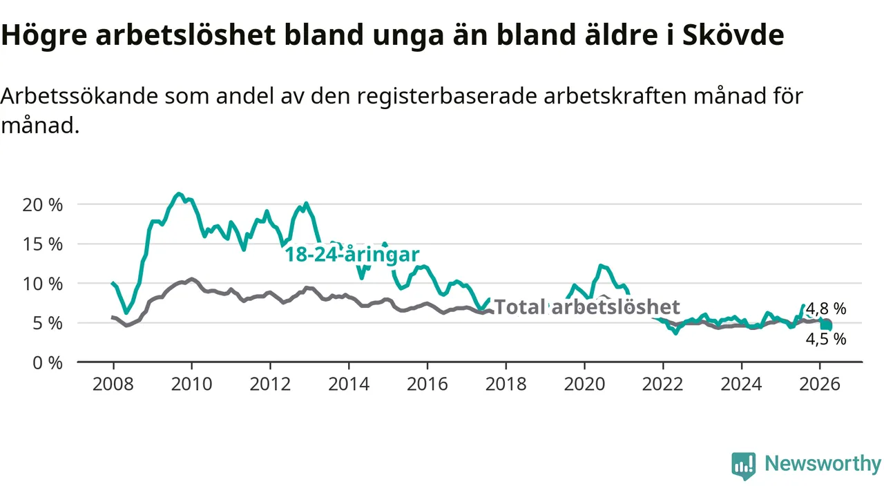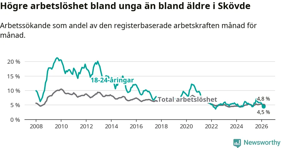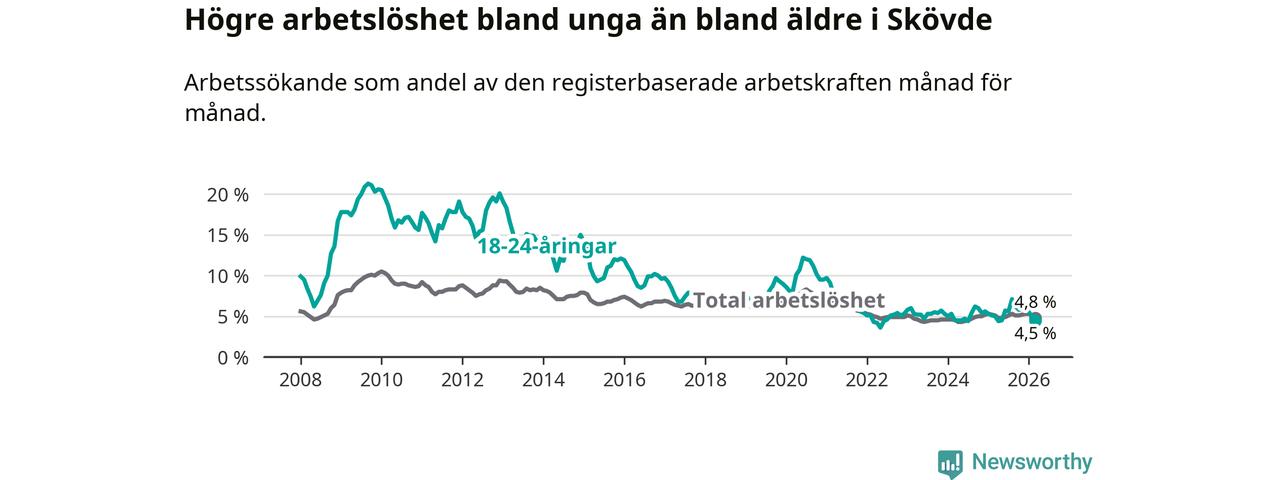 Under mars månad rapporterade Skövde kommun en total arbetslöshet på 4,8 procent. Det är en minskning jämfört med samma tidpunkt i fjol (−0,3 procentenheter). Även i Västra Götalands län sjunker arbetslösheten .