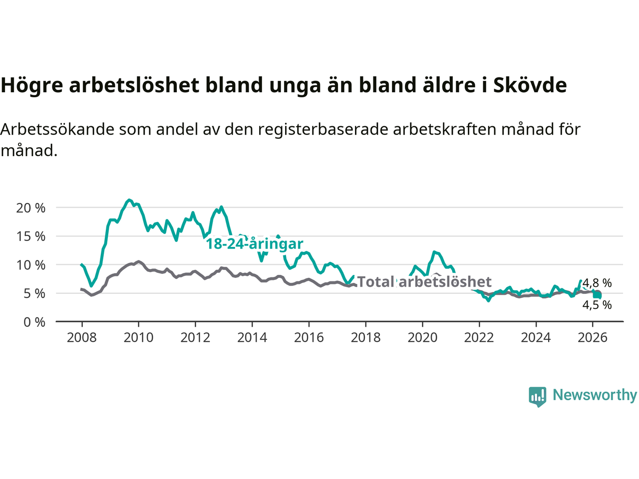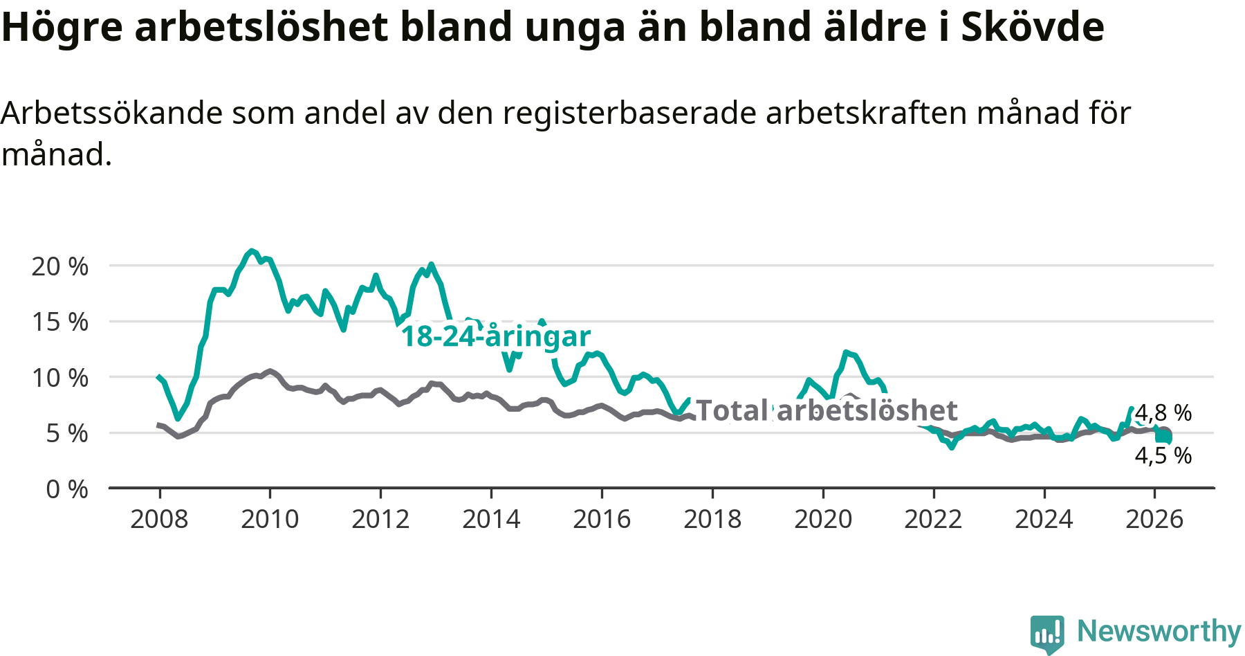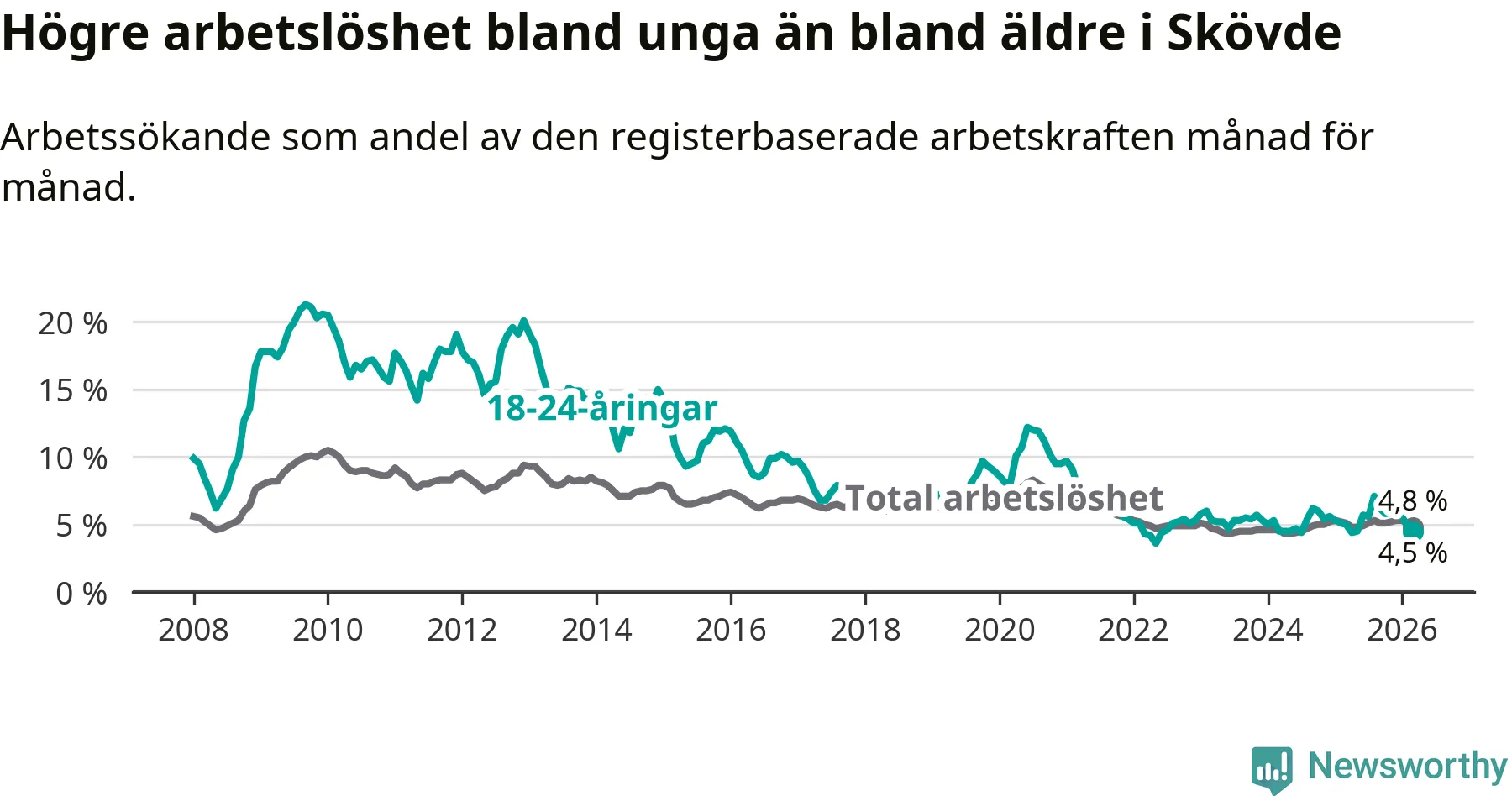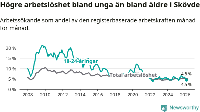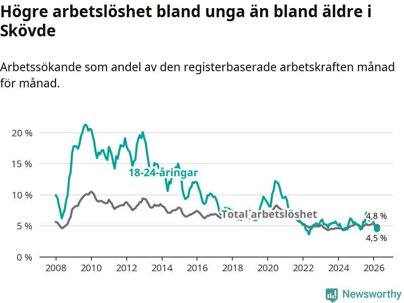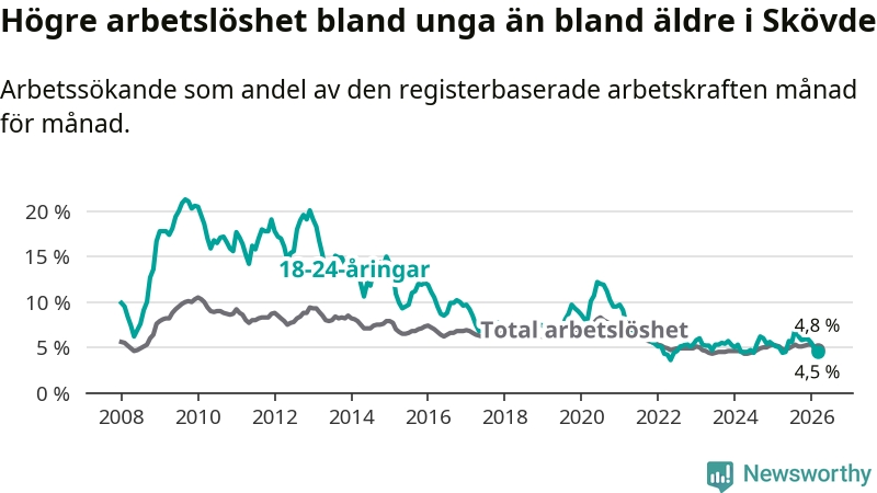 Under mars månad rapporterade Skövde kommun en total arbetslöshet på 4,8 procent. Det är en minskning jämfört med samma tidpunkt i fjol (−0,3 procentenheter). Även i Västra Götalands län sjunker arbetslösheten .
