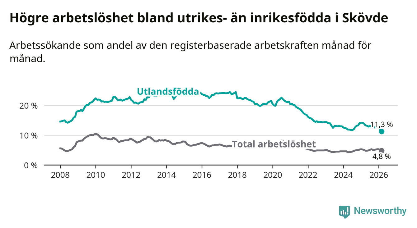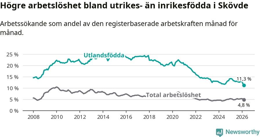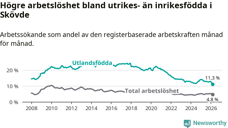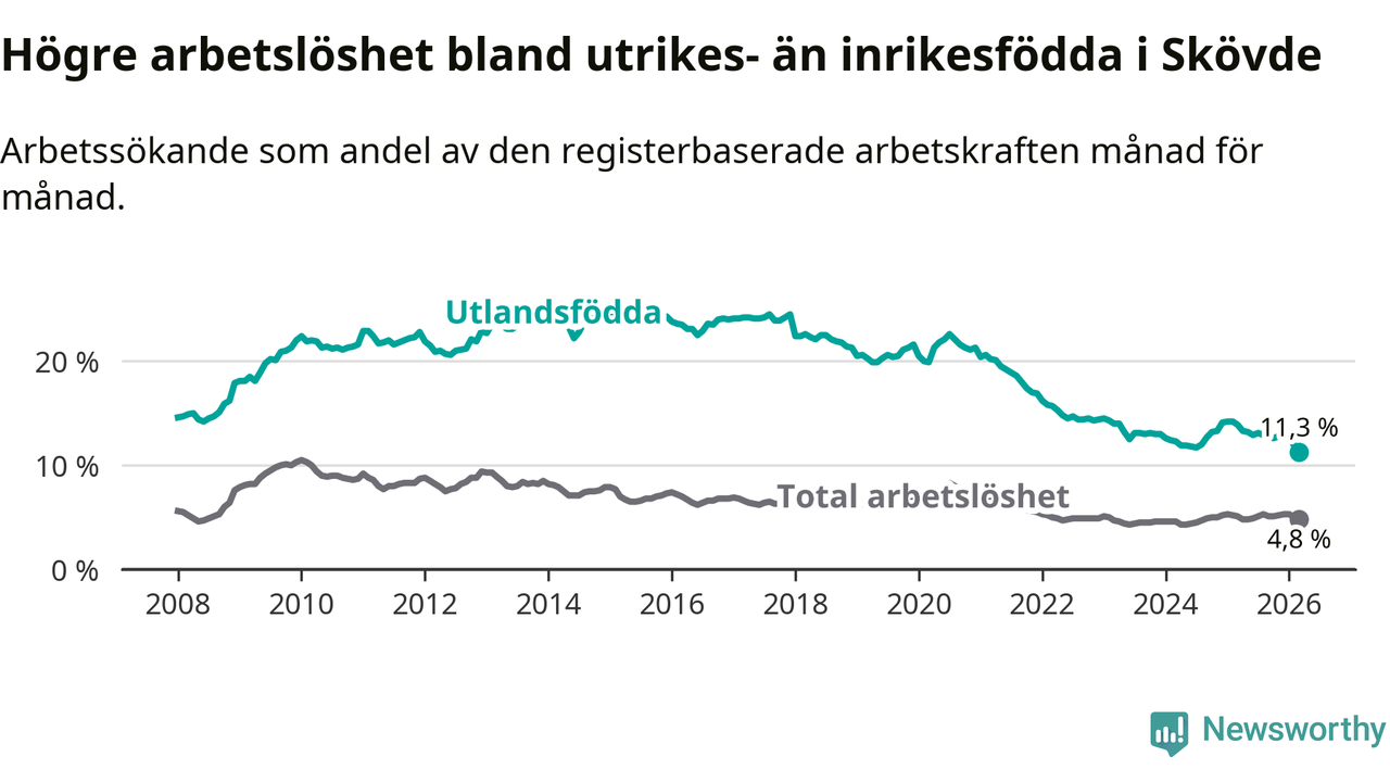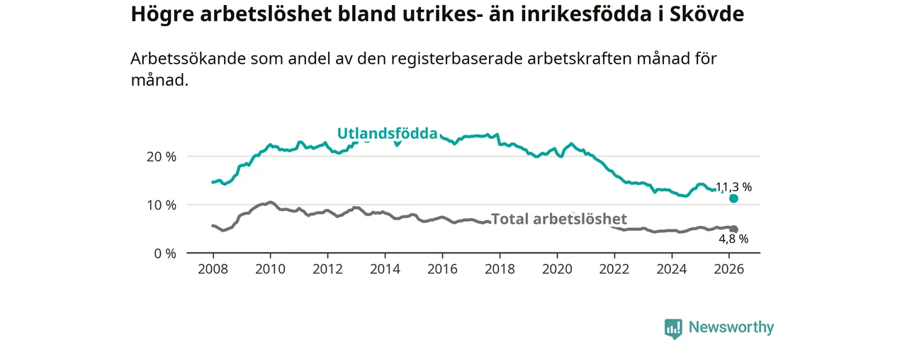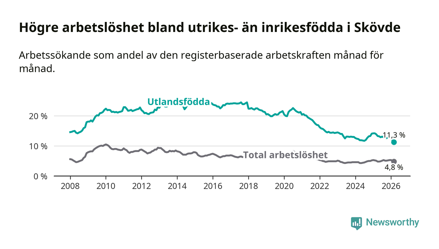 Arbetslösheten bland utlandsfödda var 11,3 procent i Skövde under mars månad, motsvarande 673 av 5 956 personer. Det är 2,6 procentenheter färre än vid samma tidpunkt i fjol (−131 om man räknar personer). Därmed är de utlandsföddas arbetslöshet lägre än vid samma tidpunkt i fjol för sjätte månaden i följd. Sedan september 2025 har arbetslösheten bland utlandsfödda minskat från 12,8 till 11,3 procent. Den nuvarande arbetslöshetsnivån är den lägsta sedan januari 2008.