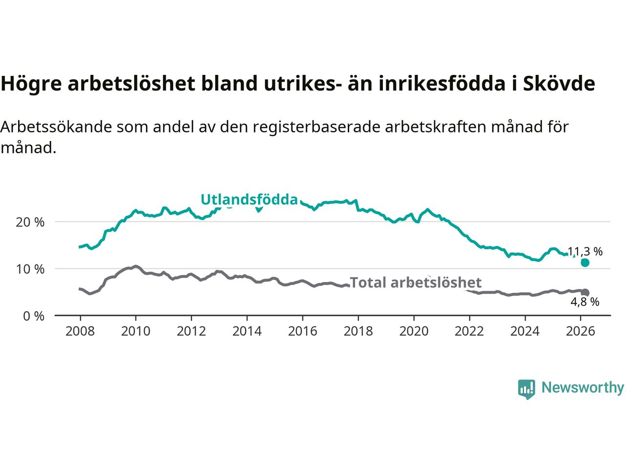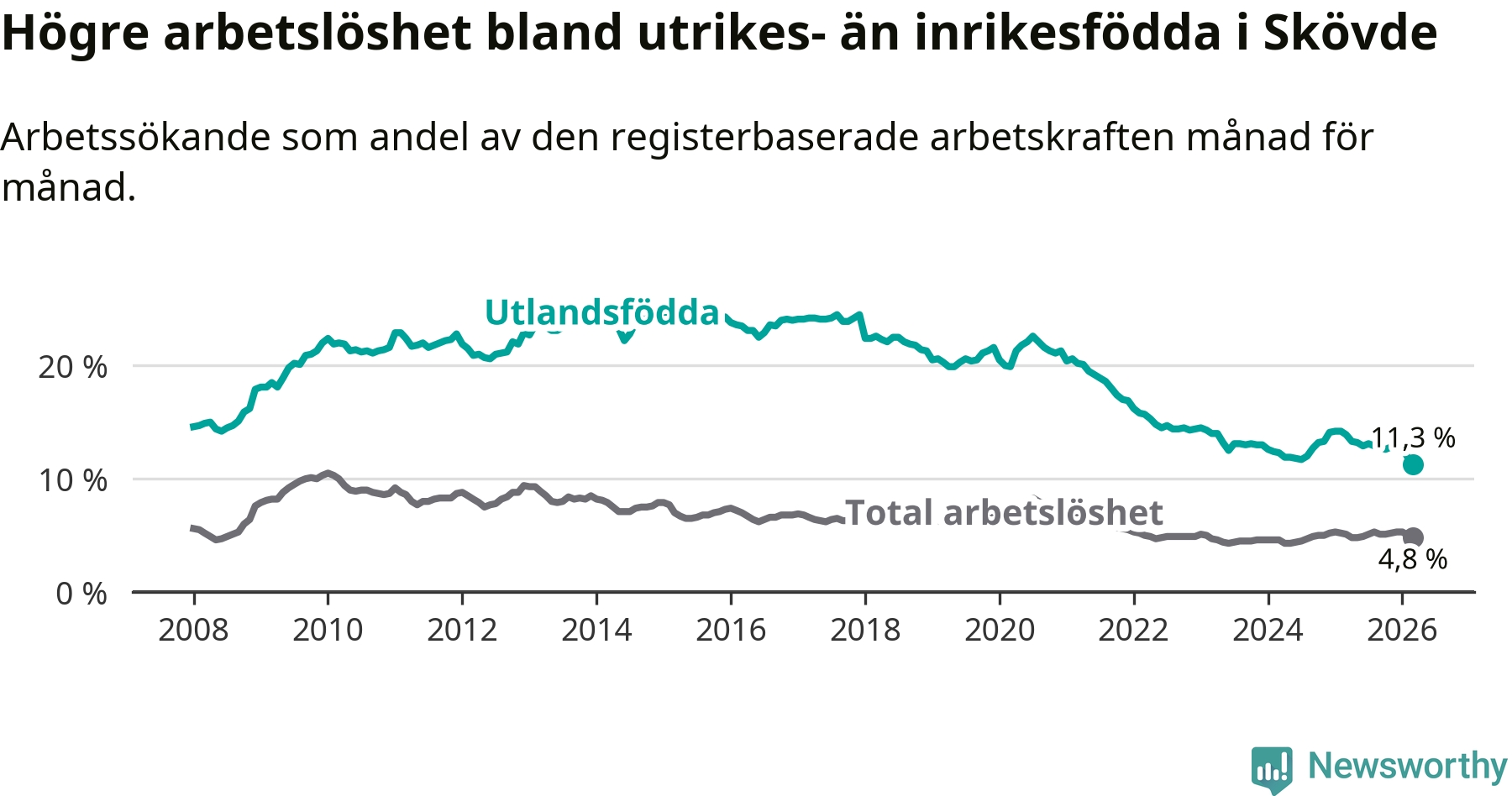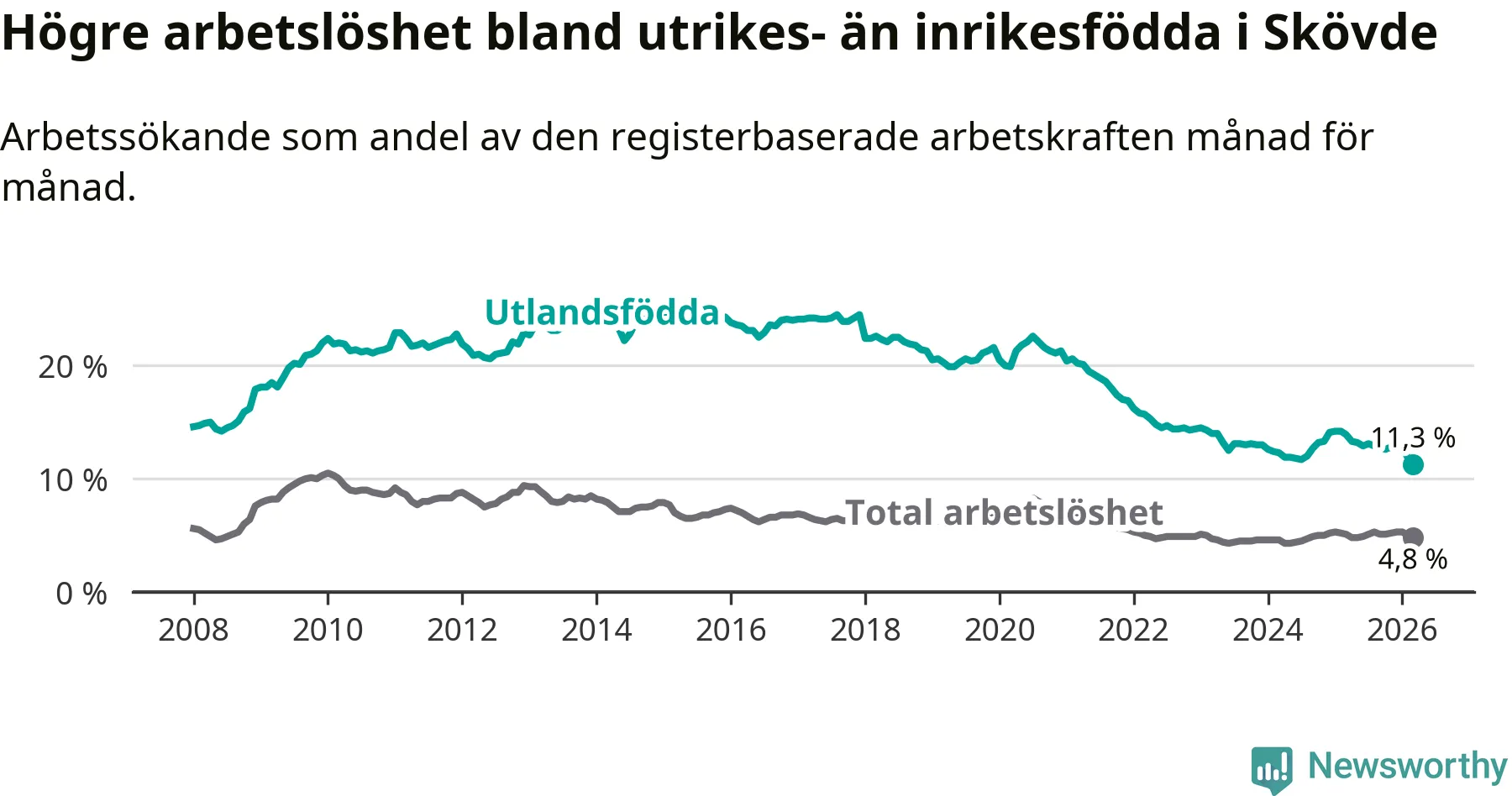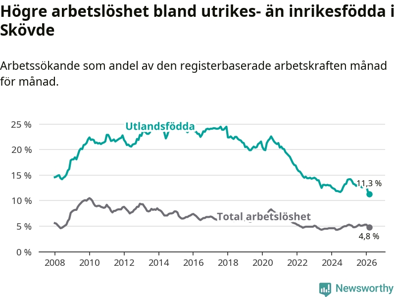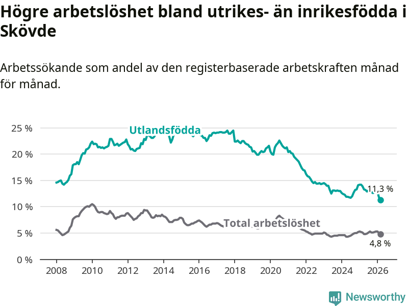 Arbetslösheten bland utlandsfödda var 11,3 procent i Skövde under mars månad, motsvarande 673 av 5 956 personer. Det är 2,6 procentenheter färre än vid samma tidpunkt i fjol (−131 om man räknar personer). Därmed är de utlandsföddas arbetslöshet lägre än vid samma tidpunkt i fjol för sjätte månaden i följd. Sedan september 2025 har arbetslösheten bland utlandsfödda minskat från 12,8 till 11,3 procent. Den nuvarande arbetslöshetsnivån är den lägsta sedan januari 2008.