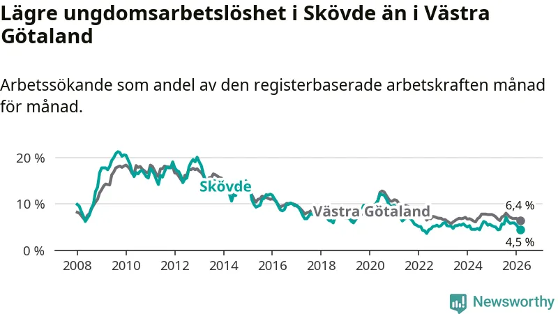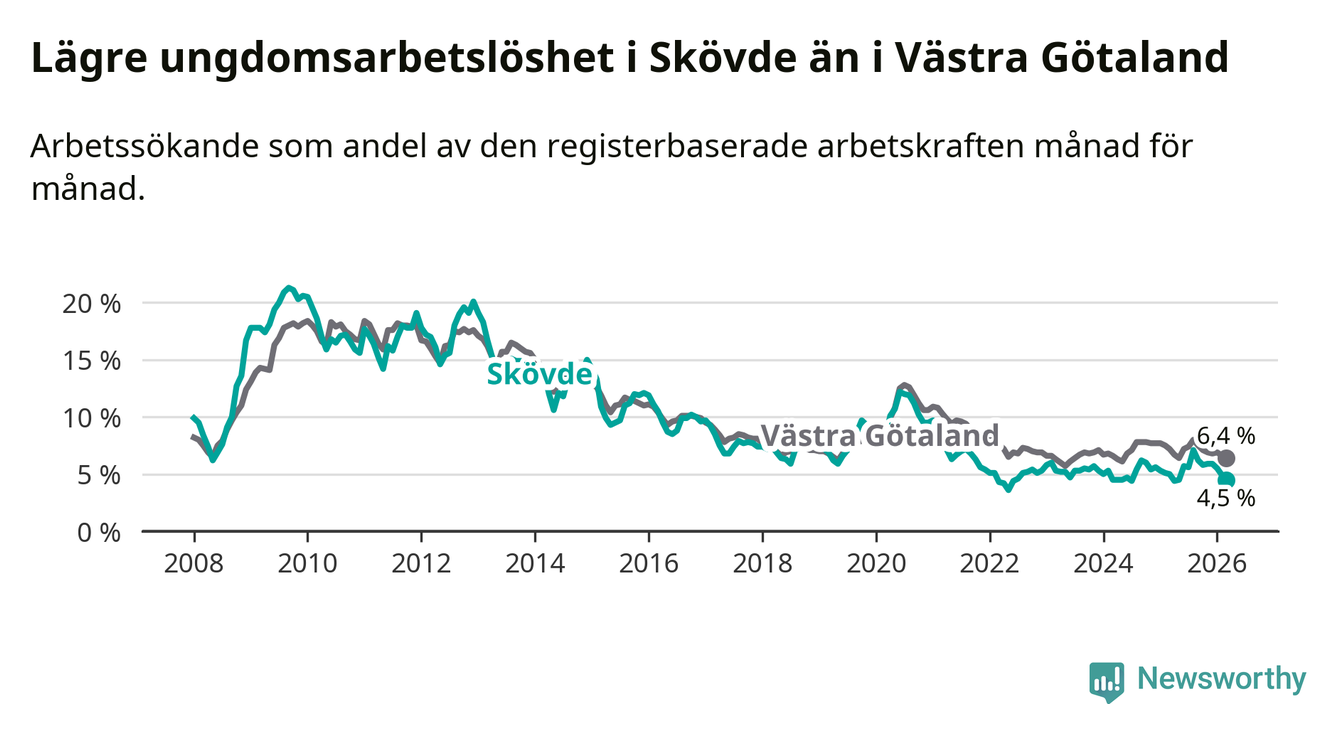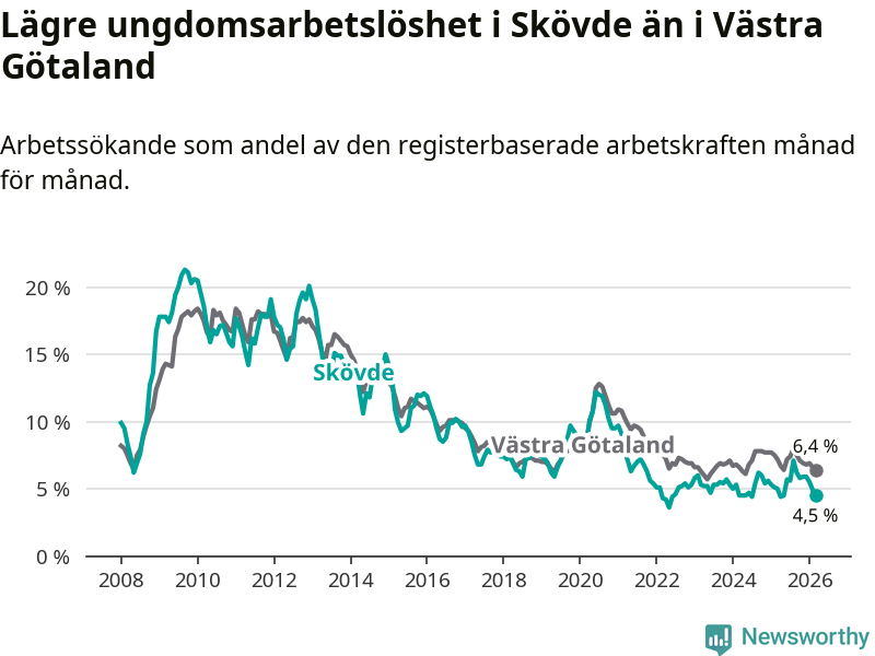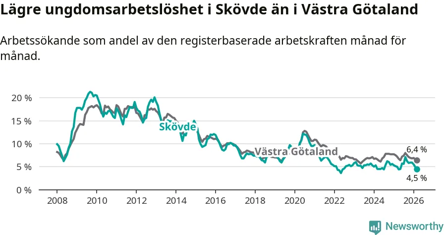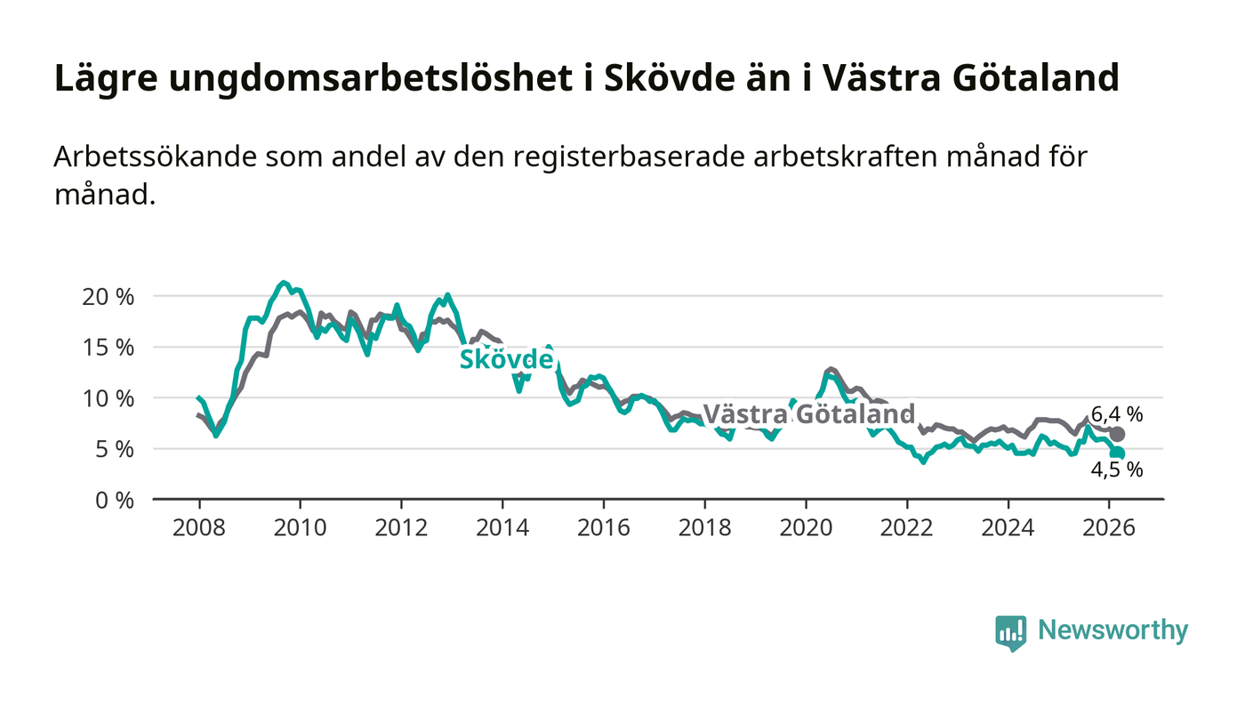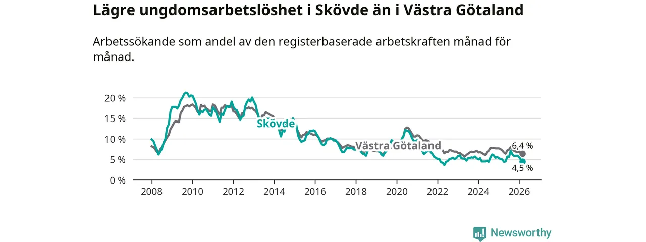 Precis som den totala arbetslösheten ligger ungdomsarbetslösheten i Skövde lägre än i Västra Götaland som helhet. Skillnaden mellan kommunen och länet är 1,9 procentenheter.
