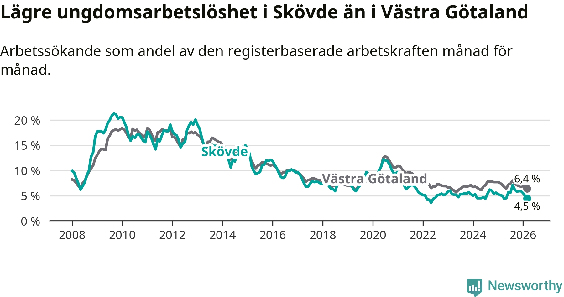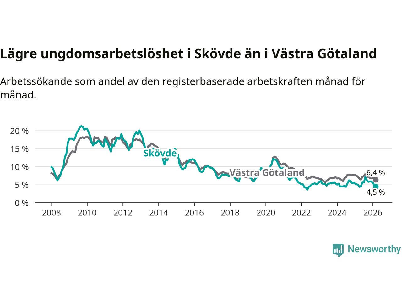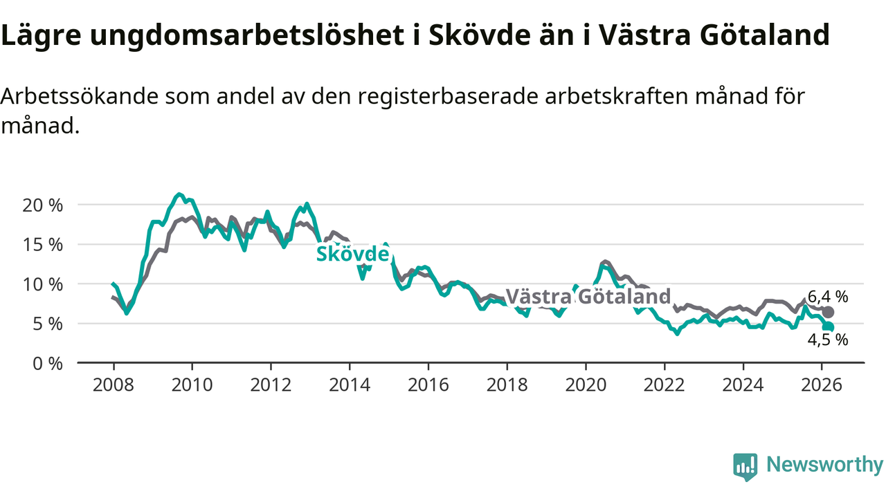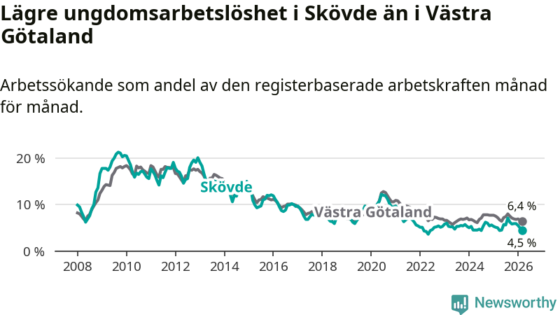 Precis som den totala arbetslösheten ligger ungdomsarbetslösheten i Skövde lägre än i Västra Götaland som helhet. Skillnaden mellan kommunen och länet är 1,9 procentenheter.