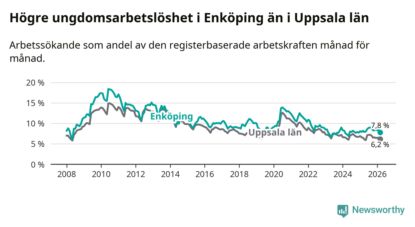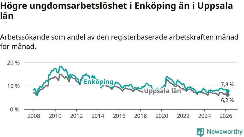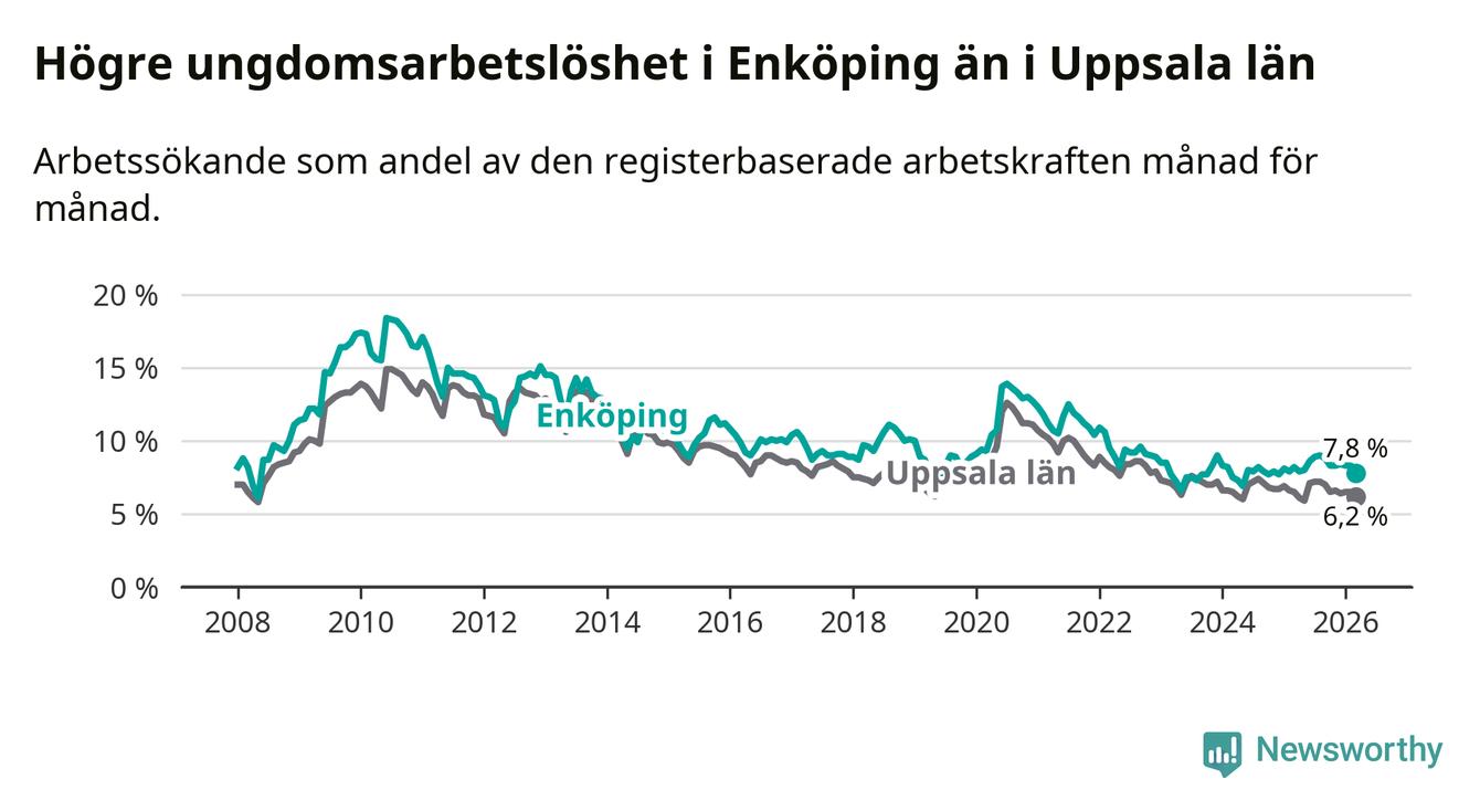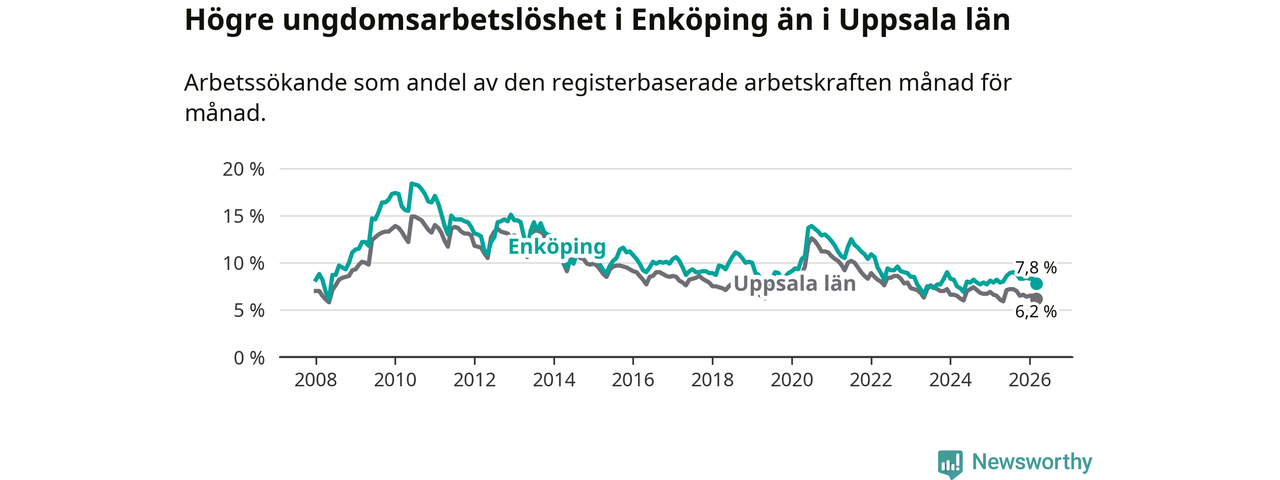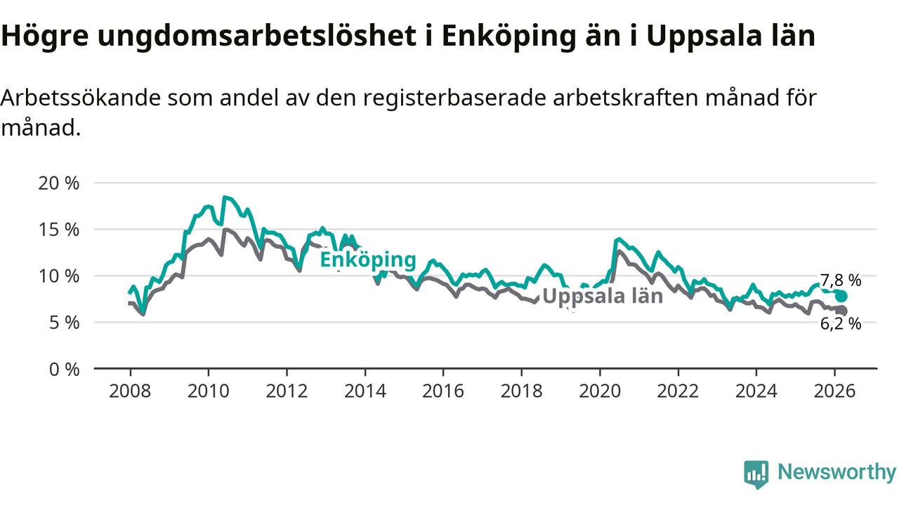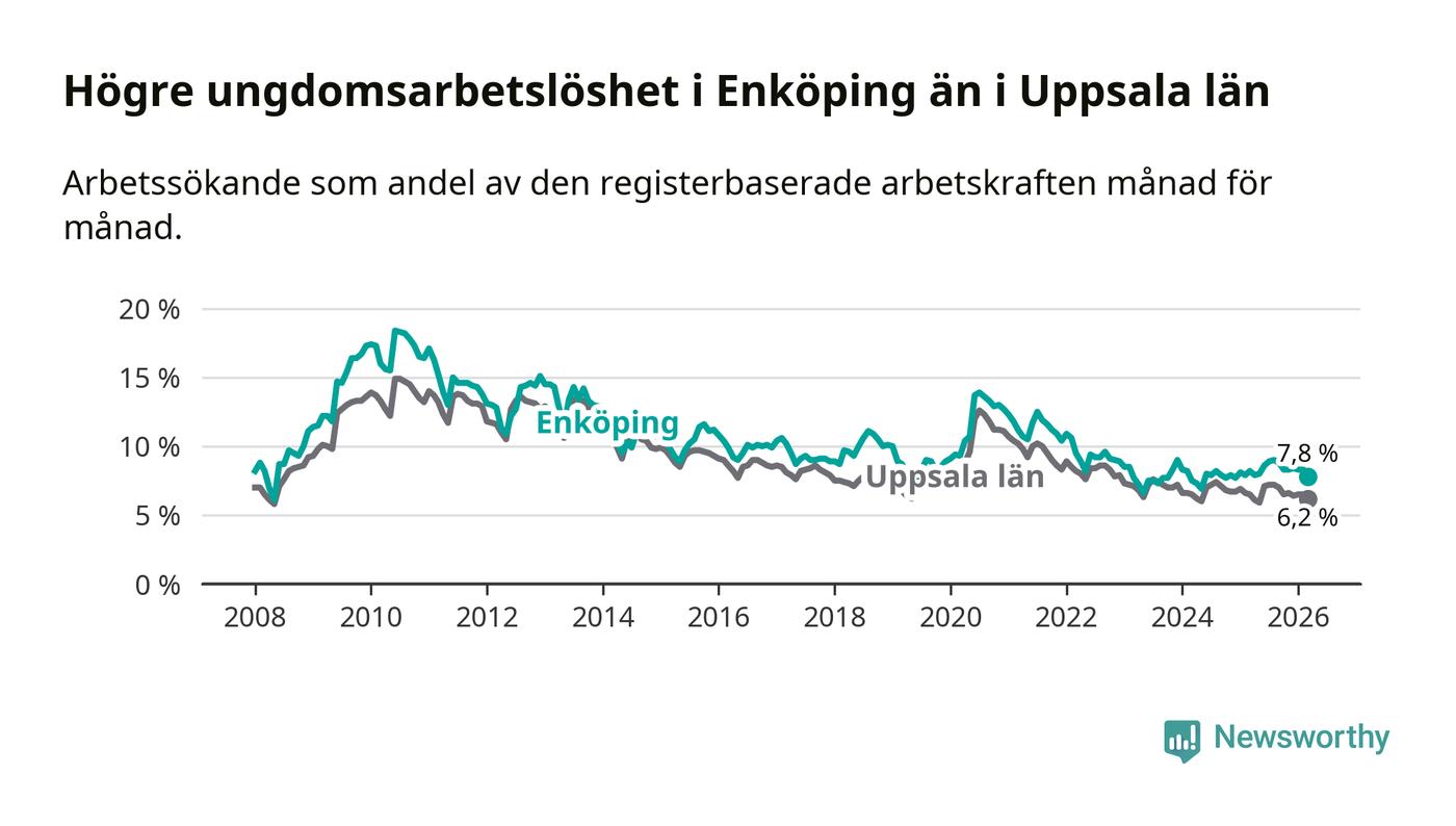 Precis som den totala arbetslösheten ligger ungdomsarbetslösheten i Enköping högre än i Uppsala som helhet. Skillnaden mellan kommunen och länet är 1,6 procentenheter.