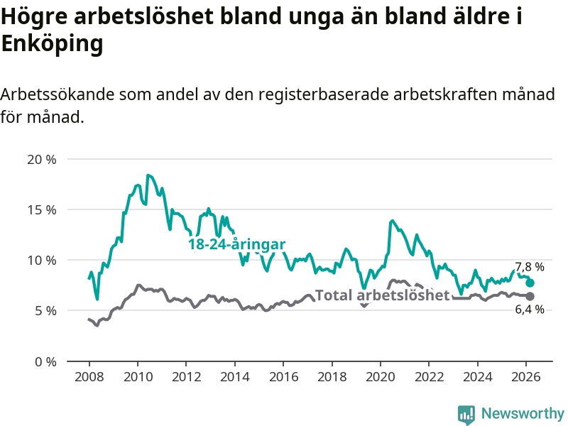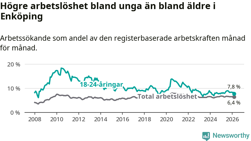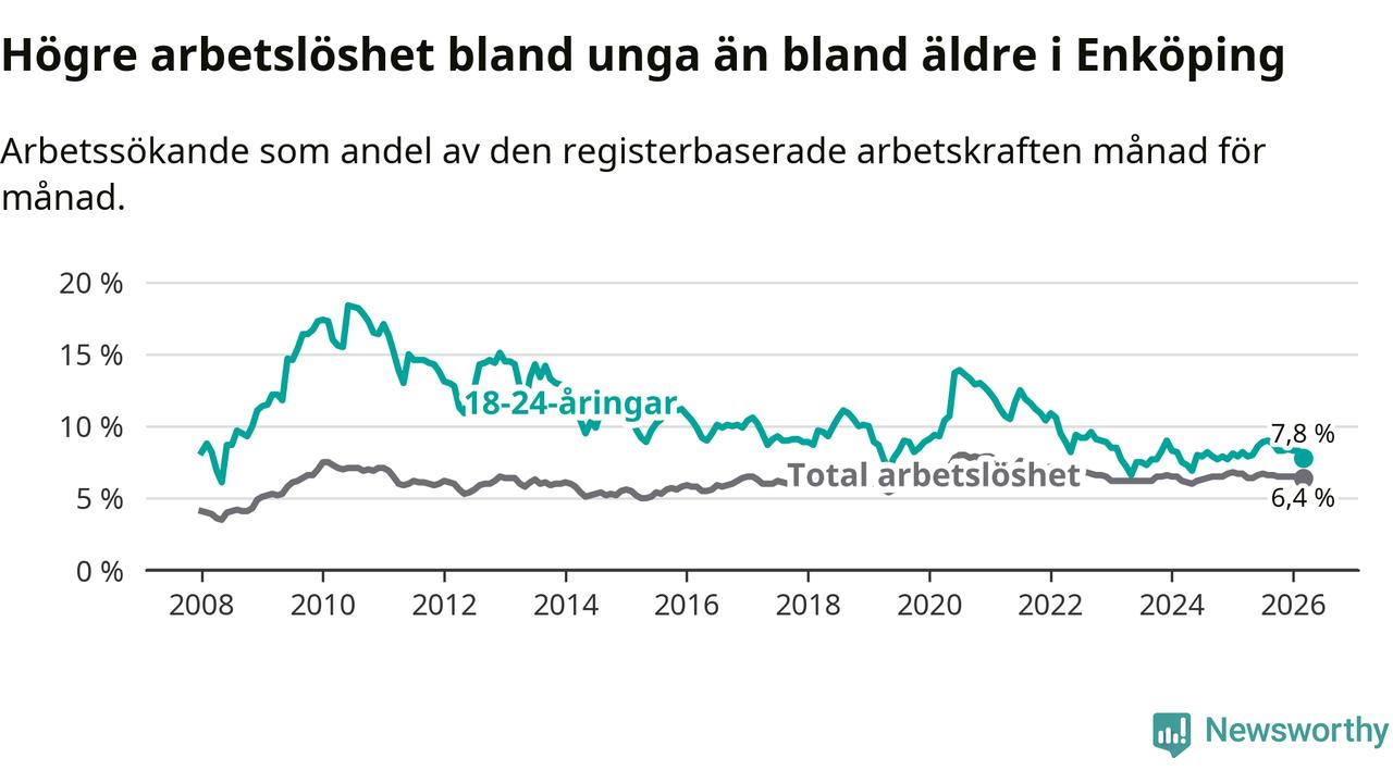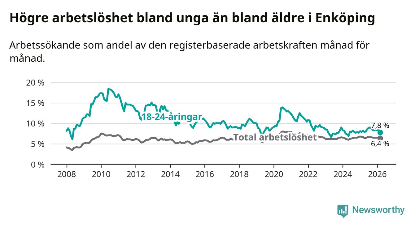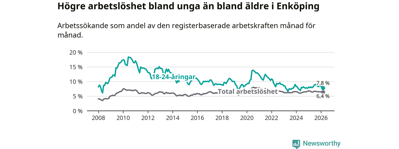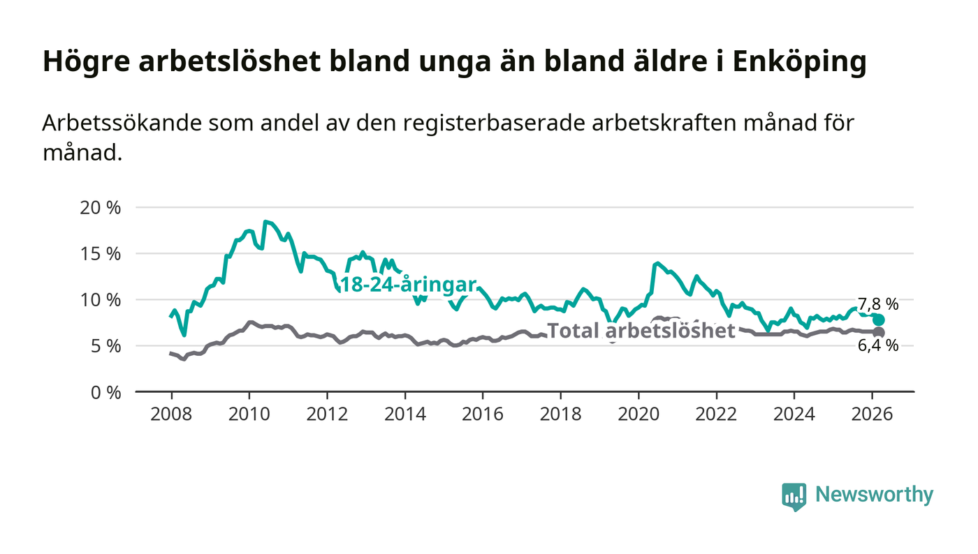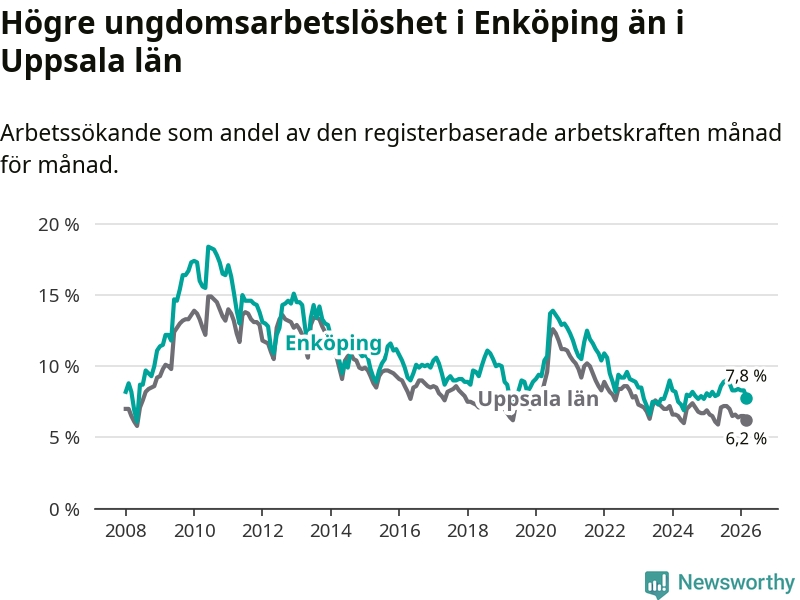 Precis som den totala arbetslösheten ligger ungdomsarbetslösheten i Enköping högre än i Uppsala som helhet. Skillnaden mellan kommunen och länet är 1,6 procentenheter.