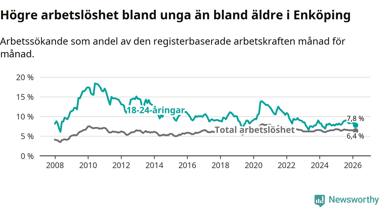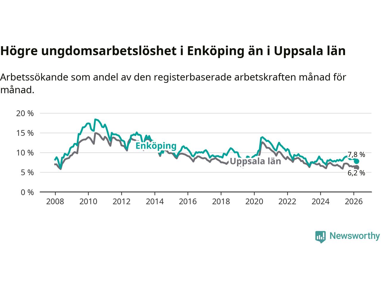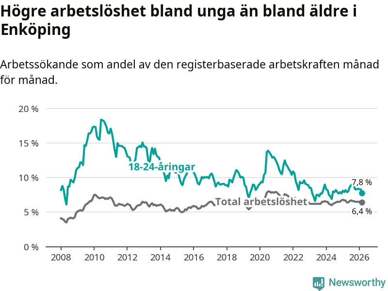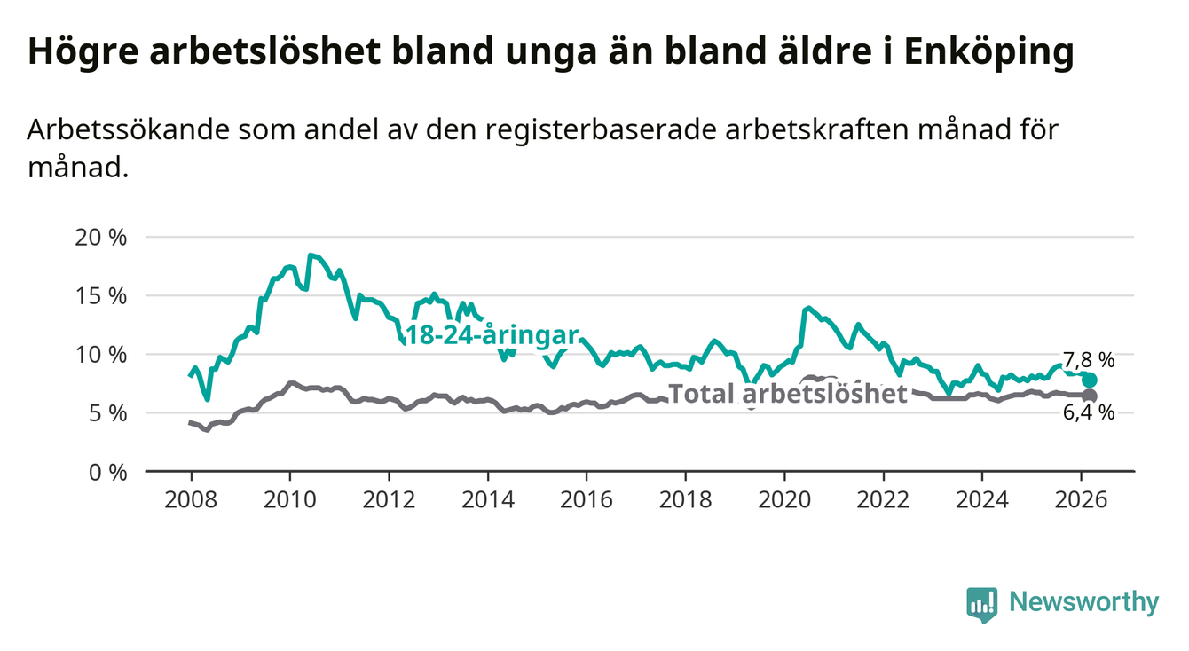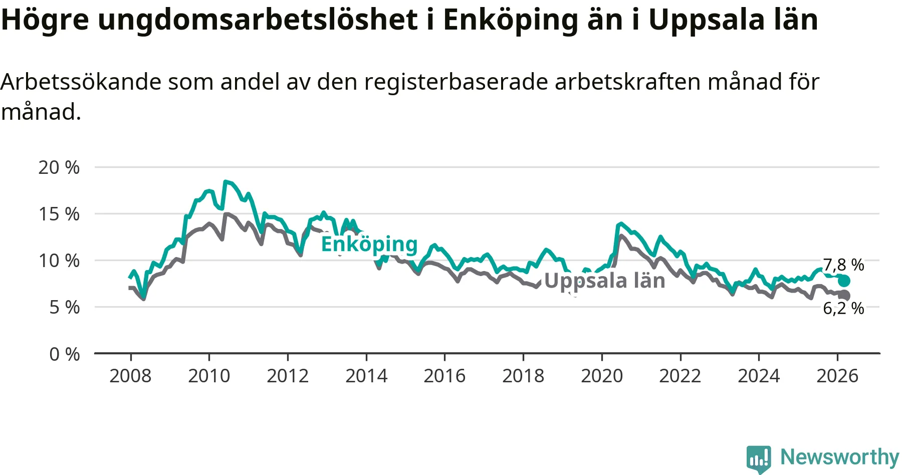 Precis som den totala arbetslösheten ligger ungdomsarbetslösheten i Enköping högre än i Uppsala som helhet. Skillnaden mellan kommunen och länet är 1,6 procentenheter.