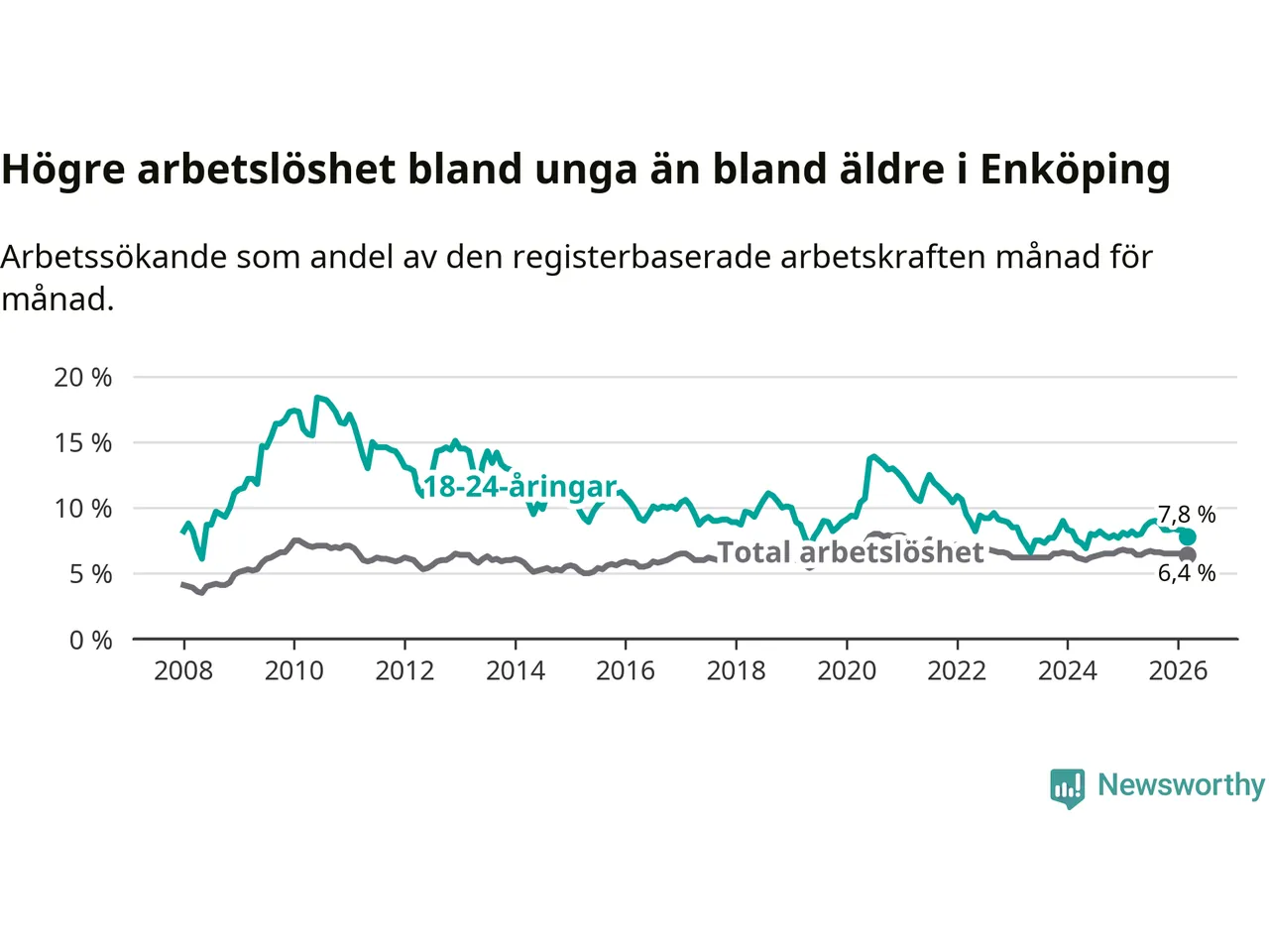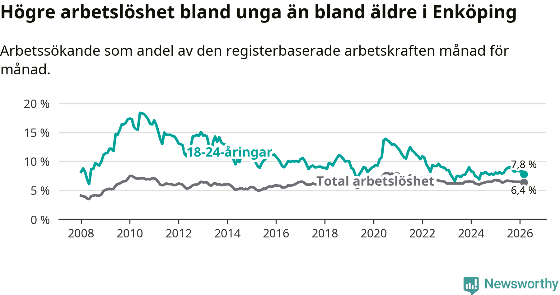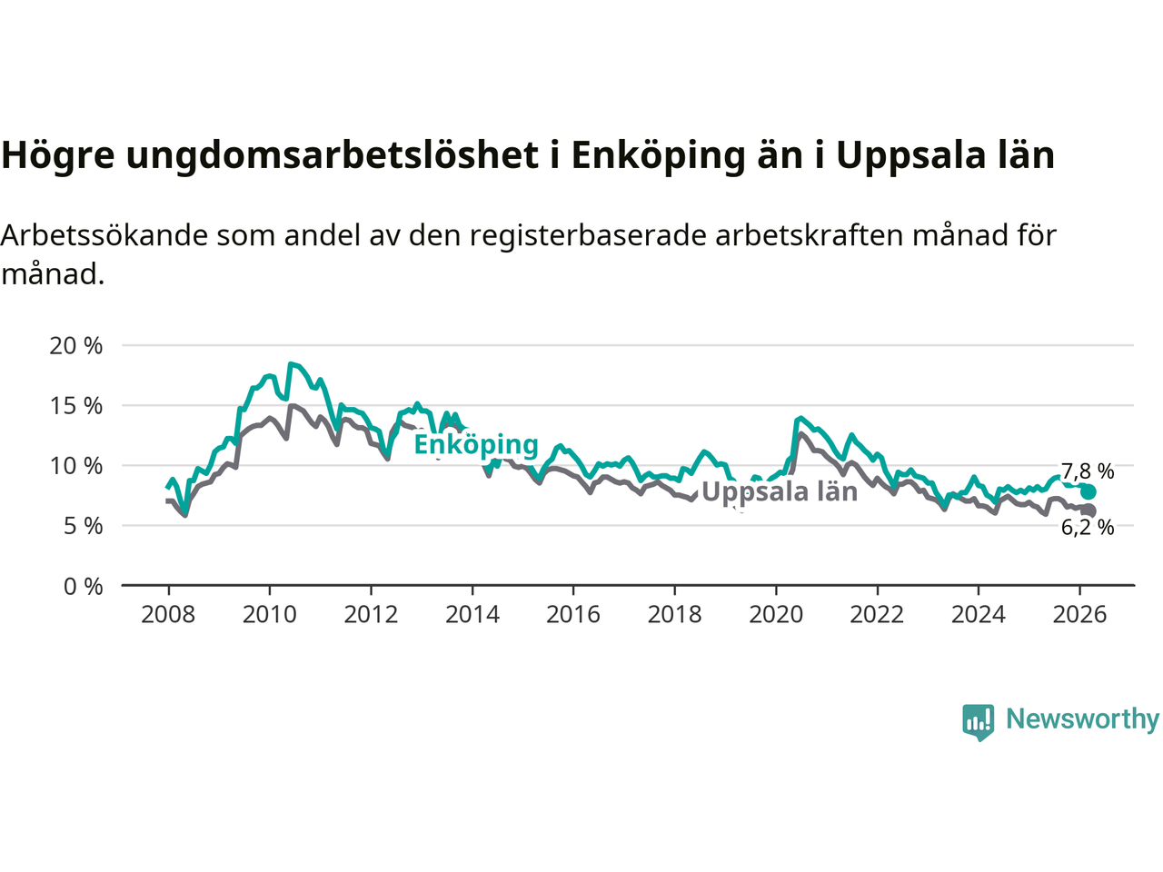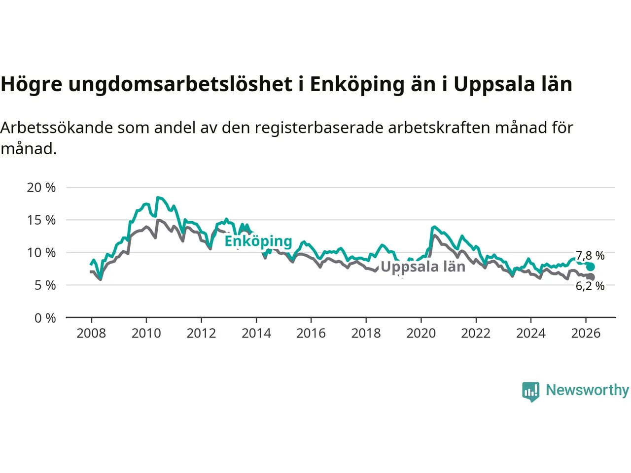 Precis som den totala arbetslösheten ligger ungdomsarbetslösheten i Enköping högre än i Uppsala som helhet. Skillnaden mellan kommunen och länet är 1,6 procentenheter.