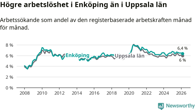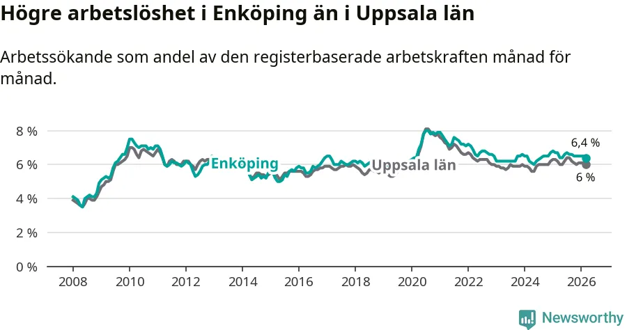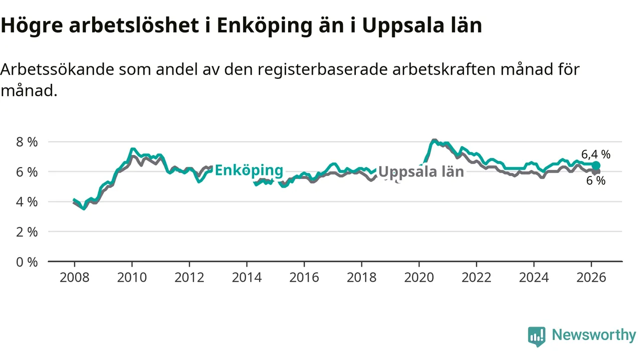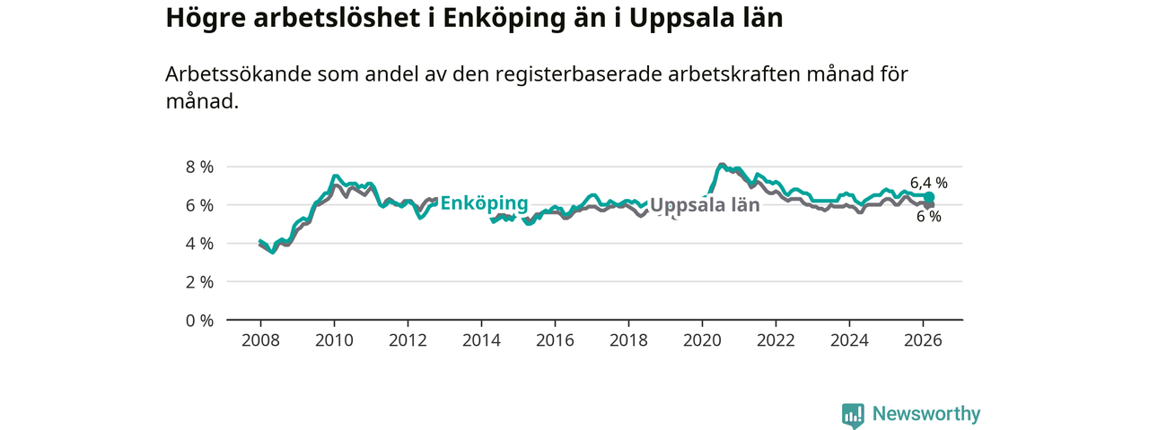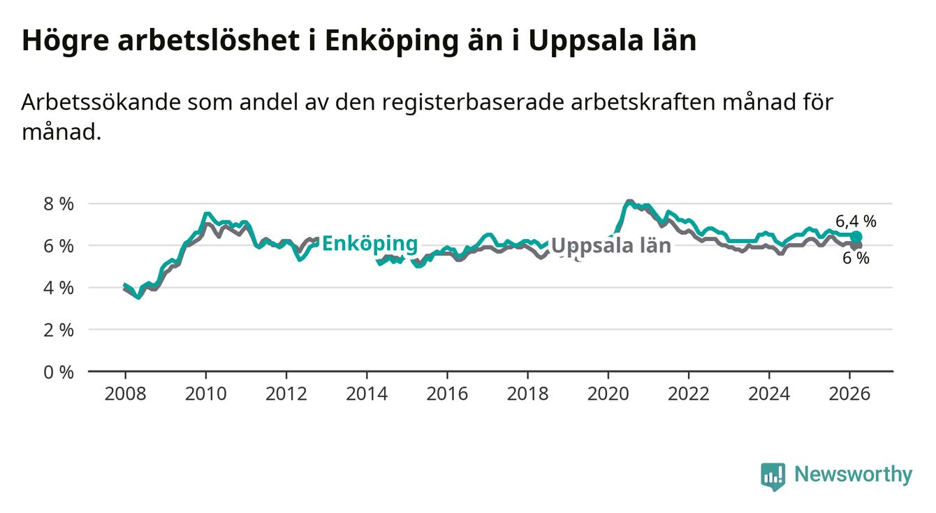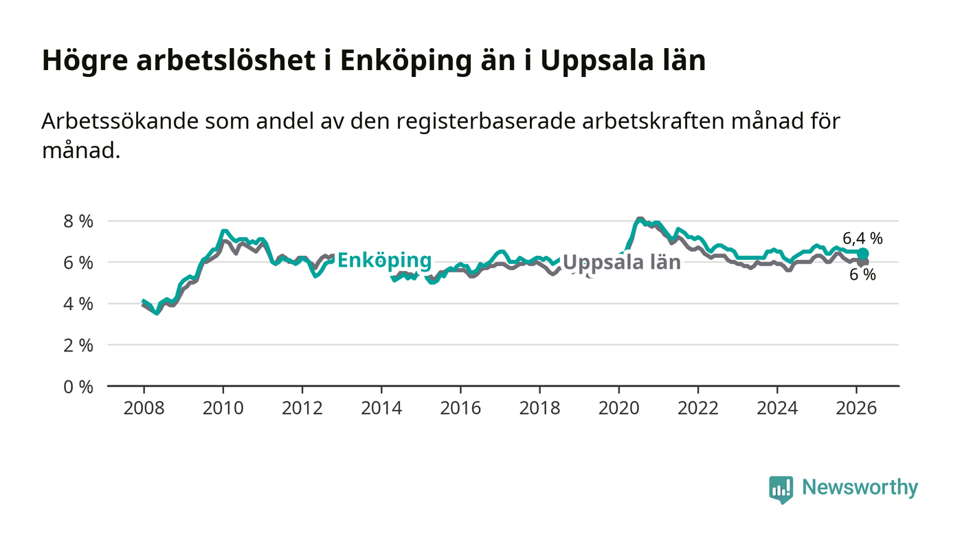 Under mars månad rapporterade Enköpings kommun en total arbetslöshet på 6,4 procent. Det är en minskning jämfört med samma tidpunkt i fjol (−0,3 procentenheter). Även i Uppsala län sjunker arbetslösheten .