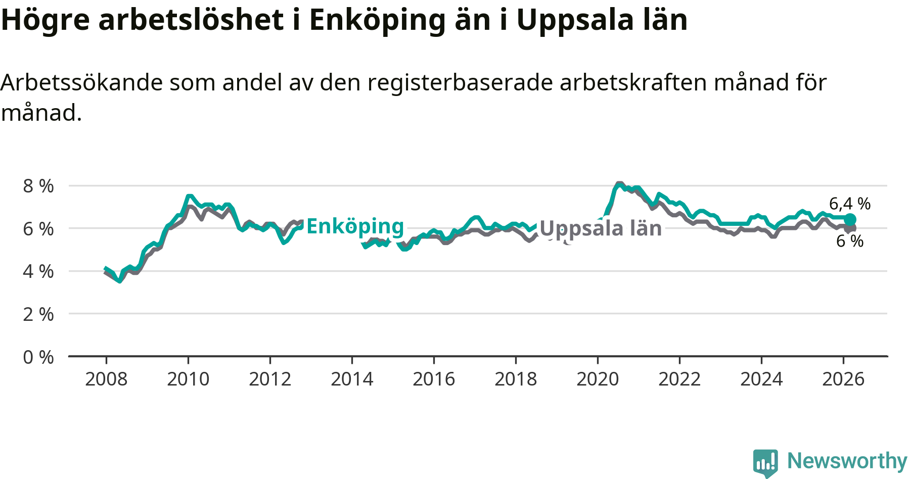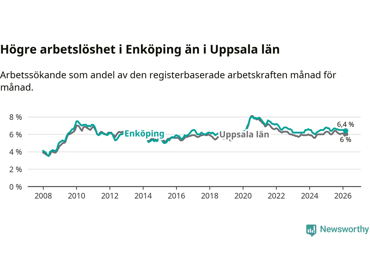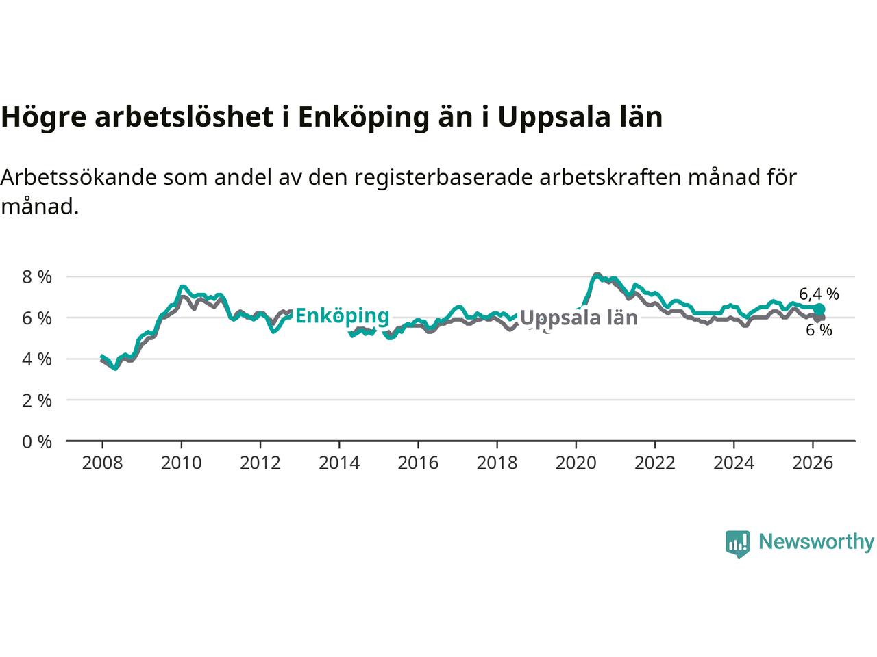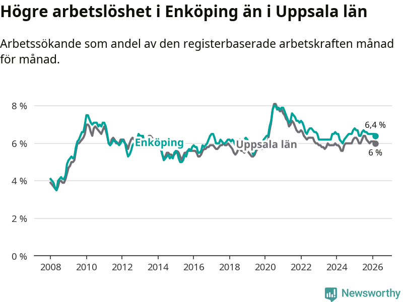 Under mars månad rapporterade Enköpings kommun en total arbetslöshet på 6,4 procent. Det är en minskning jämfört med samma tidpunkt i fjol (−0,3 procentenheter). Även i Uppsala län sjunker arbetslösheten .