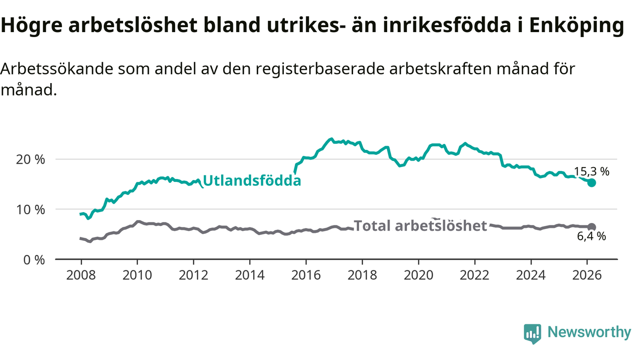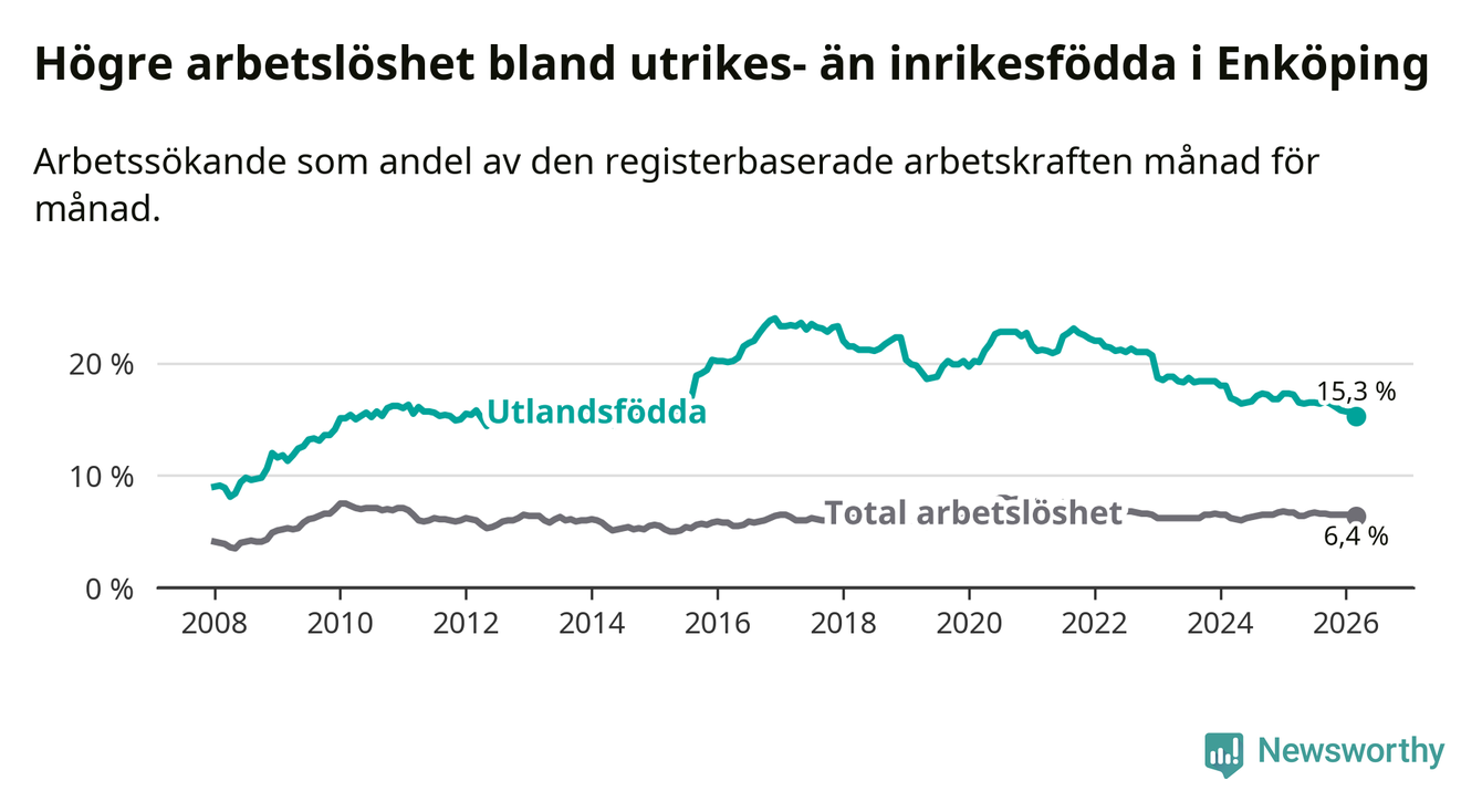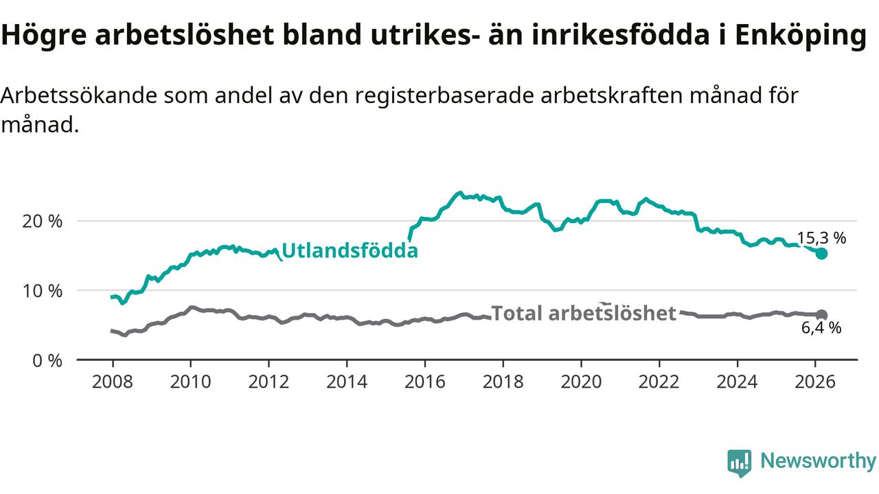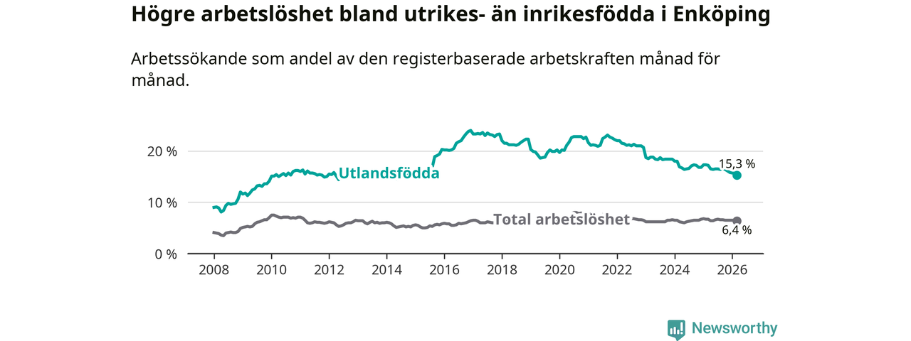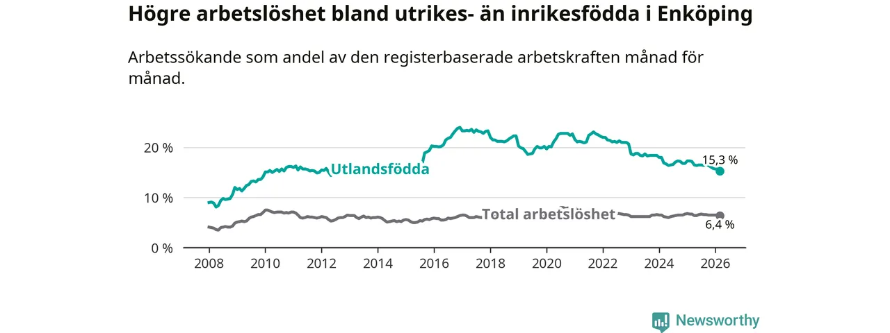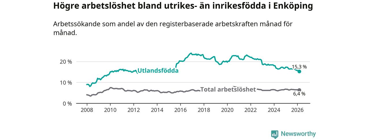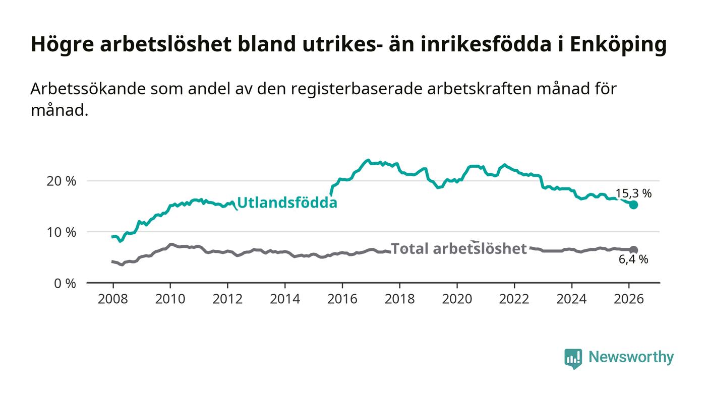 Arbetslösheten bland utlandsfödda var 15,3 procent i Enköping under mars månad, motsvarande 767 av 5 013 personer. Det är 1,9 procentenheter färre än vid samma tidpunkt i fjol (−79 om man räknar personer). Därmed är de utlandsföddas arbetslöshet lägre än vid samma tidpunkt i fjol för nionde månaden i följd. Sedan juni 2025 har arbetslösheten bland utlandsfödda minskat från 16,5 till 15,3 procent. Den nuvarande arbetslöshetsnivån är den lägsta sedan oktober 2014.