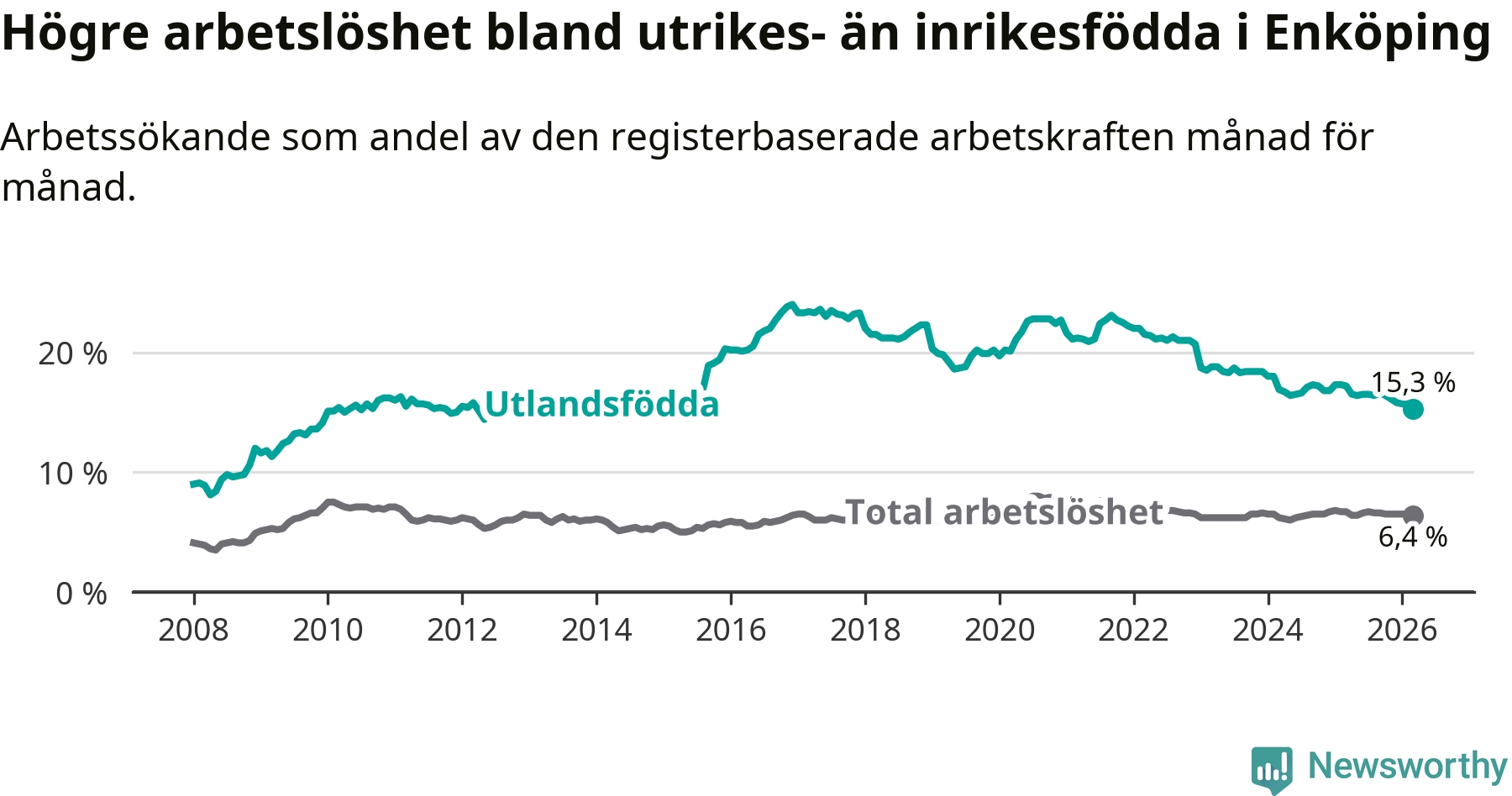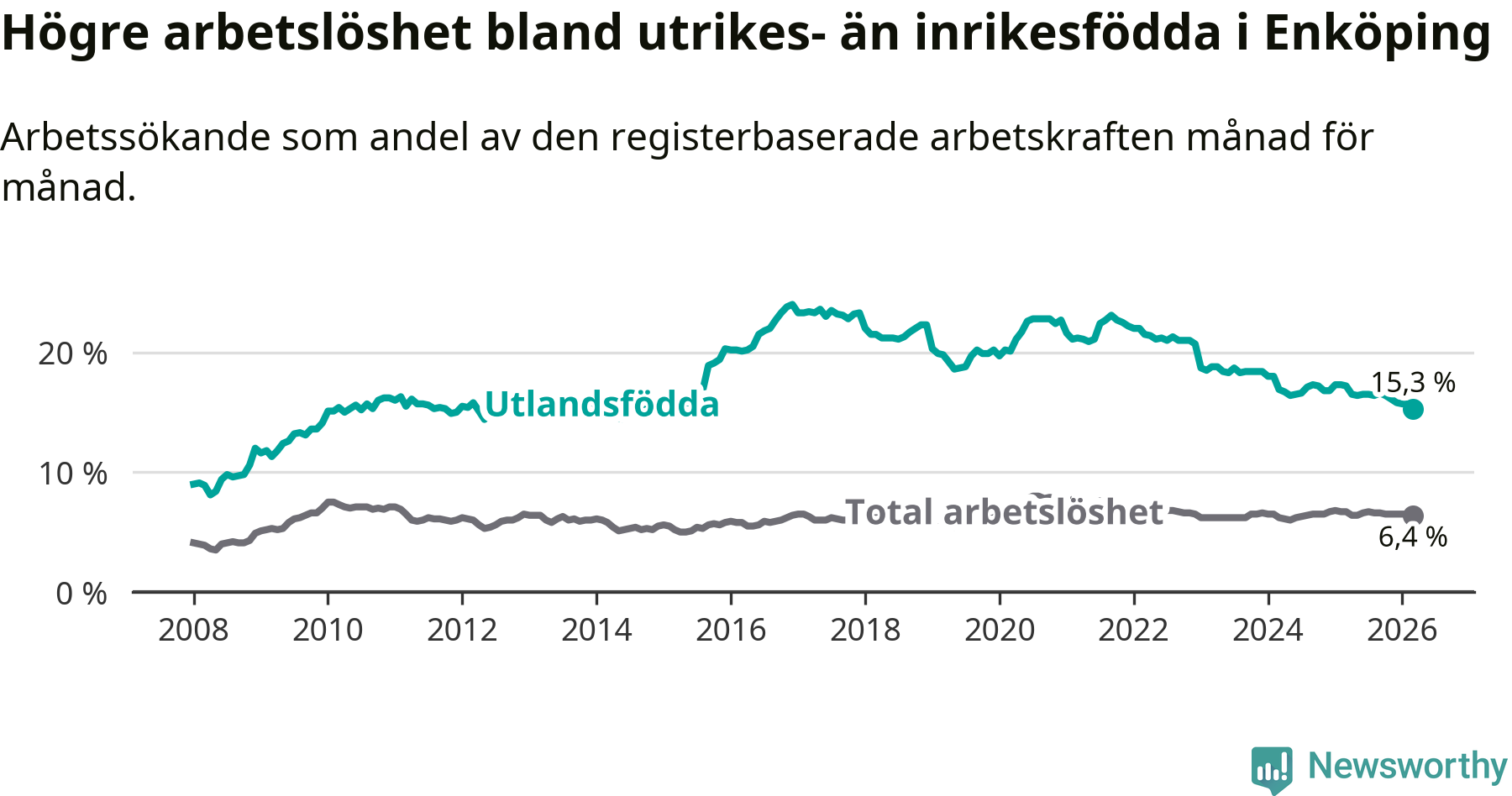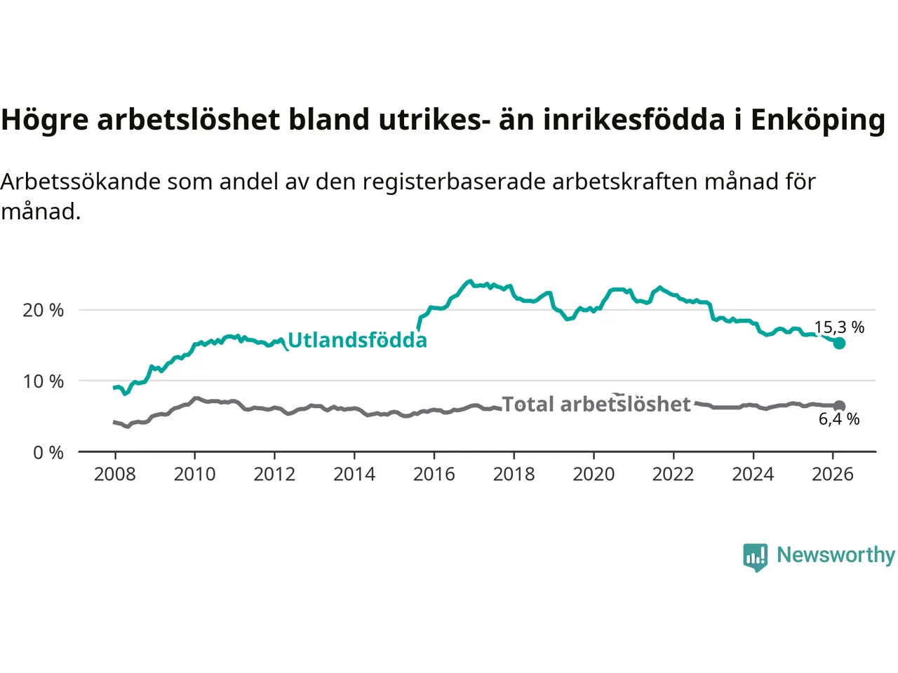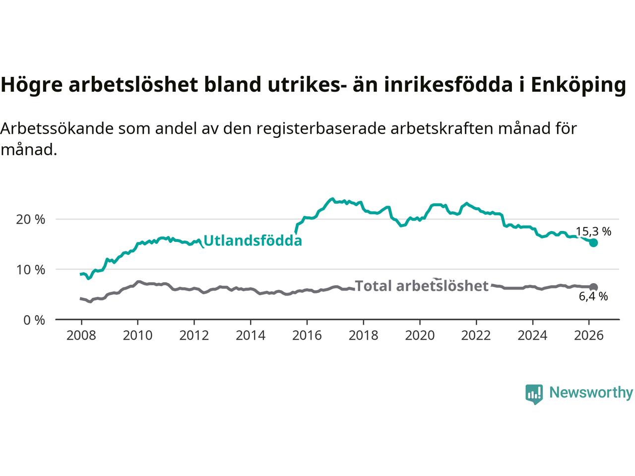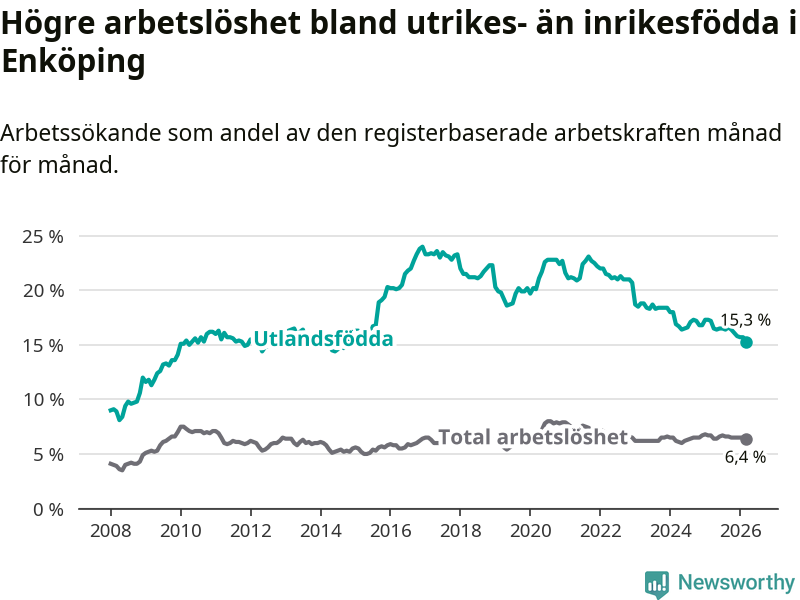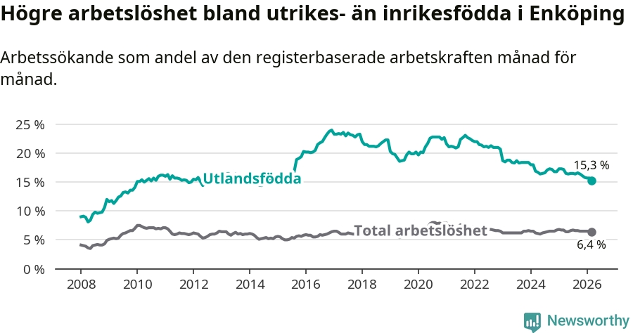 Arbetslösheten bland utlandsfödda var 15,3 procent i Enköping under mars månad, motsvarande 767 av 5 013 personer. Det är 1,9 procentenheter färre än vid samma tidpunkt i fjol (−79 om man räknar personer). Därmed är de utlandsföddas arbetslöshet lägre än vid samma tidpunkt i fjol för nionde månaden i följd. Sedan juni 2025 har arbetslösheten bland utlandsfödda minskat från 16,5 till 15,3 procent. Den nuvarande arbetslöshetsnivån är den lägsta sedan oktober 2014.