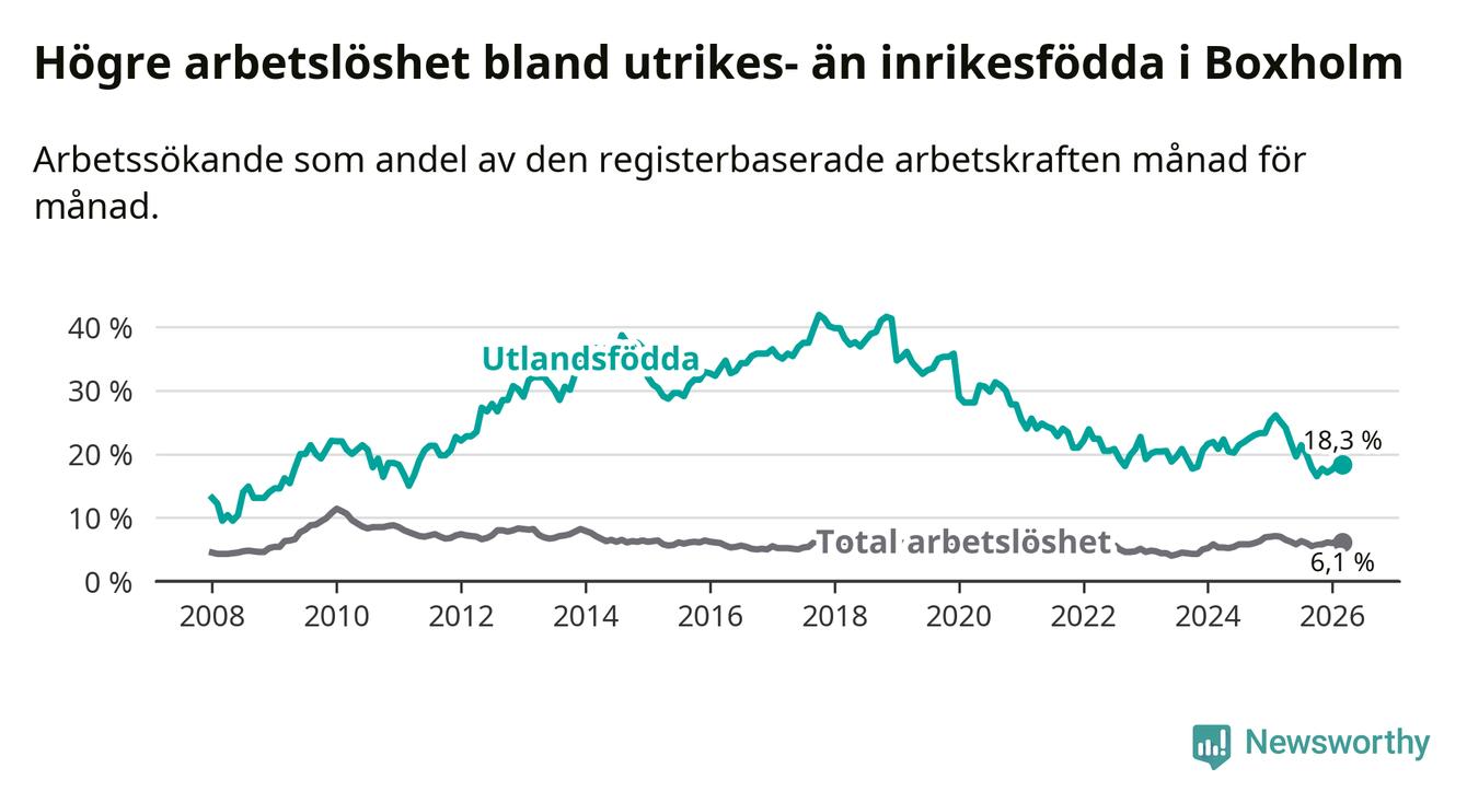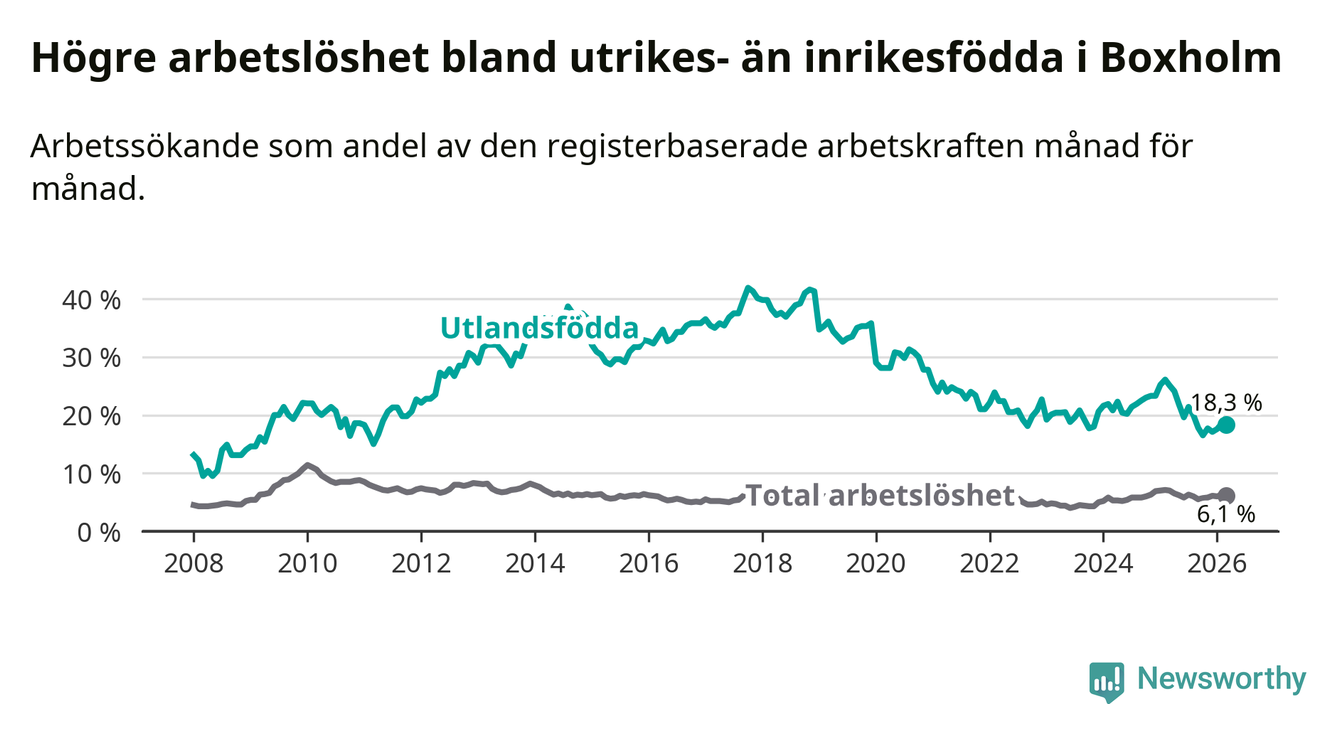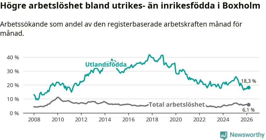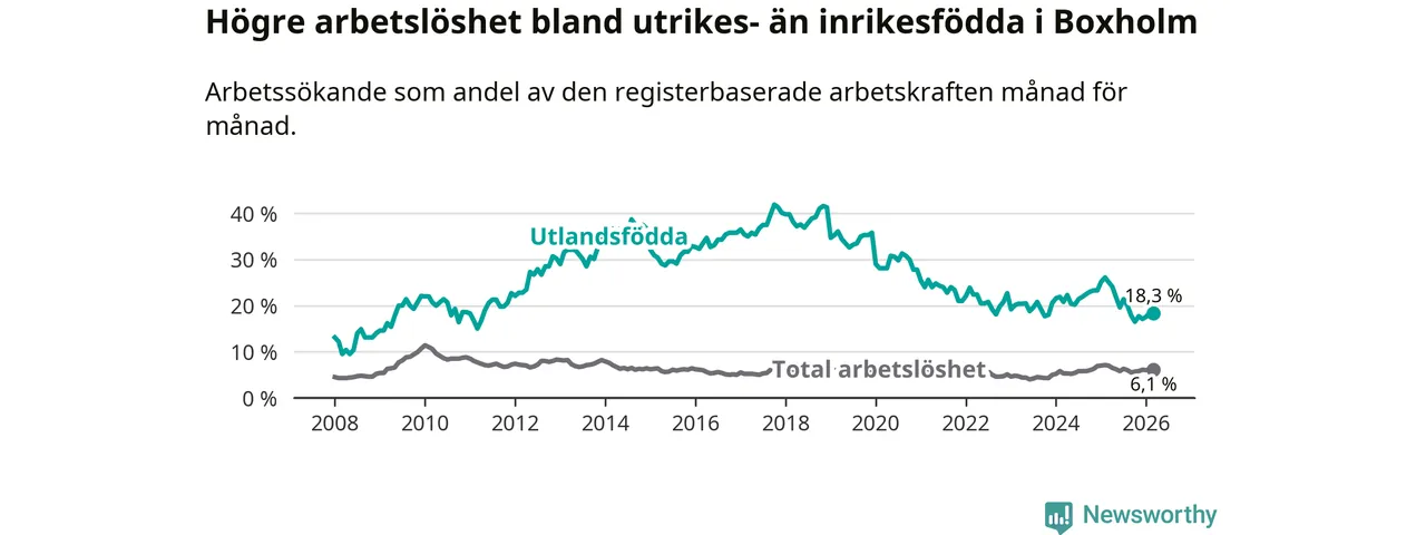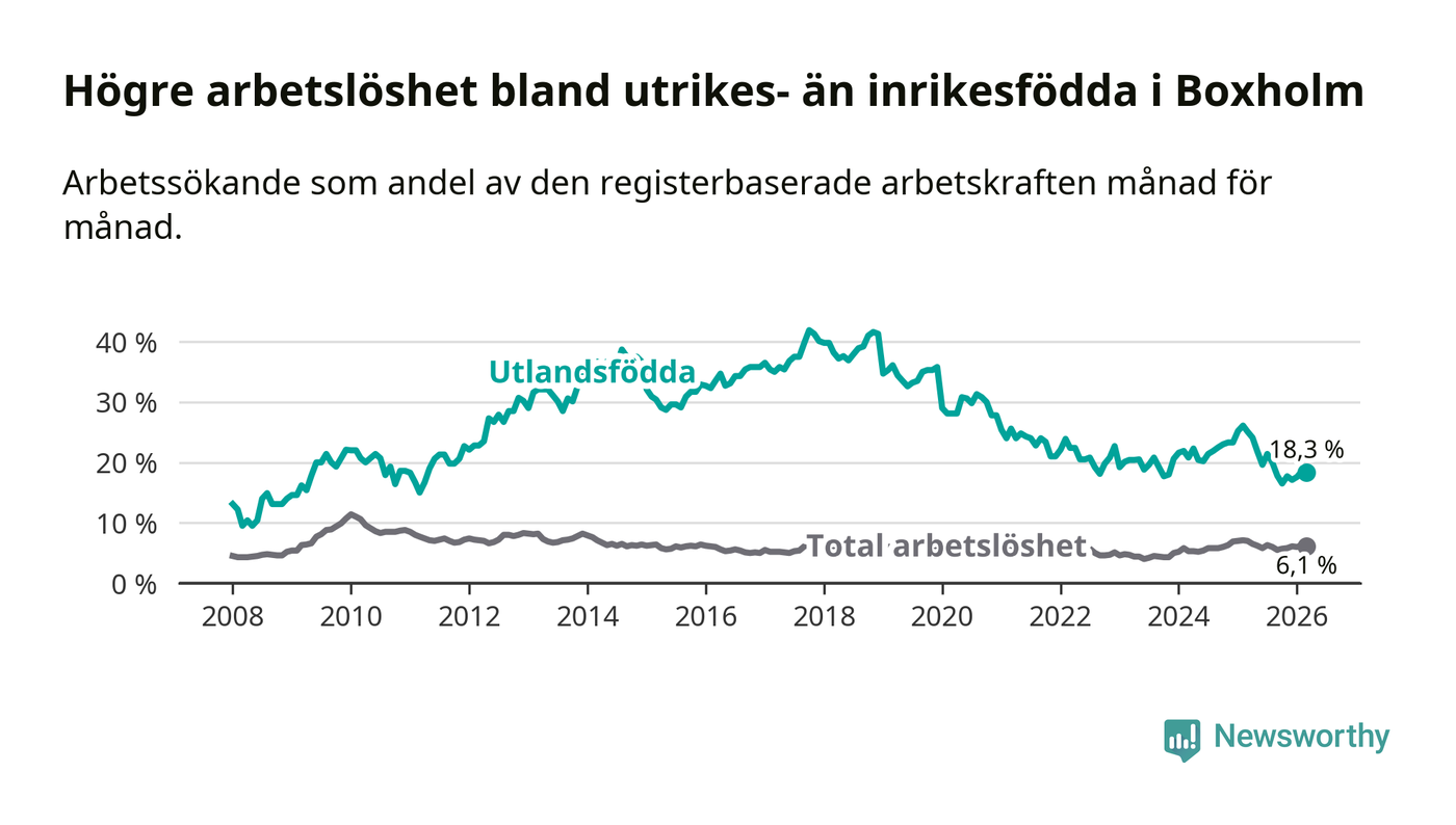 Arbetslösheten bland utlandsfödda var 18,3 procent i Boxholm under mars månad, motsvarande 59 av 322 personer. Det är 6,8 procentenheter färre än vid samma tidpunkt i fjol (−20 om man räknar personer). Därmed är de utlandsföddas arbetslöshet lägre än vid samma tidpunkt i fjol för åttonde månaden i följd. Sedan juli 2025 har arbetslösheten bland utlandsfödda minskat från 21,4 till 18,3 procent.