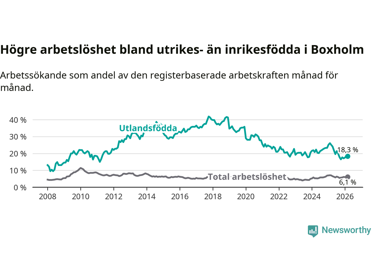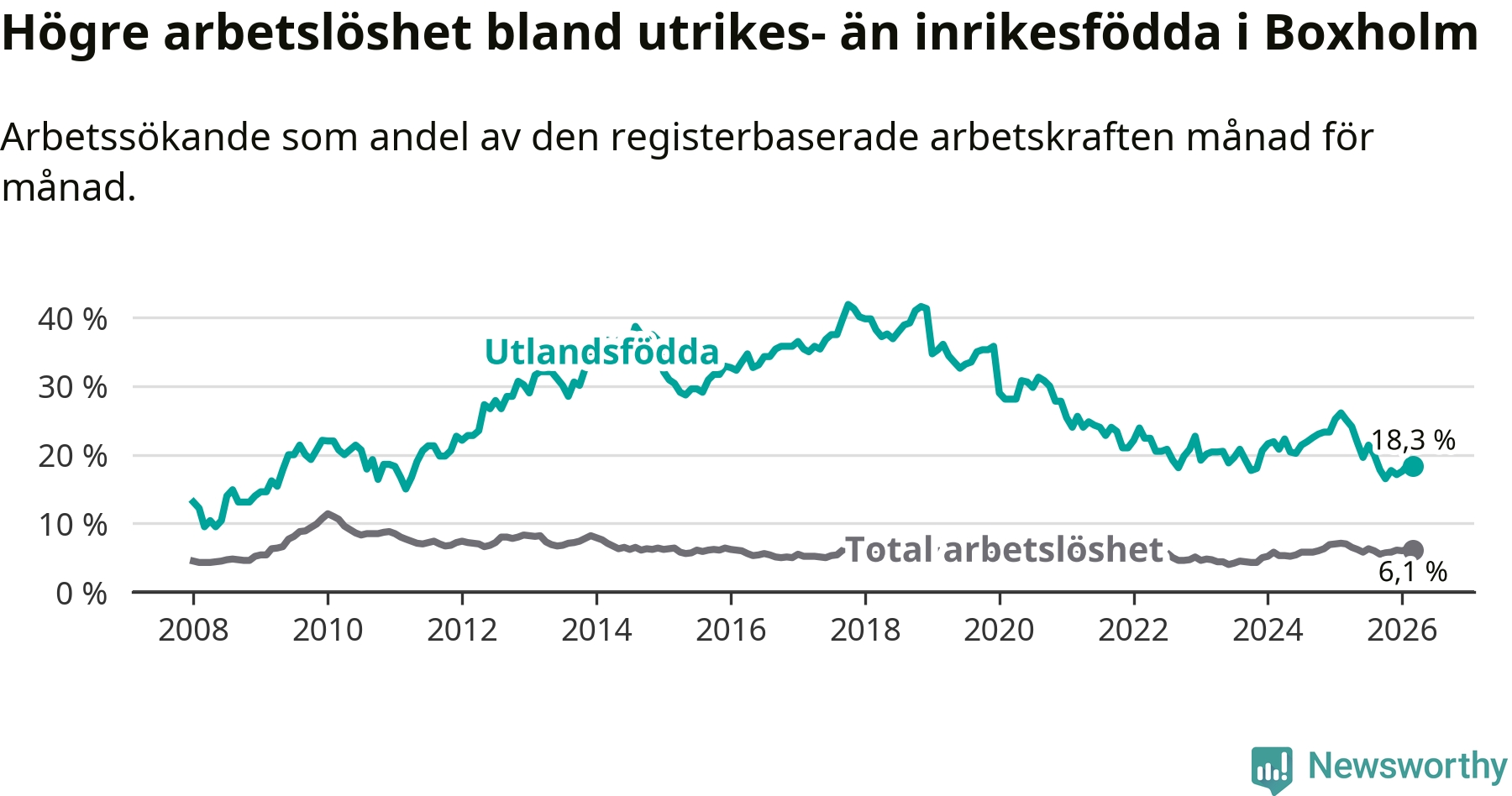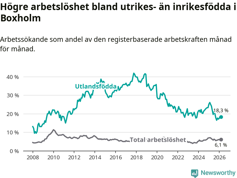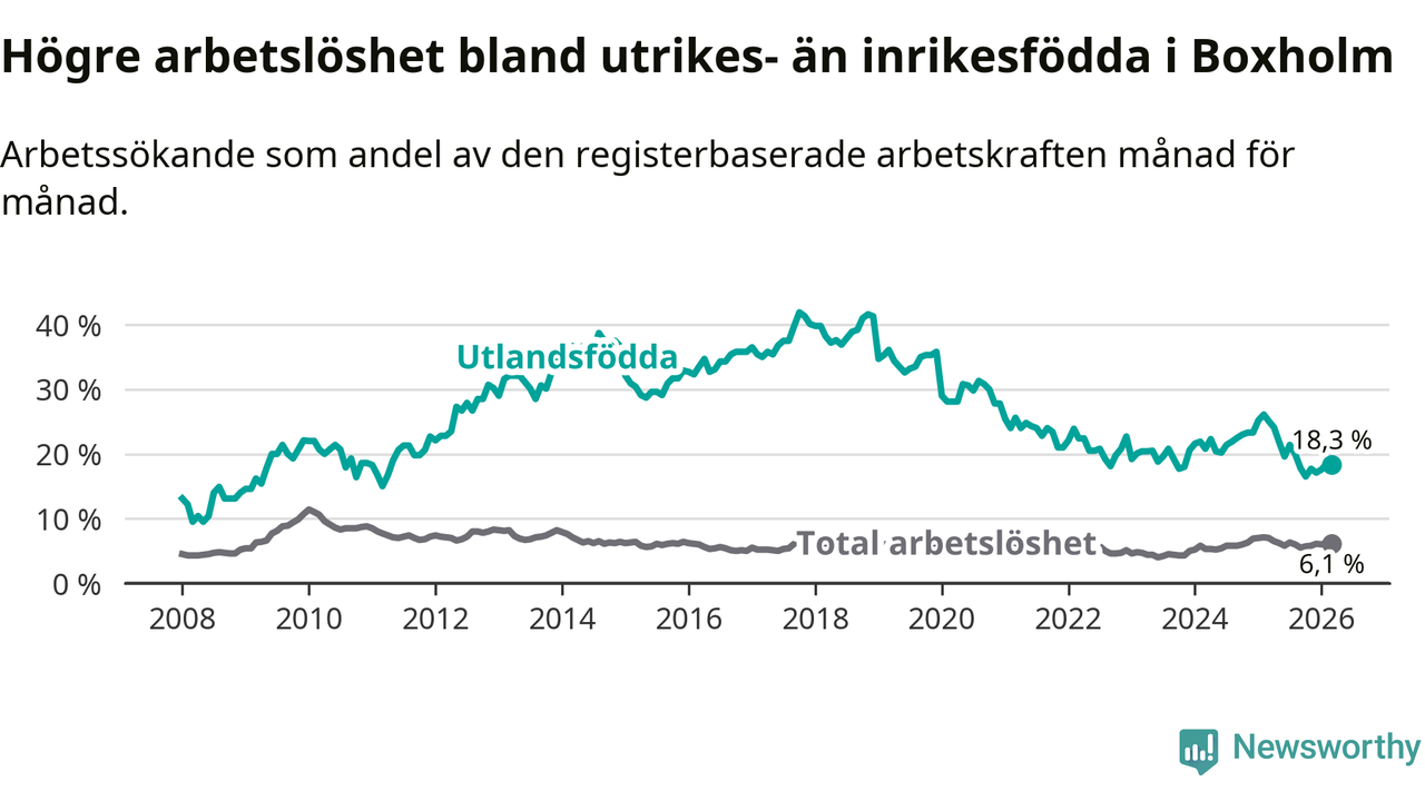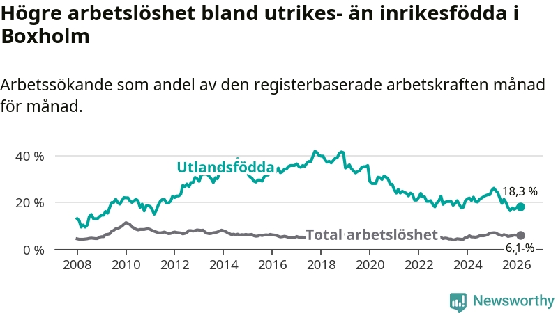 Arbetslösheten bland utlandsfödda var 18,3 procent i Boxholm under mars månad, motsvarande 59 av 322 personer. Det är 6,8 procentenheter färre än vid samma tidpunkt i fjol (−20 om man räknar personer). Därmed är de utlandsföddas arbetslöshet lägre än vid samma tidpunkt i fjol för åttonde månaden i följd. Sedan juli 2025 har arbetslösheten bland utlandsfödda minskat från 21,4 till 18,3 procent.