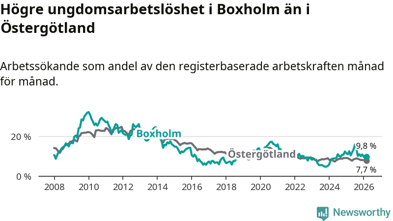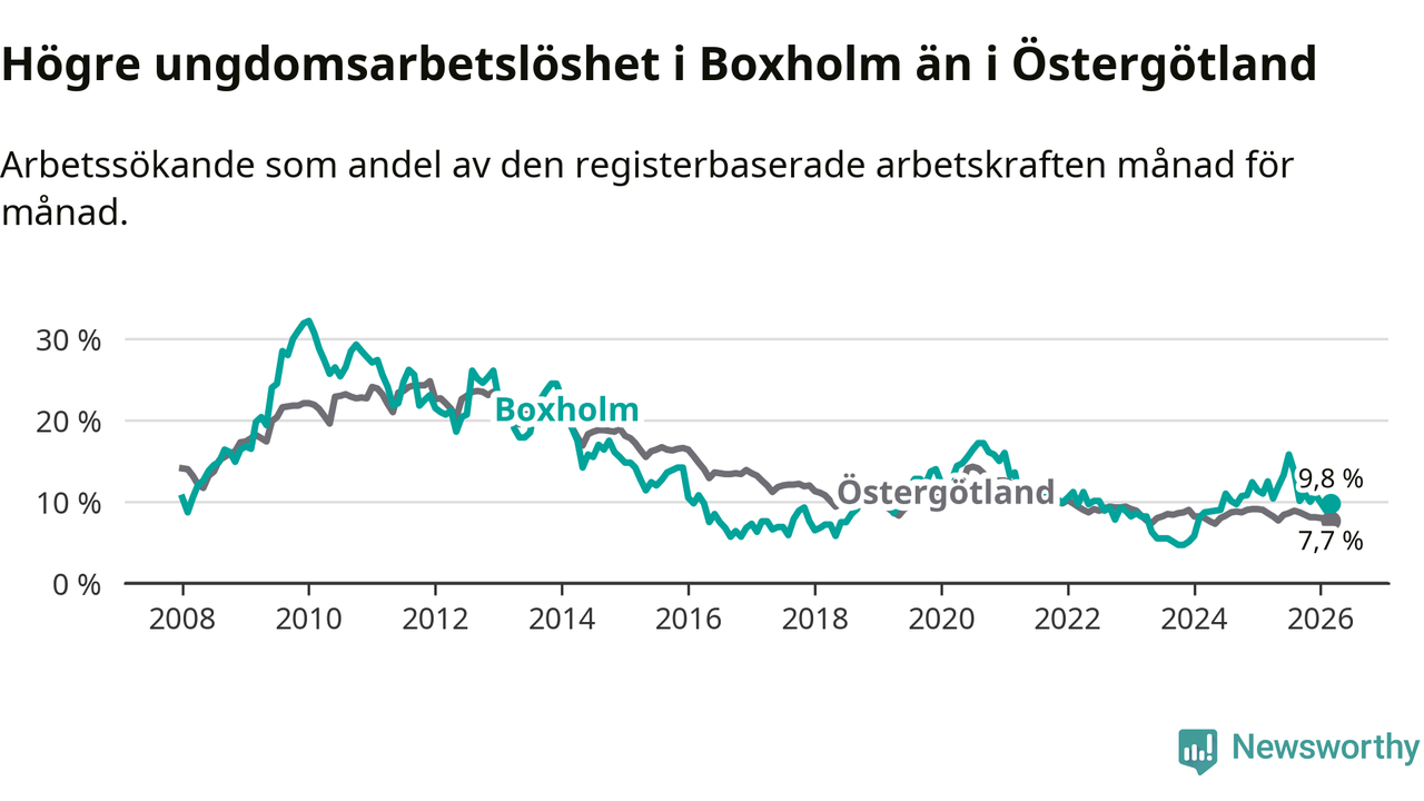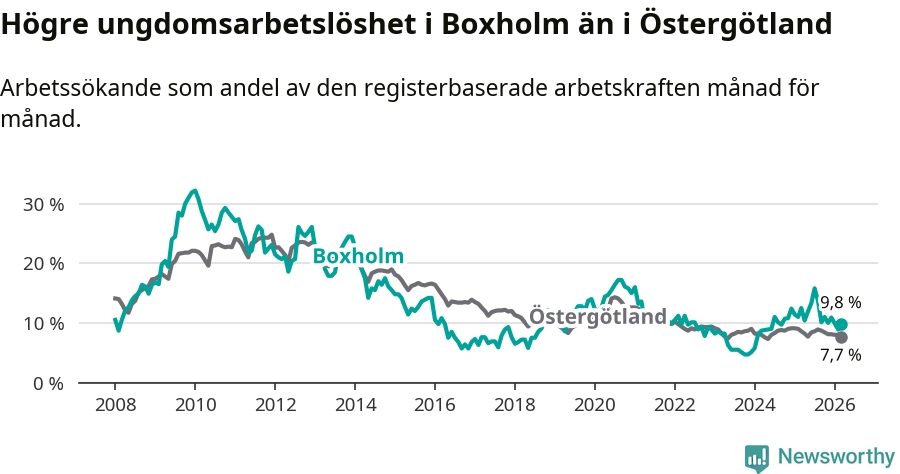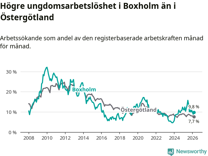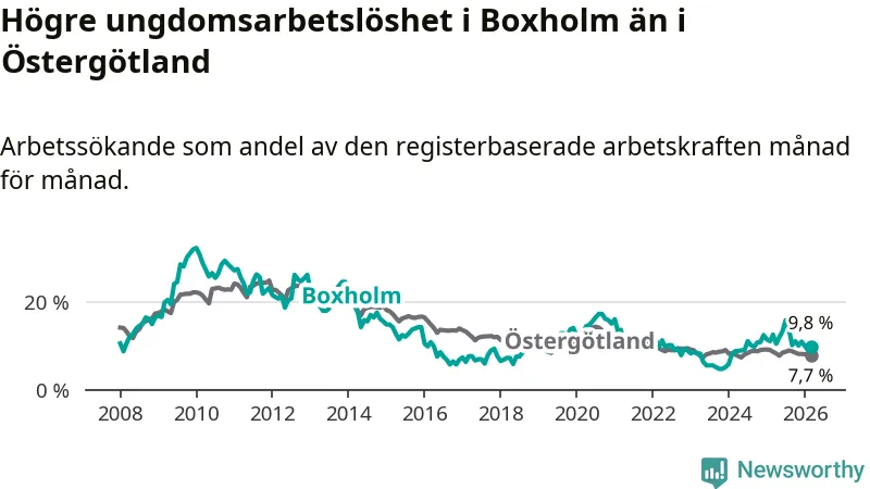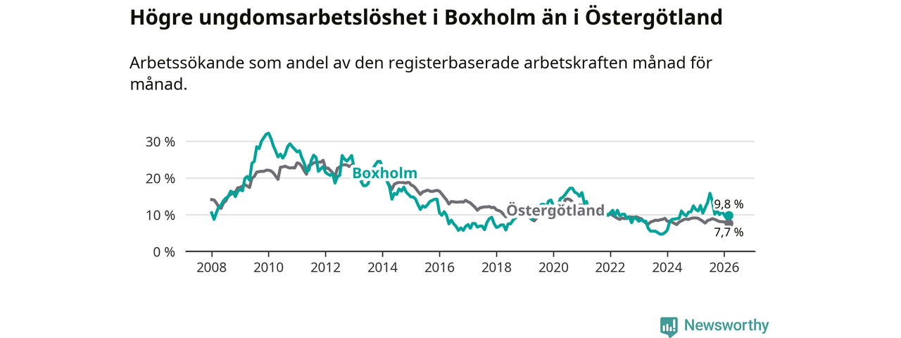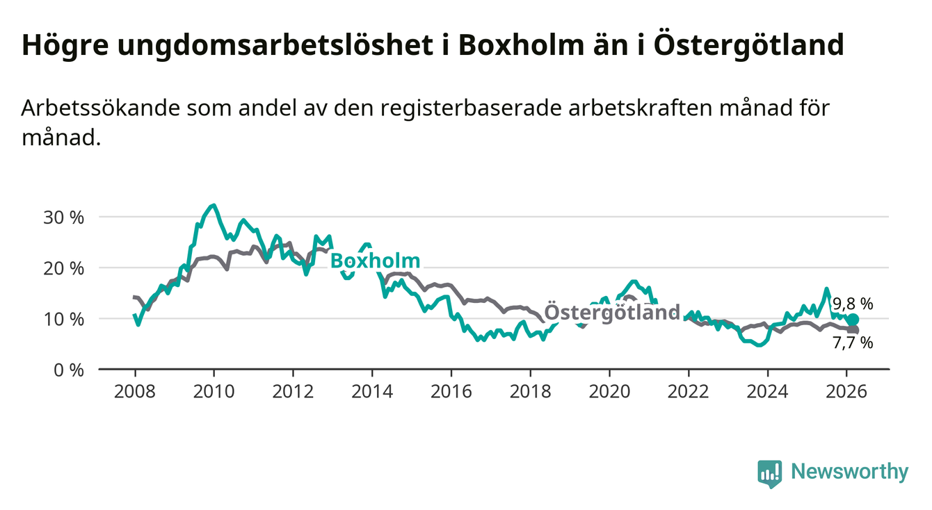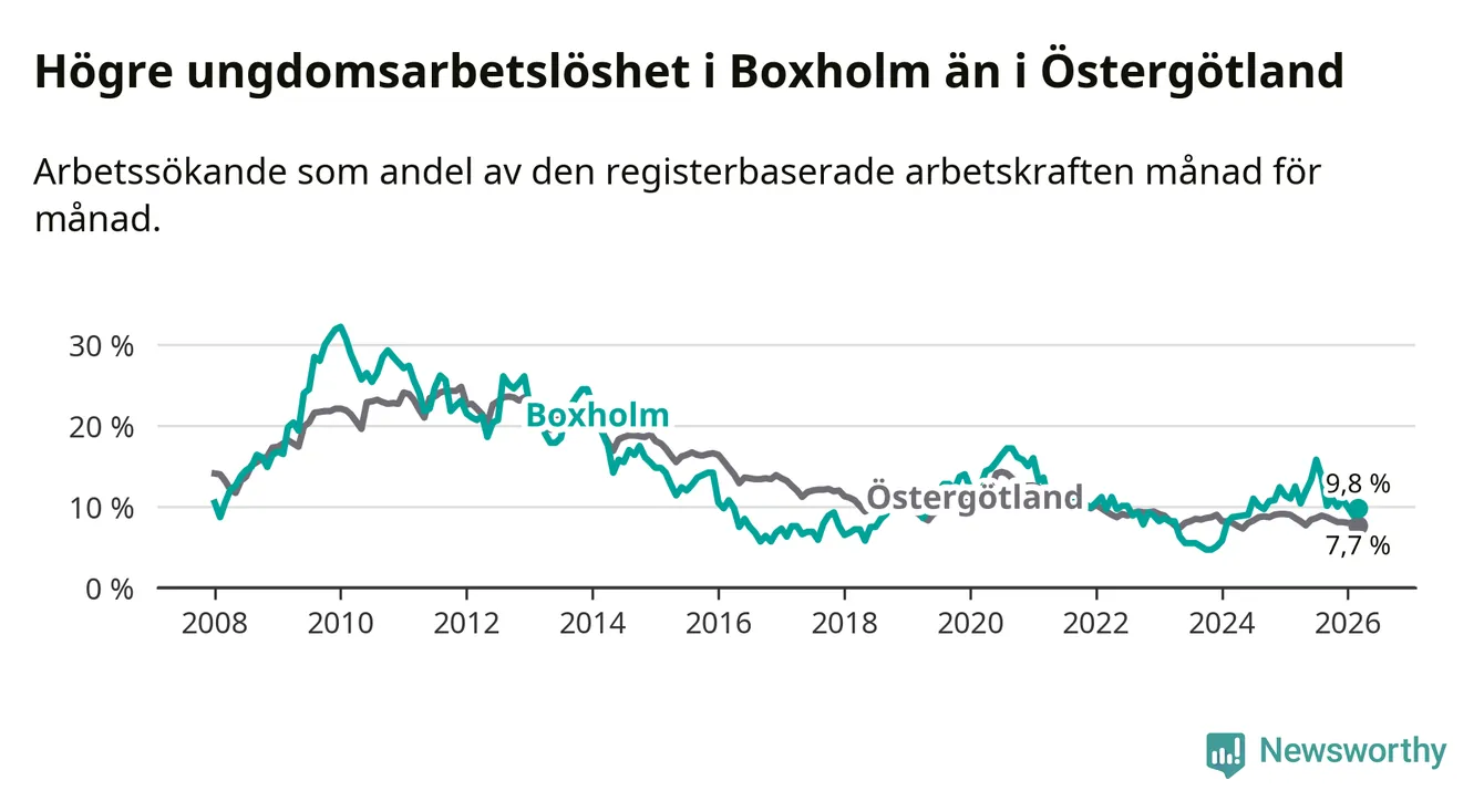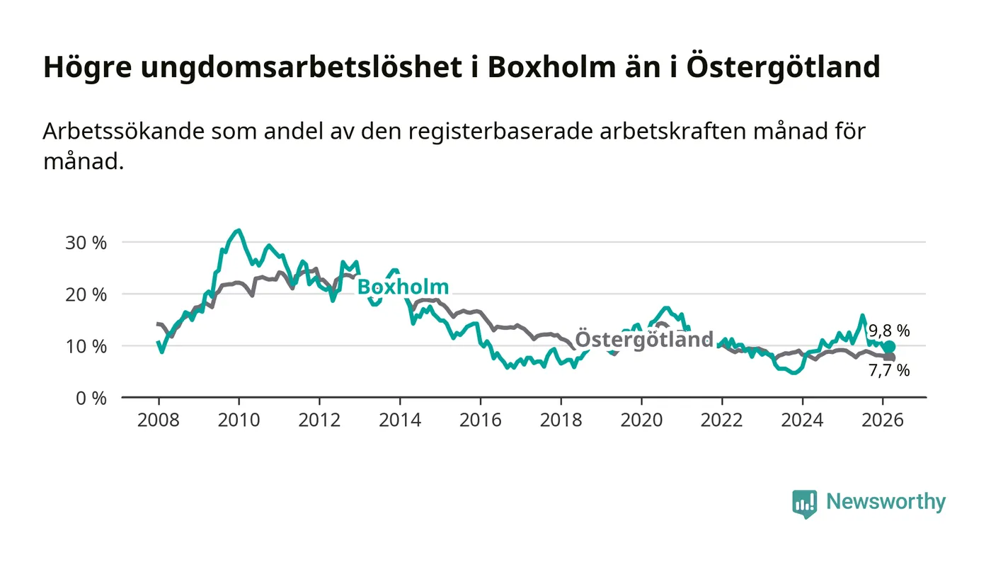 Medan Boxholm har lägre total arbetslöshet än Östergötland, ligger ungdomsarbetslösheten 2,1 procentenheter högre i Boxholm.