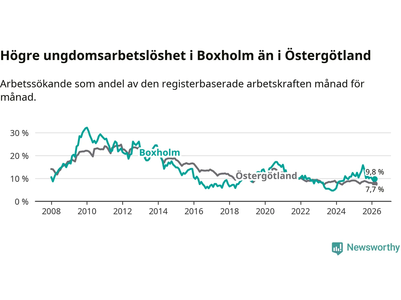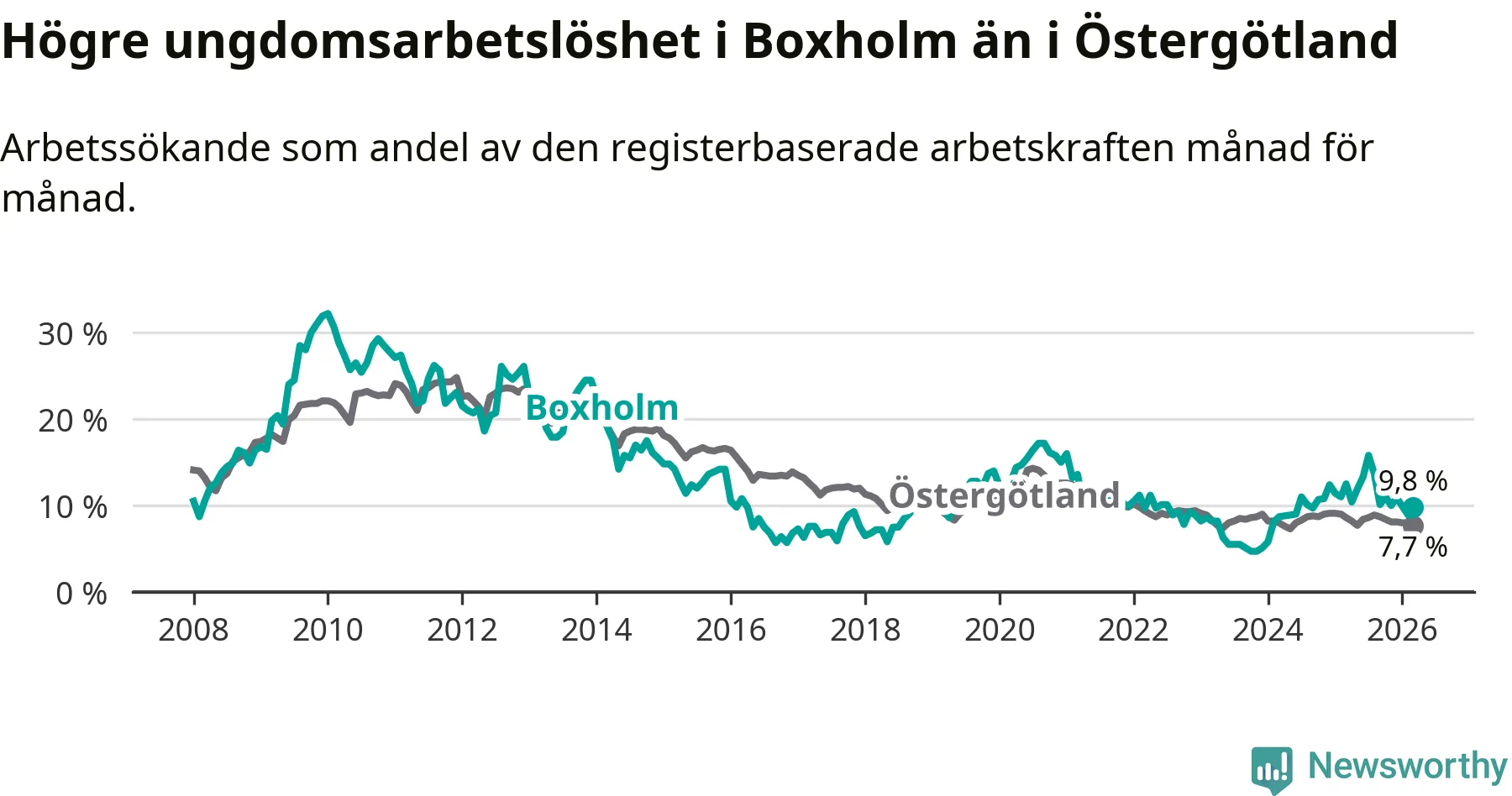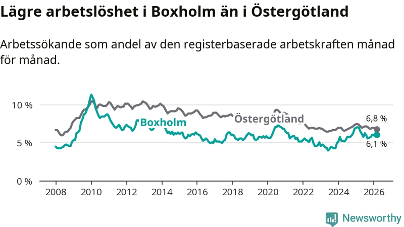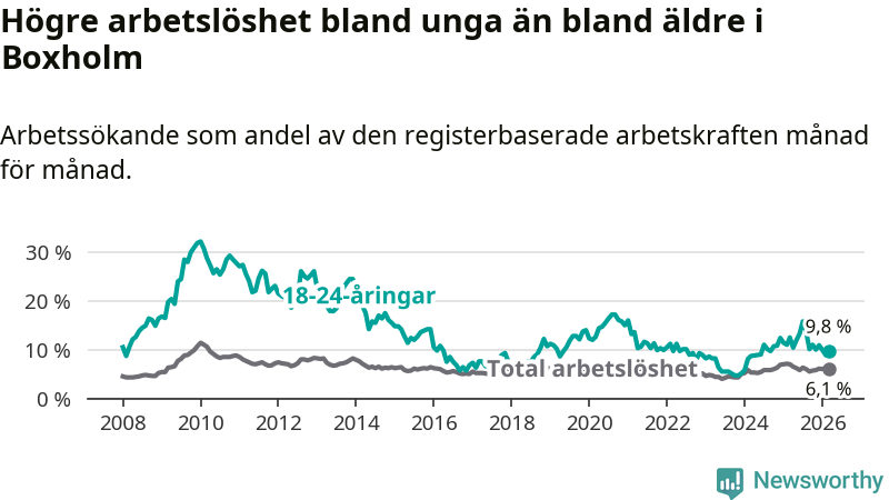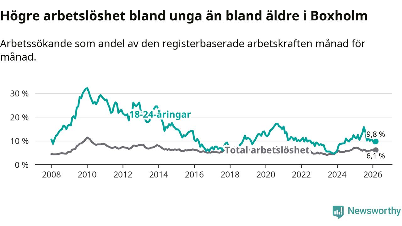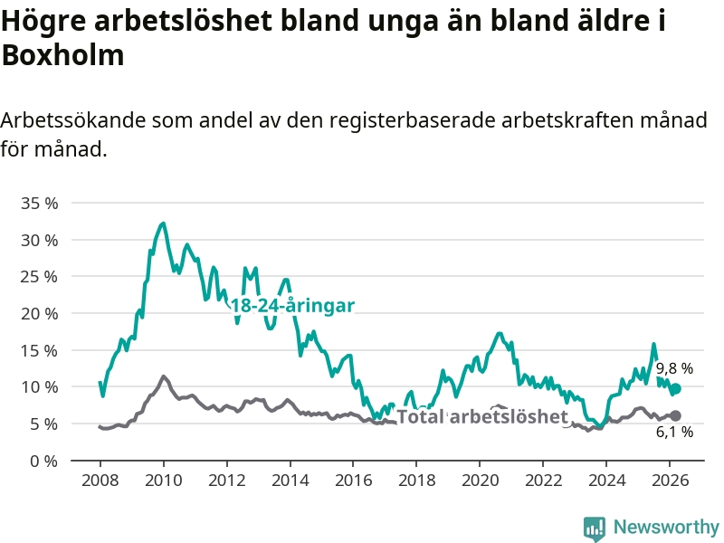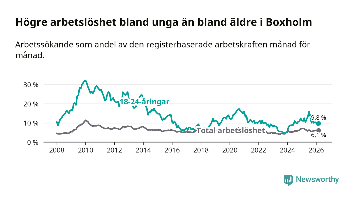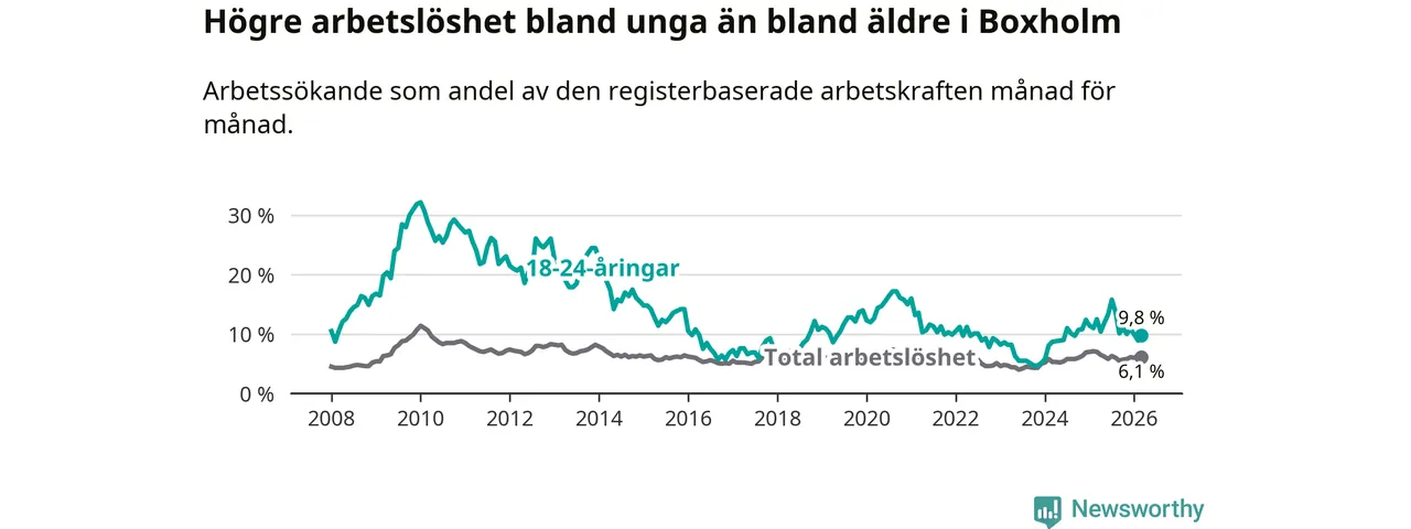 Medan Boxholm har lägre total arbetslöshet än Östergötland, ligger ungdomsarbetslösheten 2,1 procentenheter högre i Boxholm.