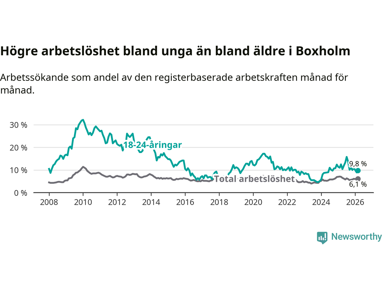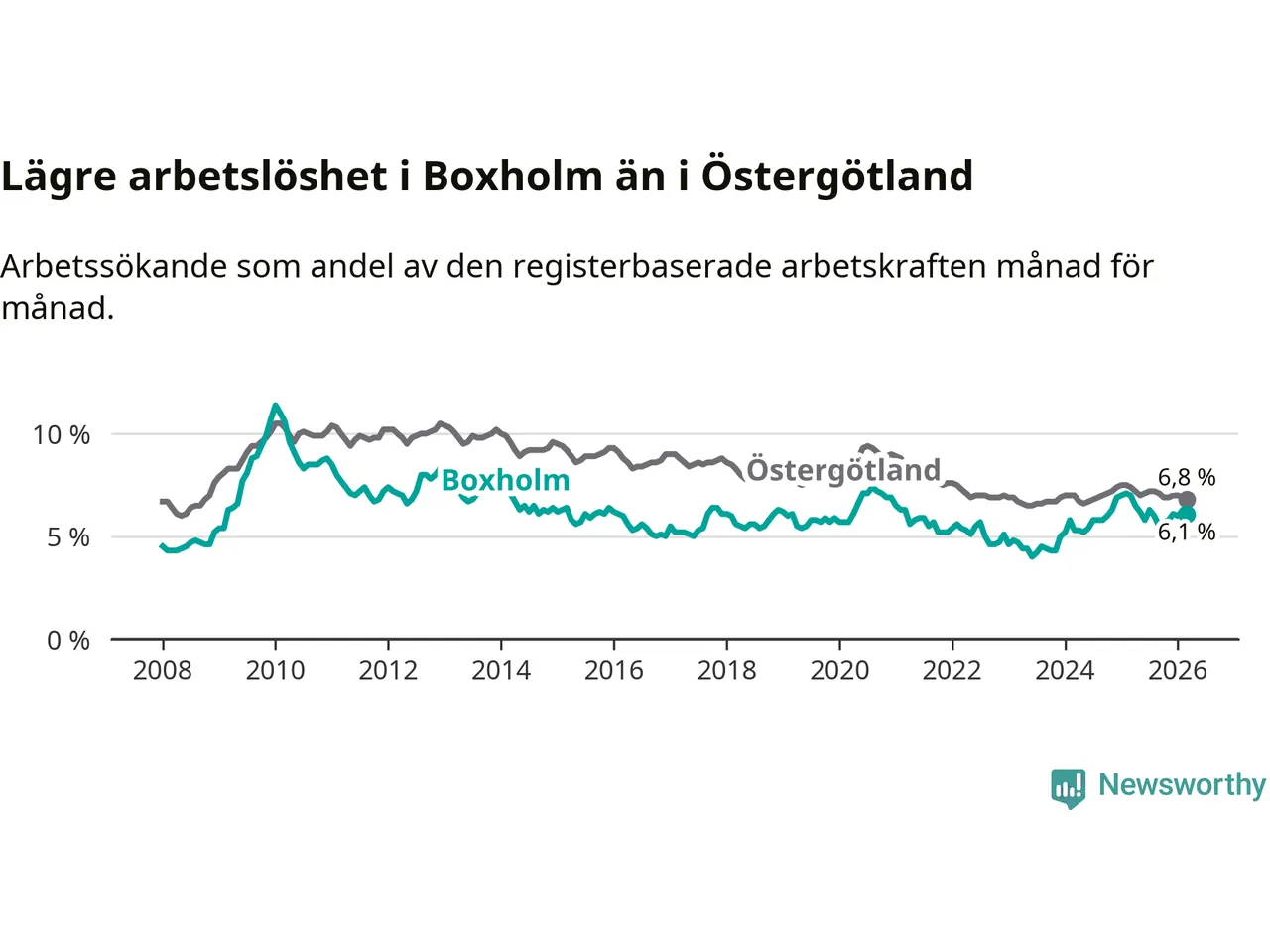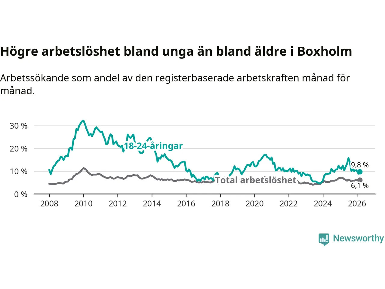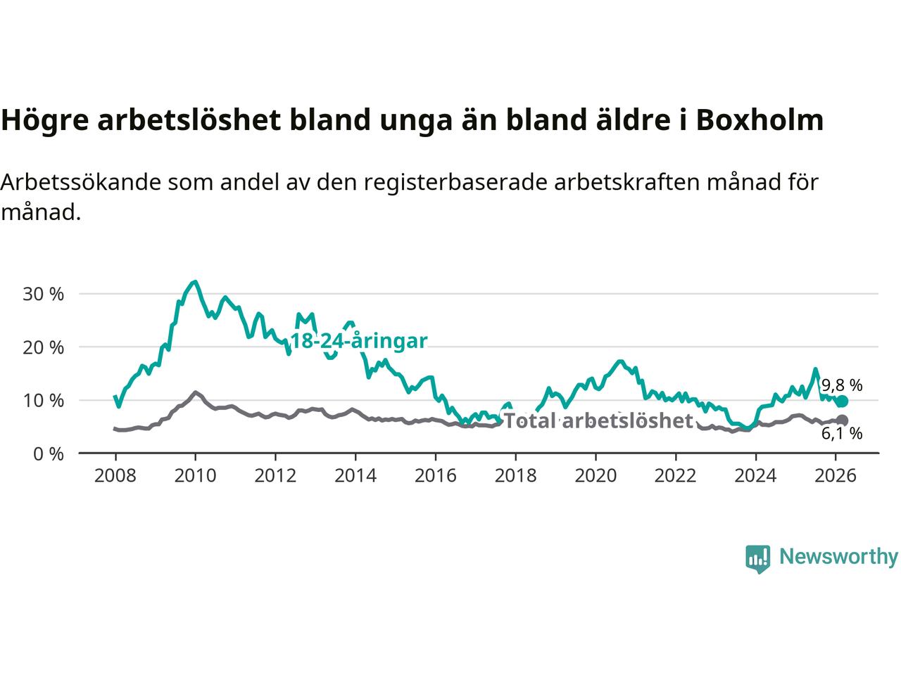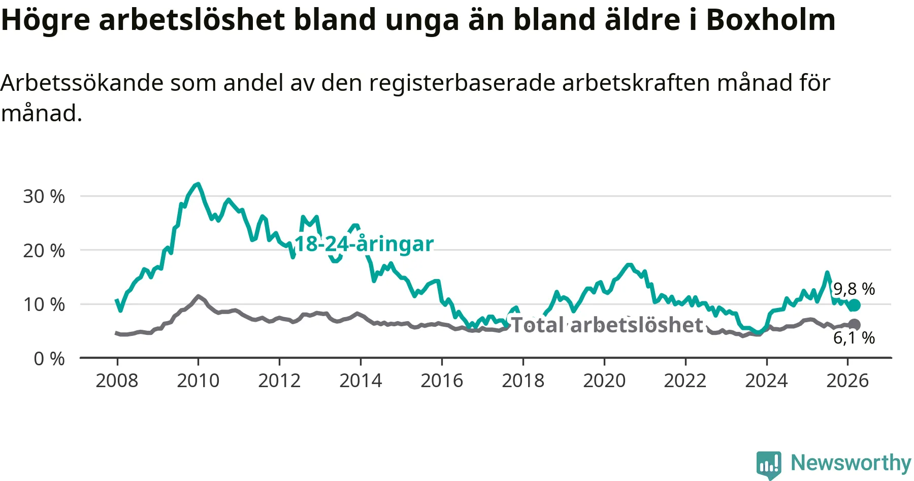Medan Boxholm har lägre total arbetslöshet än Östergötland, ligger ungdomsarbetslösheten 2,1 procentenheter högre i Boxholm.