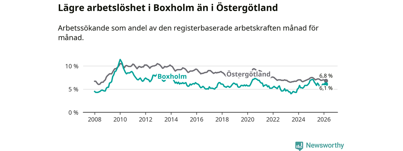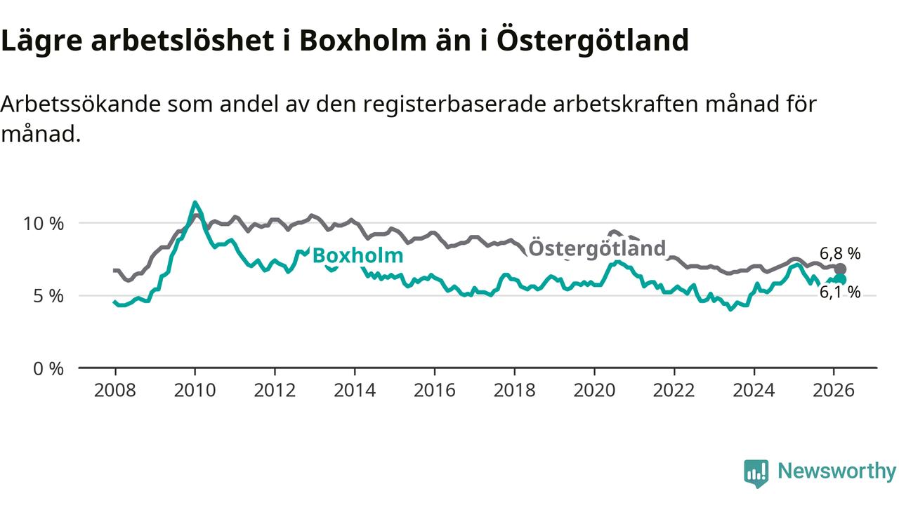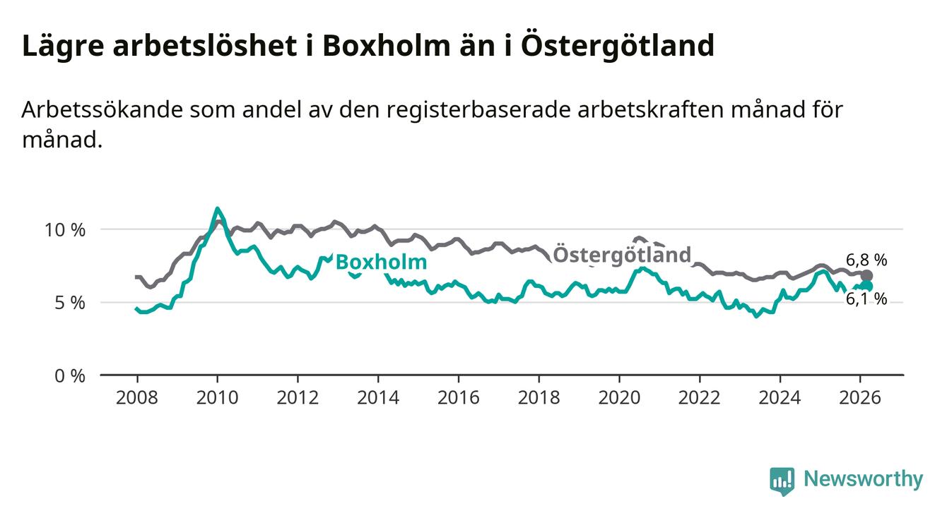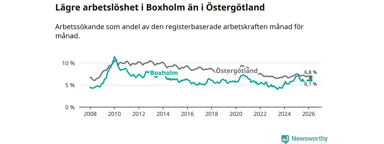 Under mars månad rapporterade Boxholms kommun en total arbetslöshet på 6,1 procent. Det är en minskning jämfört med samma tidpunkt i fjol (−0,9 procentenheter). Även i Östergötlands län sjunker arbetslösheten .