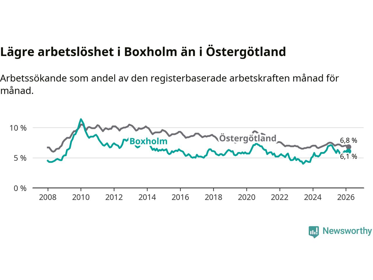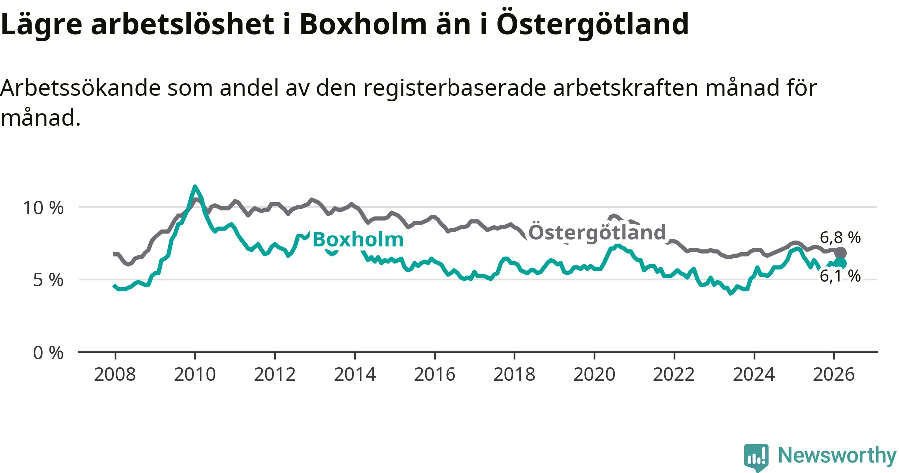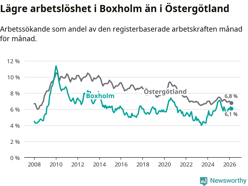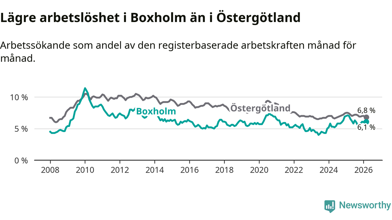 Under mars månad rapporterade Boxholms kommun en total arbetslöshet på 6,1 procent. Det är en minskning jämfört med samma tidpunkt i fjol (−0,9 procentenheter). Även i Östergötlands län sjunker arbetslösheten .