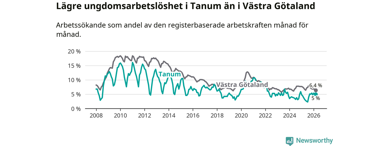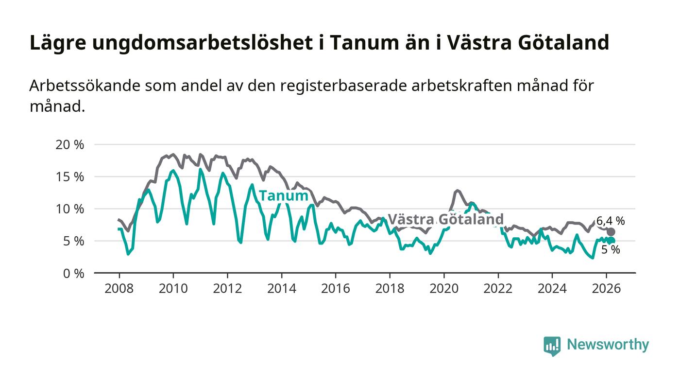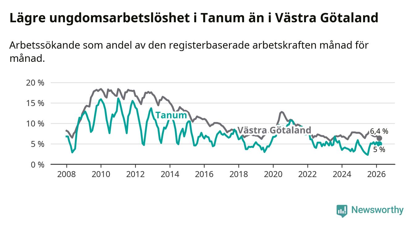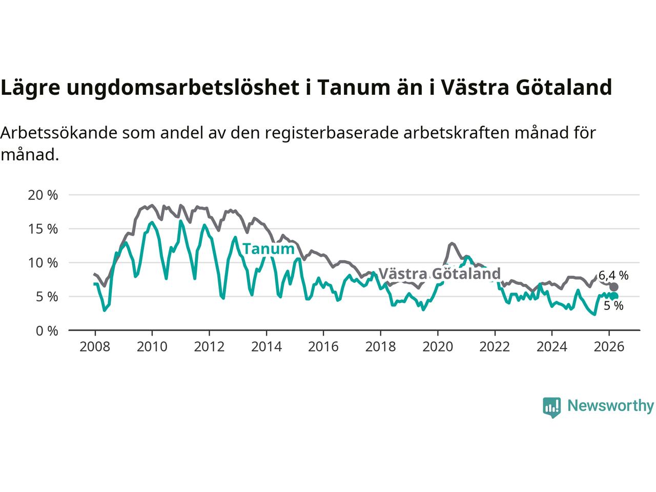 Precis som den totala arbetslösheten ligger ungdomsarbetslösheten i Tanum lägre än i Västra Götaland som helhet. Skillnaden mellan kommunen och länet är 1,4 procentenheter.