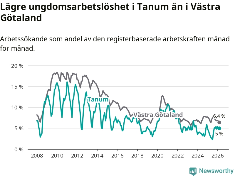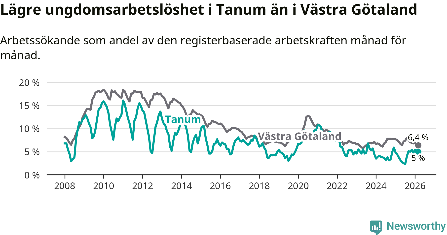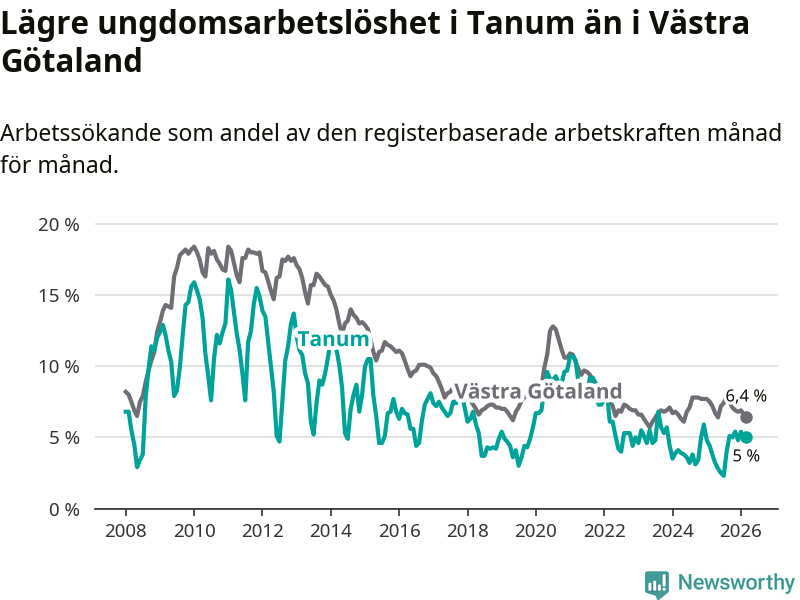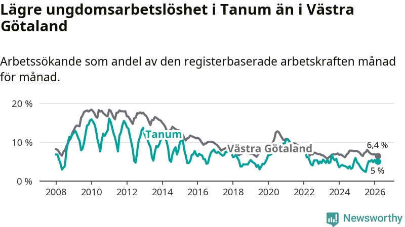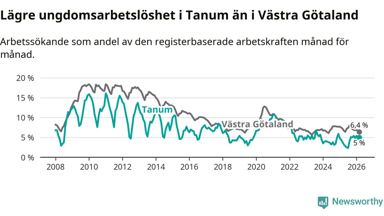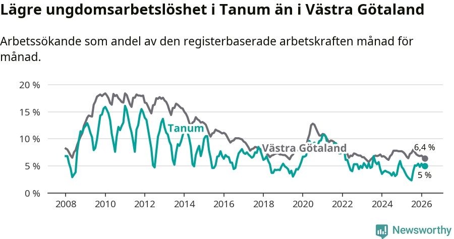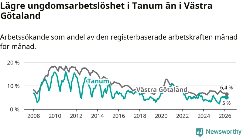 Precis som den totala arbetslösheten ligger ungdomsarbetslösheten i Tanum lägre än i Västra Götaland som helhet. Skillnaden mellan kommunen och länet är 1,4 procentenheter.